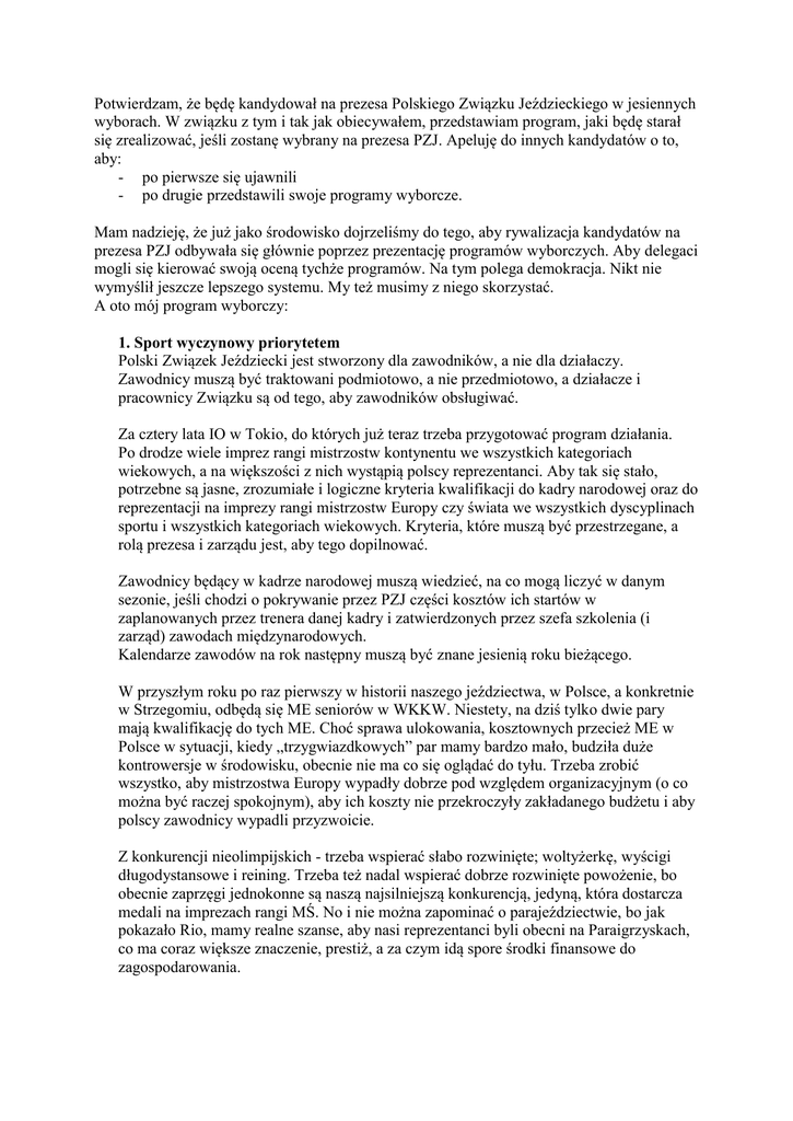 Potwierdzam, że będę kandydował na prezesa Polskiego Związku Jeździeckiego w jesiennych wyborach. W związku z tym i tak jak obiecywałem, przedstawiam program, jaki będę starał się zrealizować, jeśli zostanę wybrany na prezesa PZJ. Apeluję do innych kandydatów o to, aby: - po pierwsze się ujawnili - po drugie przedstawili swoje programy wyborcze. Mam nadzieję, że już jako środowisko dojrzeliśmy do tego, aby rywalizacja kandydatów na prezesa PZJ odbywała się głównie poprzez prezentację programów wyborczych. Aby delegaci mogli się kierować swoją oceną tychże programów. Na tym polega demokracja. Nikt nie wymyślił jeszcze lepszego systemu. My też musimy z niego skorzystać. A oto mój program wyborczy: 1. Sport wyczynowy priorytetem Polski Związek Jeździecki jest stworzony dla zawodników, a nie dla działaczy. Zawodnicy muszą być traktowani podmiotowo, a nie przedmiotowo, a działacze i pracownicy Związku są od tego, aby zawodników obsługiwać. Za cztery lata IO w Tokio, do których już teraz trzeba przygotować program działania. Po drodze wiele imprez rangi mistrzostw kontynentu we wszystkich kategoriach wiekowych, a na większości z nich wystąpią polscy reprezentanci. Aby tak się stało, potrzebne są jasne, zrozumiałe i logiczne kryteria kwalifikacji do kadry narodowej oraz do reprezentacji na imprezy rangi mistrzostw Europy czy świata we wszystkich dyscyplinach sportu i wszystkich kategoriach wiekowych. Kryteria, które muszą być przestrzegane, a rolą prezesa i zarządu jest, aby tego dopilnować. Zawodnicy będący w kadrze narodowej muszą wiedzieć, na co mogą liczyć w danym sezonie, jeśli chodzi o pokrywanie przez PZJ części kosztów ich startów w zaplanowanych przez trenera danej kadry i zatwierdzonych przez szefa szkolenia (i zarząd) zawodach międzynarodowych. Kalendarze zawodów na rok następny muszą być znane jesienią roku bieżącego. W przyszłym roku po raz pierwszy w historii naszego jeździectwa, w Polsce, a konkretnie w Strzegomiu, odbędą się ME seniorów w WKKW. Niestety, na dziś tylko dwie pary mają kwalifikację do tych ME. Choć sprawa ulokowania, kosztownych przecież ME w Polsce w sytuacji, kiedy „trzygwiazdkowych” par mamy bardzo mało, budziła duże kontrowersje w środowisku, obecnie nie ma co się oglądać do tyłu. Trzeba zrobić wszystko, aby mistrzostwa Europy wypadły dobrze pod względem organizacyjnym (o co można być raczej spokojnym), aby ich koszty nie przekroczyły zakładanego budżetu i aby polscy zawodnicy wypadli przyzwoicie. Z konkurencji nieolimpijskich - trzeba wspierać słabo rozwinięte; woltyżerkę, wyścigi długodystansowe i reining. Trzeba też nadal wspierać dobrze rozwinięte powożenie, bo obecnie zaprzęgi jednokonne są naszą najsilniejszą konkurencją, jedyną, która dostarcza medali na imprezach rangi MŚ. No i nie można zapominać o parajeździectwie, bo jak pokazało Rio, mamy realne szanse, aby nasi reprezentanci byli obecni na Paraigrzyskach, co ma coraz większe znaczenie, prestiż, a za czym idą spore środki finansowe do zagospodarowania. 2. Usprawnić mechanizm Bardzo ważnym zadaniem jest zadbanie o to, aby sprawnie funkcjonowało biuro PZJ. Należy rozpisać konkurs na sekretarza generalnego, którego jednym z zadań jest nadzorowanie pracy ludzi zatrudnionych w biurze, gdyż obecny nie potrafi tego robić i się nie nadaje na to stanowisko. Potrzebne będzie też rozpisanie konkursu na stanowisko szefa wyszkolenia, czy jak kto woli - dyrektora sportowego. Potrzebna jest dalsza profesjonalizacja w zarządzaniu konkurencjami sportowymi. Warto wzorować się na FEI, jeśli chodzi o zarządzanie poszczególnymi konkurencjami jeździeckimi pod względem administracyjnym, a także na innych związkach sportowych jeśli chodzi o rolę trenerów zatrudnianych przez te związki w prowadzeniu kadr (seniorów, młodzieżowych, juniorów i innych) i odpowiedzialność za decyzje czysto sportowe, czyli przede wszystkim wybór reprezentacji na imprezę główną. Związek sportowy nie może w sprawach czysto sportowych bazować na pracy społecznej działaczy, czy na pracy quasi-zawodowców, czyli menedżerów. Trzeba dążyć do tego (w pierwszej kolejności w konkurencjach olimpijskich), aby władzę, a co za tym idzie odpowiedzialność w sprawach sportowych przekazać w ręce trenerów zatrudnianych przez PZJ i w ręce szefa wyszkolenia. A kierowanie poszczególnymi konkurencjami pod względem administracyjnym powierzyć wyspecjalizowanych pracownikom biura PZJ, którzy będą pełnić taką rolę w polskim jeździectwie, jak dyrektorzy departamentów w FEI, czyli jak np. John Roche w światowych skokach. Jeśli chodzi o dobre funkcjonowanie biura PZJ, chodzi też o to, aby sprawnie obsługiwało wszystkich, którzy wykupują w PZJ jakąś licencję, paszport, czy inną usługę, aby pracowali tam ludzie kompetentni i na właściwych stanowiskach, aby nie tworzyły się „korki” przy wykupywaniu tychże licencji. Należy przywrócić stacjonarną księgowość. 3. Sprawiedliwie i przejrzyście Równość wobec prawa związkowego, przestrzeganie przepisów i równe traktowanie wszystkich, w tym organizatorów zawodów. Jawność (transparentność) nie może być pustym hasłem, a codziennością, zwłaszcza w kwestii umów zawieranych przez PZJ, pensji trenerów, puli pieniędzy przeznaczanych na poszczególne konkurencje, itp. Do tego obszaru należy zaliczyć bardzo ważne zadanie - rugowanie z życia naszego środowiska wszechobecnego w nim konfliktu interesów. 4. Finanse Wpływy do kasy PZJ pochodzą z trzech źródeł: dotacje z ministerstwa sportu, opłaty od członków oraz pieniądze od sponsorów. O ile zarząd PZJ w ograniczonym stopniu może wpływać na poziom wpływów z dwóch pierwszych źródeł, o tyle bardzo istotną rolą zarządu i prezesa jest aktywność w trzecim obszarze - pozyskiwanie pieniędzy od sponsorów. Licz