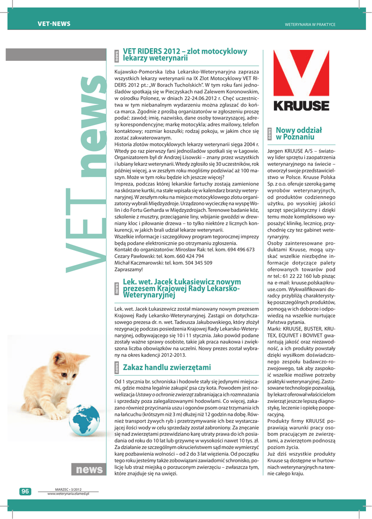 VETNEWS VET RIDERS 2012 – zlot motocyklowy lekarzy weterynarii news VET news Kujawsko-Pomorska Izba Lekarsko-Weterynaryjna zaprasza wszystkich lekarzy weterynarii na IX Zlot Motocyklowy VET RIDERS 2012 pt.: „W Borach Tucholskich”. W tym roku fani jednośladów spotkają się w Pieczyskach nad Zalewem Koronowskim, w ośrodku Polonez, w dniach 22-24.06.2012 r. Chęć uczestnictwa w tym niebanalnym wydarzeniu można zgłaszać do końca marca. Zgodnie z prośbą organizatorów w zgłoszeniu proszę podać: zawód; imię, nazwisko, dane osoby towarzyszącej, adresy korespondencyjne; markę motocykla; adres mailowy, telefon kontaktowy; rozmiar koszulki; rodzaj pokoju, w jakim chce się zostać zakwaterowanym. Historia zlotów motocyklowych lekarzy weterynarii sięga 2004 r. Wtedy po raz pierwszy fani jednośladów spotkali się w Łagowie. Organizatorem był dr Andrzej Lisowski – znany przez wszystkich i lubiany lekarz weterynarii. Wtedy zgłosiło się 30 uczestników, rok później więcej, a w zeszłym roku mogliśmy podziwiać aż 100 maszyn. Może w tym roku będzie ich jeszcze więcej? Impreza, podczas której lekarskie fartuchy zostają zamienione na skórzane kurtki, na stałe wpisała się w kalendarz branży weterynaryjnej. W zeszłym roku na miejsce motocyklowego zlotu organizatorzy wybrali Międzyzdroje. Urządzono wycieczkę na wyspę Wolin i do Fortu Gerharda w Międzyzdrojach. Terenowe badanie kóz, szkolenie z musztry, przeciąganie liny, wbijanie gwoździ w drewniany kloc i piłowanie drzewa – to tylko niektóre z licznych konkurencji, w jakich brali udział lekarze weterynarii. Wszelkie informacje i szczegółowy program tegorocznej imprezy będą podane elektronicznie po otrzymaniu zgłoszenia. Kontakt do organizatorów: Mirosław Rak: tel. kom. 694 496 673 Cezary Pawłowski: tel. kom. 660 424 794 Michał Kaczmarowski: tel. kom. 504 345 509 Zapraszamy! Lek. wet. Jacek Łukasiewicz nowym prezesem Krajowej Rady LekarskoWeterynaryjnej news Lek. wet. Jacek Łukaszewicz został mianowany nowym prezesem Krajowej Rady Lekarsko-Weterynaryjnej. Zastąpi on dotychczasowego prezesa dr. n. wet. Tadeusza Jakubowskiego, który złożył rezygnację podczas posiedzenia Krajowej Rady Lekarsko-Weterynaryjnej, odbywającego się 10 i 11 stycznia. Jako powód podane zostały ważne sprawy osobiste, takie jak praca naukowa i zwiększona liczba obowiązków na uczelni. Nowy prezes został wybrany na okres kadencji 2012-2013. news 96 MARZEC • 3/2012 www.weterynaria.elamed.pl Zakaz handlu zwierzętami Od 1 stycznia br. schroniska i hodowle stały się jedynymi miejscami, gdzie można legalnie zakupić psa czy kota. Powodem jest nowelizacja Ustawy o ochronie zwierząt zabraniająca ich rozmnażania i sprzedaży poza zalegalizowanymi hodowlami. Co więcej, zakazano również przycinania uszu i ogonów psom oraz trzymania ich na łańcuchu (krótszym niż 3 m) dłużej niż 12 godzin na dobę. Również transport żywych ryb i przetrzymywanie ich bez wystarczającej ilości wody w celu sprzedaży został zabroniony. Za znęcanie się nad zwierzętami przewidziano karę utraty prawa do ich posiadania od roku do 10 lat lub grzywnę w wysokości nawet 10 tys. zł. Za działanie ze szczególnym okrucieństwem sąd może wymierzyć karę pozbawienia wolności – od 2 do 3 lat więzienia. Od początku tego roku jesteśmy także zobowiązani zawiadomić schronisko, policję lub straż miejską o porzuconym zwierzęciu – zwłaszcza tym, które znajduje się na uwięzi. news news WETERYNARIA W PRAKTYCE Nowy oddział w Poznaniu Jørgen KRUUSE A/S – światowy lider sprzętu i zaopatrzenia weterynaryjnego na świecie – otworzył swoje przedstawicielstwo w Polsce. Kruuse Polska Sp. z o.o. oferuje szeroką gamę wyrobów weterynaryjnych, od produktów codziennego użytku, po wysokiej jakości sprzęt specjalistyczny i dzięki temu może kompleksowo wyposażyć klinikę, lecznicę, przychodnię czy tez gabinet weterynaryjny. Osoby zainteresowane produktami Kruuse, mogą uzyskać wszelkie niezbędne informacje dotyczące palety oferowanych towarów pod nr tel.: 61 22 22 160 lub pisząc na e-mail: [email protected]. Wykwalifikowani doradcy przybliżą charakterystykę poszczególnych produktów, pomogą w ich doborze i odpowiedzą na wszelkie nurtujące Państwa pytania. Marki: KRUUSE, BUSTER, KRUTEX, EQUIVET i BOVIVET gwarantują jakość oraz niezawodność, a ich produkty powstały dzięki wysiłkom doświadczonego zespołu badawczo-rozwojowego, tak aby zaspokoić wszelkie możliwe potrzeby praktyki weterynaryjnej. Zastosowane technologie pozwalają, by lekarz oferował właścicielom zwierząt jeszcze lepszą diagnostykę, leczenie i opiekę pooperacyjną. Produkty firmy KRUUSE poprawiają warunki pracy osobom pracującym ze zwierzętami, a zwierzętom podnoszą poziom życia. Już dziś wszystkie produkty Kruuse są dostępne w hurtowniach weterynaryjnych na terenie całego kraju.