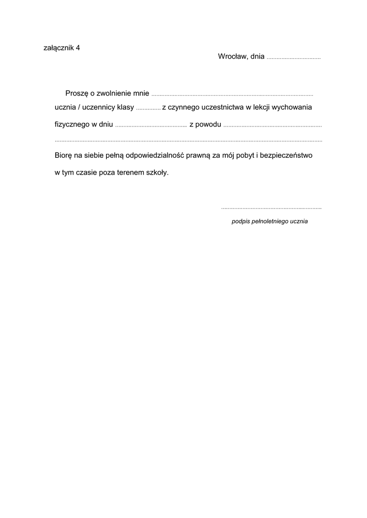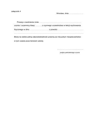 załącznik 4 Wrocław, dnia …………………………… Proszę o zwolnienie mnie …………………………………………………………..…………………………. ucznia / uczennicy klasy …………… z czynnego uczestnictwa w lekcji wychowania fizycznego w dniu …………………………………….. z powodu …………………………………………………… ………………………………………………………………………………………………………………………………………………. Biorę na siebie pełną odpowiedzialność prawną za mój pobyt i bezpieczeństwo w tym czasie poza terenem szkoły. …………………………………………...……….. podpis pełnoletniego ucznia
