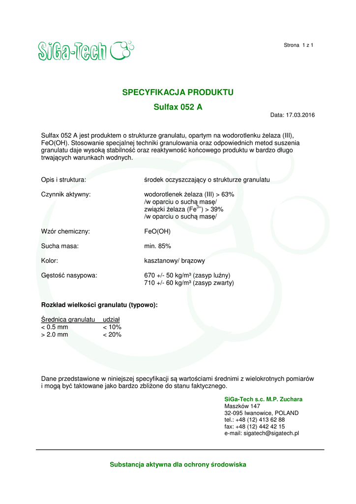 Strona 1 z 1 SPECYFIKACJA PRODUKTU Sulfax 052 A Data: 17.03.2016 Sulfax 052 A jest produktem o strukturze granulatu, opartym na wodorotlenku żelaza (III), FeO(OH). Stosowanie specjalnej techniki granulowania oraz odpowiednich metod suszenia granulatu daje wysoką stabilność oraz reaktywność końcowego produktu w bardzo długo trwających warunkach wodnych. Opis i struktura: środek oczyszczający o strukturze granulatu Czynnik aktywny: wodorotlenek żelaza (III) > 63% /w oparciu o suchą masę/ związki żelaza (Fe3+) > 39% /w oparciu o suchą masę/ Wzór chemiczny: FeO(OH) Sucha masa: min. 85% Kolor: kasztanowy/ brązowy Gęstość nasypowa: 670 +/- 50 kg/m³ (zasyp luźny) 710 +/- 60 kg/m³ (zasyp zwarty) Rozkład wielkości granulatu (typowo): Średnica granulatu < 0.5 mm > 2.0 mm udział < 10% < 20% Dane przedstawione w niniejszej specyfikacji są wartościami średnimi z wielokrotnych pomiarów i mogą być taktowane jako bardzo zbliżone do stanu faktycznego. SiGa-Tech s.c. M.P. Zuchara Maszków 147 32-095 Iwanowice, POLAND tel.: +48 (12) 413 62 88 fax: +48 (12) 442 42 15 e-mail: [email protected] Substancja aktywna dla ochrony środowiska