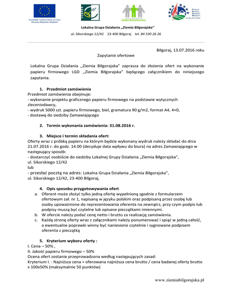 Lokalna Grupa Działania „Ziemia Biłgorajska” ul. Sikorskiego 12/42 23-400 Biłgoraj tel. 84 530 26 26 Biłgoraj, 13.07.2016 roku Zapytanie ofertowe Lokalna Grupa Działania ,,Ziemia Biłgorajska” zaprasza do złożenia ofert na wykonanie papieru firmowego LGD ,,Ziemia Biłgorajska” będącego załącznikiem do niniejszego zapytania. 1. Przedmiot zamówienia Przedmiot zamówienia obejmuje: - wykonanie projektu graficznego papieru firmowego na podstawie wytycznych zleceniodawcy, - wydruk 5000 szt. papieru firmowego, biel, gramatura 90 g/m2, format A4, 4+0, - dostawę do siedziby Zamawiającego 2. Termin wykonania zamówienia: 31.08.2016 r. 3. Miejsce i termin składania ofert: Oferty wraz z próbką papieru na którym będzie wykonany wydruk należy składać do dnia 21.07.2016 r. do godz. 14.00 (decyduje data wpływu do biura) na adres Zamawiającego w następujący sposób: - dostarczyć osobiście do siedziby Lokalnej Grupy Działania „Ziemia Biłgorajska”, ul. Sikorskiego 12/42 lub - przesłać pocztą na adres: Lokalna Grupa Działania „Ziemia Biłgorajska”, ul. Sikorskiego 12/42, 23-400 Biłgoraj, 4. Opis sposobu przygotowywania ofert a. Oferent może złożyć tylko jedną ofertę wypełnioną zgodnie z formularzem ofertowym zał. nr 1, napisaną w języku polskim oraz podpisaną przez osobę lub osoby upoważnione do reprezentowania oferenta na zewnątrz, przy czym podpis lub podpisy muszą być czytelne lub opisane pieczątkami imiennymi. b. W ofercie należy podać cenę netto i brutto za realizację zamówienia. c. Każdą stronę oferty wraz z załącznikami należy ponumerować i spiąć w jedną całość, a ewentualne poprawki winny być naniesione czytelnie i sygnowane podpisem oferenta z pieczątką 5. Kryterium wyboru oferty : I. Cena – 50% , II. Jakość papieru firmowego – 50% Ocena ofert zostanie przeprowadzona według następujących zasad: Kryterium I. : Najniższa cena = oferowana najniższa cena brutto / cena badanej oferty brutto x 100x50% (maksymalnie 50 punktów) www.ziemiabilgorajska.pl Kryterium II. : Zamawiający oceni jakość oferowanego papieru przyznając od 0 do 50 punktów (maksymalnie 50 punktów). Oferty złożone po terminie nie będą rozpatrywane. Zamawiający wybierze najkorzystniejszą ofertę. Zamawiający dopuszcza odstąpienie od realizacji zamówienia bez podania przyczyn. Zamawiający zastrzega możliwość zmiany projektu papieru firmowego. Osoba do kontaktu: Waldemar Sawastynowicz www.ziemiabilgorajska.pl .......................................................................... .......................................................................... ( nazwa i adres wykonawcy) FORMULARZ OFERTY Lokalna Grupa Działania ,,Ziemia Biłgorajska” ul. Sikorskiego 12/42 23 – 400 Biłgoraj Nawiązując do zapytania wykonanie papieru firmowego LGD ,,Ziemia Biłgorajska” 1. Oferujemy wykonanie przedmiotu zamówienia. 2. Oferujemy wykonanie całości zamówienia za cenę brutto: ....................................... zł. słownie: ....................................................................................................................... zł. w tym: cena netto wynosi: ............................................. zł. słownie .......................................... ..................................................................................................................................... zł. podatek VAT w wysokości .............. %, co stanowi kwotę: ....................................... zł. słownie: ....................................................................................................................... zł. zgodnie z załączonym kosztorysem ofertowym. 3. Oświadczamy, że przedmiot oferty jest zgodny z przedmiotem zamówienia. 4. Załącznikami do niniejszej oferty są: …........................................................................................................................................... ………………………………………………………………………………………………………………………………………. Data: ............................... Wykonawca: ..................................................................... (podpis upoważnionego przedstawiciela wykonawcy ) z pieczątką imienną i pieczątką firmy www.ziemiabilgorajska.pl