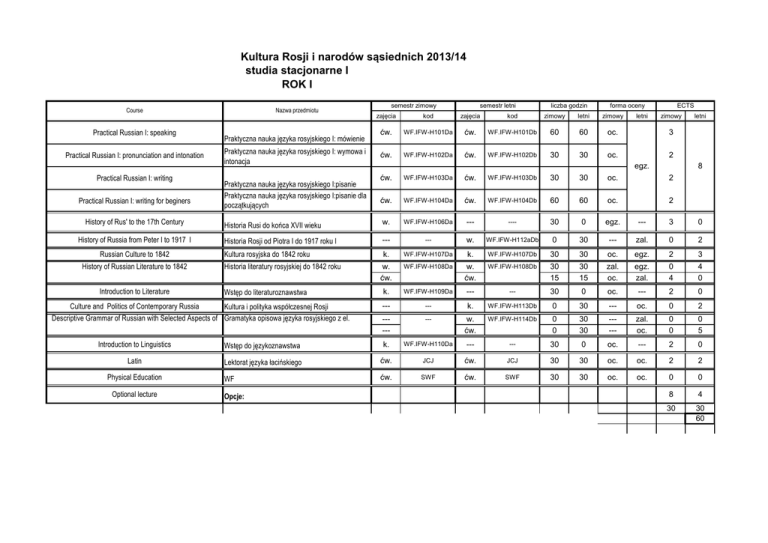 Kultura Rosji i narodów sąsiednich 2013/14 studia stacjonarne I ROK I Course Practical Russian I: speaking Practical Russian I: pronunciation and intonation Practical Russian I: writing Practical Russian I: writing for beginers History of Rus' to the 17th Century History of Russia from Peter I to 1917 I Russian Culture to 1842 History of Russian Literature to 1842 Introduction to Literature Nazwa przedmiotu Praktyczna nauka języka rosyjskiego I: mówienie Praktyczna nauka języka rosyjskiego I: wymowa i intonacja semestr zimowy semestr letni liczba godzin forma oceny zajęcia kod zajęcia kod zimowy letni zimowy ćw. WF.IFW-H101Da ćw. WF.IFW-H101Db 60 60 oc. ćw. WF.IFW-H102Da ćw. WF.IFW-H102Db 30 30 oc. letni ECTS zimowy letni 3 2 egz. 8 ćw. WF.IFW-H103Da ćw. WF.IFW-H103Db 30 30 oc. 2 ćw. WF.IFW-H104Da ćw. WF.IFW-H104Db 60 60 oc. 2 Historia Rusi do końca XVII wieku w. WF.IFW-H106Da --- ---- 30 0 egz. --- 3 0 Historia Rosji od Piotra I do 1917 roku I --- --- w. WF.IFW-H112aDb 0 30 --- zal. 0 2 Praktyczna nauka języka rosyjskiego I:pisanie Praktyczna nauka języka rosyjskiego I:pisanie dla początkujących Kultura rosyjska do 1842 roku Historia literatury rosyjskiej do 1842 roku Wstęp do literaturoznawstwa Culture and Politics of Contemporary Russia Kultura i polityka współczesnej Rosji Descriptive Grammar of Russian with Selected Aspects of Gramatyka opisowa języka rosyjskiego z el. Contrastive Polish-Russian Grammar gramatyki kontrastywnej ros.-pol. k. WF.IFW-H107Da k. WF.IFW-H107Db 30 30 oc. egz. 2 3 w. ćw. WF.IFW-H108Da w. ćw. WF.IFW-H108Db 30 15 30 15 zal. oc. egz. zal. 0 4 4 0 k. WF.IFW-H109Da --- --- 30 0 oc. --- 2 0 --- --- k. WF.IFW-H113Db 0 30 --- oc. 0 2 ----- --- w. ćw. WF.IFW-H114Db 0 0 30 30 ----- zal. oc. 0 0 0 5 Introduction to Linguistics Wstęp do językoznawstwa k. WF.IFW-H110Da --- --- 30 0 oc. --- 2 0 Latin Lektorat języka łacińskiego ćw. JCJ ćw. JCJ 30 30 oc. oc. 2 2 WF ćw. SWF ćw. SWF 30 30 oc. oc. 0 0 8 4 30 30 60 Physical Education Optional lecture Opcje: Kultura Rosji i narodów sąsiednich 2013/14 studia stacjonarne I stopnia ROK II Nazwa przedmiotu Practical Russian II: speaking Praktyczna nauka języka rosyjskiego II - mówienie semestr zimowy zajęcia kod ćw. WF.IFW-H201Da semestr letni zajęcia kod ćw. WF.IFW-H201Db liczba godzin zimowy letni 60 60 forma oceny zimowy letni ECTS zimowy letni 3 oc. 6 egz. Practical Russian II: writing History of Russian Literature (1842–1917) Russian Culture (1842-1917) History of Russia from Peter I to 1917 II History of Russia since 1917 History of Ukraine (1648 - 1991) Ukrainian Culture Life and Institutions of the Russian-Speaking Countries Old Church Slavonic Grammar Praktyczna nauka języka rosyjskiego II - pisanie ćw. WF.IFW-H202Da ćw. WF.IFW-H202Db 60 60 oc. w. ćw. WF.IFW-H206Da w. ćw. WF.IFW-H206Db 30 15 30 15 zal. oc. egz. zal. 0 3 3 0 Kultura rosyjska (1842 - 1917) k. WF.IFW-H207Da k. WF.IFW-H207Db 30 30 oc. egz. 2 2 Historia Rosji od Piotra I do 1917 roku II w. WF.IFW-H208aDa --- --- 30 0 egz. --- 2 0 w. WF.IFW-H208bDb 0 30 -- egz. 0 2 Historia literatury rosyjskiej 1842-1917 Dzieje Rosji po 1917 roku 3 Historia Ukrainy od 1648 do 1991 roku Kultura ukraińska k. WF.IFW-H209Da --- --- 30 0 oc. --- 2 0 --- --- k. WF.IFW-H210Db 0 30 --- oc. 0 2 Realioznawstwo obszaru języka rosyjskiego --- --- w. WF.IFW-H211Db 0 30 --- oc. 0 2 Język staro-cerkiewno-słowiański --- --- k. WF.IFW-H212Db 0 30 --- oc. 0 2 w. ćw. WF.IFW-H213Da ----- --- 30 30 0 0 egz. zal. ----- 4 0 0 0 w. WF.IFW-H214Da w. WF.IFW-H214Db 30 30 zal. egz. 2 2 Descriptive Grammar of Russian with Selected Aspects of Gramatyka opisowa języka rosyjskiego z el. gramatyki Contrastive Polish-Russian Grammar kontrastywnej ros.-pol. History of Philosophy Historia filozofii Language and culture Język a kultura --- --- k. WF.IFW-H215Db 0 30 --- oc. 0 2 Lektorat języka zachodnioeuropejskiego B2 ćw. JCJ ćw. JCJ 60 60 oc. egz. 4 4 West-European Language B2 8 Opcje Ilość godzin + razem (początk.): Ilość godzin + razem (zaawansow.): #ADR! #ADR! #ADR! 405 435 840 25 35 60 Kultura Rosji i narodów sąsiednich 2012/13 studia stacjonarne I stopnia ROK III Nazwa przedmiotu semestr zimowy semestr letni liczba godzin zajęcia kod zajęcia kod zimowy letni WF.IFW-H301Da WF.IFW-H301Db ćw. ćw. 30 60 WF.IFW-H302Da WF.IFW-H302Db ćw. ćw. 60 30 w. w. 30 30 WF.IFW-H304Da WF.IFW-H304Db ćw. ćw. 15 15 forma oceny zimowy letni zal. egz. zal. zal. egz. zal. zal. ECTS zimowy letni 0 10 0 0 7 0 0 Practical Russian III: speaking Practical Russian III: writing Praktyczna nauka języka rosyjskiego III - mówienie Praktyczna nauka języka rosyjskiego III - pisanie History of Russian Literature (20th century) Historia literatury rosyjskiej XX w. Russian Culture in 20th century Kultura rosyjska XX wieku k. WF.IFW-H305Da k. WF.IFW-H305Db 30 30 zal. egz. 0 5 History of Belarus Historia Białorusi k. WF.IFW-H306Da --- --- 30 0 oc. --- 2 0 Belarusian Culture Kultura białoruska --- --- k. WF.IFW-H307Db 0 30 --- oc. 0 2 Ukrainian/Belarusian Drugi język wschodniosłowiański ćw. WF.IFW-H308Da/ WF.IFW-H309Da ćw. WF.IFW-H308Db/ WF.IFW-H309Db 60 60 zal. egz. 0 6 Licencjat Seminar (literary studies) Seminarium licencjackie - literaturoznawcze sem. WF.IFW-H310a --- --- 30 0 zal. --- 6 0 Licencjat Seminar (cultural studies) Seminarium licencjackie - kulturologiczne --- ---- sem. WF.IFW-H310b 0 30 --- zal. 0 6 Media in contemporary Russia Media współczesnej Rosji k. WF.IFW-H311Da --- --- 30 0 oc. --- 2 0 Russian Historical Grammar - Text Analysis Historia języka rosyjskiego - analiza tekstów k. WF.IFW-H312Da --- --- 30 0 oc. --- 3 0 Introduction to cultural studies - methods of research into culture Wstęp do kulturologii - metody badania kultury w. WF.IFW-H313Da --- --- 30 0 oc. --- 2 0 Lannguage of Business - intermediate Język biznesu - poziom średni ćw. WF.IFW-H314Da ćw. WF.IFW-H314Db 30 30 zal. oc. 0 4 Selected Topics in History of Russian Cinemat
