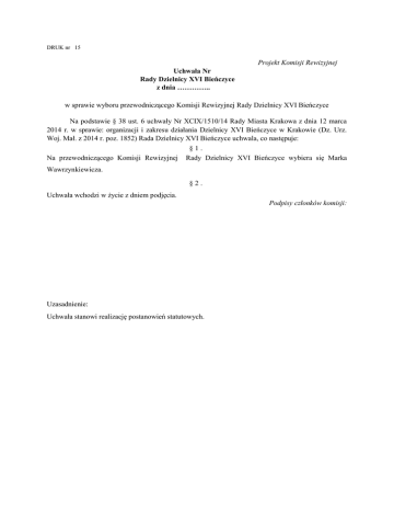 DRUK nr 15 Projekt Komisji Rewizyjnej Uchwała Nr Rady Dzielnicy XVI Bieńczyce z dnia ………….. w sprawie wyboru przewodniczącego Komisji Rewizyjnej Rady Dzielnicy XVI Bieńczyce Na podstawie § 38 ust. 6 uchwały Nr XCIX/1510/14 Rady Miasta Krakowa z dnia 12 marca 2014 r. w sprawie: organizacji i zakresu działania Dzielnicy XVI Bieńczyce w Krakowie (Dz. Urz. Woj. Mał. z 2014 r. poz. 1852) Rada Dzielnicy XVI Bieńczyce uchwala, co następuje: §1. Na przewodniczącego Komisji Rewizyjnej Rady Dzielnicy XVI Bieńczyce wybiera się Marka Wawrzynkiewicza. §2. Uchwała wchodzi w życie z dniem podjęcia. Podpisy członków komisji: Uzasadnienie: Uchwała stanowi realizację postanowień statutowych. DRUK nr 16 Projekt Komisji Mieszkalnictwa, Rodziny i Spraw Społecznych Uchwała Nr Rady Dzielnicy XVI Bieńczyce z dnia ………….. w sprawie wyboru przewodniczącego i wiceprzewodniczącego Komisji Mieszkalnictwa, Rodziny i Spraw Społecznych Rady Dzielnicy XVI Bieńczyce Na podstawie § 38 ust. 6 uchwały Nr XCIX/1510/14 Rady Miasta Krakowa z dnia 12 marca 2014 r. w sprawie: organizacji i zakresu działania Dzielnicy XVI Bieńczyce w Krakowie (Dz. Urz. Woj. Mał. z 2014 r. poz. 1852) Rada Dzielnicy XVI Bieńczyce uchwala, co następuje: §1. Na przewodniczącego Komisji Mieszkalnictwa, Rodziny i Spraw Społecznych Rady Dzielnicy XVI Bieńczyce wybiera się Radną Marię Teresę Zarembę-Piwowarską . §2. Na wiceprzewodniczącego Komisji Mieszkalnictwa, Rodziny i Spraw Społecznych Rady Dzielnicy XVI Bieńczyce wybiera się Radną Zofię Strojek. §3. Uchwała wchodzi w życie z dniem podjęcia. Podpisy członków komisji: Uzasadnienie: Uchwała stanowi realizację postanowień statutowych. DRUK 17 Projekt Komisji Zdrowia i Profilaktyki Uchwała Nr Rady Dzielnicy XVI Bieńczyce z dnia ………….. w sprawie wyboru przewodniczącego i wiceprzewodniczącego Komisji Zdrowia i Profilaktyki Rady Dzielnicy XVI Bieńczyce Na podstawie § 38 ust. 6 uchwały Nr XCIX/1510/14 Rady Miasta Krakowa z dnia 12 marca 2014 r. w sprawie: organizacji i zakresu działania Dzielnicy XVI Bieńczyce w Krakowie (Dz. Urz. Woj. Mał. z 2014 r. poz. 1852) Rada Dzielnicy XVI Bieńczyce uchwala, co następuje: §1. Na przewodniczącego Komisji Zdrowia i Profilaktyki Rady Dzielnicy XVI Bieńczyce wybiera się Stanisławę Romanik. §2. Na wiceprzewodniczącego Komisji Zdrowia i Profilaktyki Rady Dzielnicy XVI Bieńczyce wybiera się Marię Teresę Zarembę-Piwowarską. . §3. Uchwała wchodzi w życie z dniem podjęcia. Podpisy członków komisji: Uzasadnienie: Uchwała stanowi realizację postanowień statutowych. DRUK nr 18 Projekt Komisji Praworządności i Porządku Publicznego Uchwała Nr Rady Dzielnicy XVI Bieńczyce z dnia ………….. w sprawie wyboru przewodniczącego i wiceprzewodniczącego Komisji Praworządności i Porządku Publicznego Rady Dzielnicy XVI Bieńczyce Na podstawie § 38 ust. 6 uchwały Nr XCIX/1510/14 Rady Miasta Krakowa z dnia 12 marca 2014 r. w sprawie: organizacji i zakresu działania Dzielnicy XVI Bieńczyce w Krakowie (Dz. Urz. Woj. Mał. z 2014 r. poz. 1852) Rada Dzielnicy XVI Bieńczyce uchwala, co następuje: §1. Na przewodniczącego Komisji Praworządności i Porządku Publicznego Rady Dzielnicy XVI Bieńczyce wybiera się Piotra Dominika §2. Na wiceprzewodniczącego Komisji Praworządności i Porządku Publicznego Rady Dzielnicy XVI Bieńczyce wybiera się – komisja nie zgłosiła kandydata . §3. Uchwała wchodzi w życie z dniem podjęcia. Podpisy członków komisji: Uzasadnienie: Uchwała stanowi realizację postanowień statutowych. DRUK nr 19 Projekt Komisji Edukacji, Kultury, Sportu i Komunikacji Społecznej Uchwała Nr Rady Dzielnicy XVI Bieńczyce z dnia ………….. w sprawie wyboru przewodniczącego Komisji Edukacji, Kultury, Sportu i Komunikacji Społecznej Rady Dzielnicy XVI Bieńczyce Na podstawie § 38 ust. 6 uchwały Nr XCIX/1510/14 Rady Miasta Krakowa z dnia 12 marca 2014 r. w sprawie: organizacji i zakresu działania Dzielnicy XVI Bieńczyce w Krakowie (Dz. Urz. Woj. Mał. z 2014 r. poz. 1852) Rada Dzielnicy XVI Bieńczyce uchwala, co następuje: §1. Na przewodniczącego Komisji Edukacji, Kultury, Sportu i Komunikacji Społecznej Rady Dzielnicy XVI Bieńczyce wybiera się Magdalenę Dziedzic. §2. Uchwała wchodzi w życie z dniem podjęcia. Podpisy członków komisji: Uzasadnienie: Uchwała stanowi realizację postanowień statutowych. DRUK nr 20 Projekt Komisji Infrastruktury Komunalnej i Planowania Przestrzennego Uchwała Nr Rady Dzielnicy XVI Bieńczyce z dnia ………….. w sprawie wyboru przewodniczącego i wiceprzewodniczącego Komisji Infrastruktury Komunalnej i Planowania Przestrzennego Rady Dzielnicy XVI Bieńczyce Na podstawie § 38 ust. 6 uchwały Nr XCIX/1510/14 Rady Miasta Krakowa z dnia 12 marca 2014 r. w sprawie: organizacji i zakresu działania Dzielnicy XVI Bieńczyce w Krakowie (Dz. Urz. Woj. Mał. z 2014 r. poz. 1852) Rada Dzielnicy XVI Bieńczyce uchwala, co następuje: §1. Na przewodniczącego Komisji Infrastruktury Komunalnej i Planowania Przestrzennego Rady Dzielnicy XVI Bieńczyce Antoni Konstanty. §2. Na wiceprzewodniczącego Komisji Infrastruktury Komunalnej i Planowania Przestrzennego Rady Dzielnicy XVI Bieńczyce Grzegorz Król. §3. Uchwała wchodzi w życie z dniem podjęcia. Podpisy członków komisji: Uzasadnienie: Uchwała stanowi realizację postanowień statutowych. DRUK nr 21 Projekt Komisji Ochrony Środowiska i Terenów Zielonych Uchwała Nr Rady Dzielnicy XVI Bieńczyce z dnia ………….. w sprawie wyboru przewodniczącego i wiceprzewodniczącego Komisji Ochrony Środowiska i Terenów Zielonych Rady Dzielnicy XVI Bieńczyce Na podstawie § 38 ust. 6 uchwały Nr XCIX/1510/14 Rady Miasta Krakowa z dnia 12 marca 2014 r. w sprawie: organizacji i zakresu działania Dzielnicy XVI Bieńczyce w Krakowie (Dz. Urz. Woj. Mał. z 2014 r. poz. 1852) Rada Dzielnicy XVI Bieńczyce uchwala, co następuje: §1. Na prz