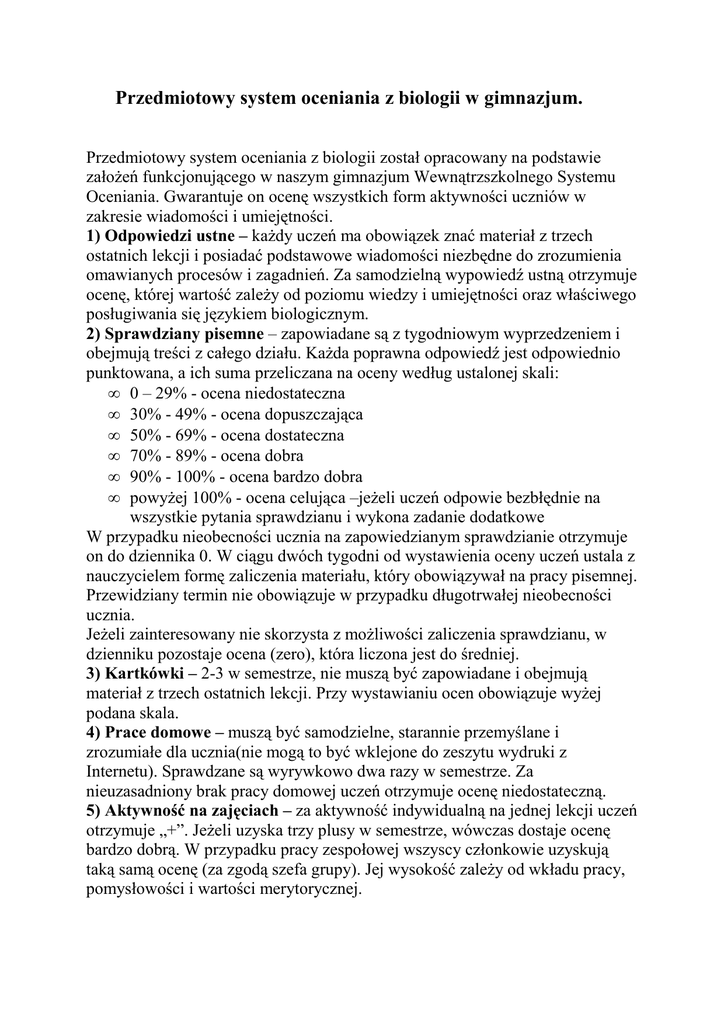 Przedmiotowy system oceniania z biologii w gimnazjum. Przedmiotowy system oceniania z biologii został opracowany na podstawie załoŜeń funkcjonującego w naszym gimnazjum Wewnątrzszkolnego Systemu Oceniania. Gwarantuje on ocenę wszystkich form aktywności uczniów w zakresie wiadomości i umiejętności. 1) Odpowiedzi ustne – kaŜdy uczeń ma obowiązek znać materiał z trzech ostatnich lekcji i posiadać podstawowe wiadomości niezbędne do zrozumienia omawianych procesów i zagadnień. Za samodzielną wypowiedź ustną otrzymuje ocenę, której wartość zaleŜy od poziomu wiedzy i umiejętności oraz właściwego posługiwania się językiem biologicznym. 2) Sprawdziany pisemne – zapowiadane są z tygodniowym wyprzedzeniem i obejmują treści z całego działu. KaŜda poprawna odpowiedź jest odpowiednio punktowana, a ich suma przeliczana na oceny według ustalonej skali: • 0 – 29% - ocena niedostateczna • 30% - 49% - ocena dopuszczająca • 50% - 69% - ocena dostateczna • 70% - 89% - ocena dobra • 90% - 100% - ocena bardzo dobra • powyŜej 100% - ocena celująca –jeŜeli uczeń odpowie bezbłędnie na wszystkie pytania sprawdzianu i wykona zadanie dodatkowe W przypadku nieobecności ucznia na zapowiedzianym sprawdzianie otrzymuje on do dziennika 0. W ciągu dwóch tygodni od wystawienia oceny uczeń ustala z nauczycielem formę zaliczenia materiału, który obowiązywał na pracy pisemnej. Przewidziany termin nie obowiązuje w przypadku długotrwałej nieobecności ucznia. JeŜeli zainteresowany nie skorzysta z moŜliwości zaliczenia sprawdzianu, w dzienniku pozostaje ocena (zero), która liczona jest do średniej. 3) Kartkówki – 2-3 w semestrze, nie muszą być zapowiadane i obejmują materiał z trzech ostatnich lekcji. Przy wystawianiu ocen obowiązuje wyŜej podana skala. 4) Prace domowe – muszą być samodzielne, starannie przemyślane i zrozumiałe dla ucznia(nie mogą to być wklejone do zeszytu wydruki z Internetu). Sprawdzane są wyrywkowo dwa razy w semestrze. Za nieuzasadniony brak pracy domowej uczeń otrzymuje ocenę niedostateczną. 5) Aktywność na zajęciach – za aktywność indywidualną na jednej lekcji uczeń otrzymuje „+”. JeŜeli uzyska trzy plusy w semestrze, wówczas dostaje ocenę bardzo dobrą. W przypadku pracy zespołowej wszyscy członkowie uzyskują taką samą ocenę (za zgodą szefa grupy). Jej wysokość zaleŜy od wkładu pracy, pomysłowości i wartości merytorycznej. 6) Prace nadobowiązkowe – udział w finale konkursu przedmiotowego gwarantuje uczestnikom ocenę celującą. Prowadzenie hodowli domowych do wykorzystania na zajęciach, przygotowanie referatów, albumów, plakatów, udział w konkursach o tematyce biologicznej, gromadzenie wskazanych przez nauczyciela okazów roślin i zwierząt jest nagradzane oceną.