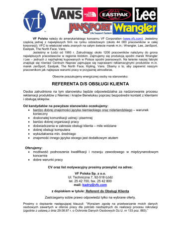 okoùo VF Polska nale¿y do amerykañskiego koncernu VF Corporation (www.vfc.com). Jesteœmy czêœci¹ jednej z najwiêkszych firm na rynku odzie¿owym (okoùo 44 000 pracowników w caùej korporacji). VFC to wùaœciciel wielu znanych na caùym œwiecie marek m.in.: Wrangler, Lee, JanSport, Eastpak, The North Face, Vans. Jesteœmy w £odzi od 1993 r. Zatrudniaj¹c okoùo 1200 pracowników nale¿ymy do grona najwiêkszych pracodawców w regionie ùódzkim. Zajmujemy siê produkcj¹ spodni marek Wrangler i Lee – jednych z najchêtniej kupowanych w Polsce spodni jeansowych. Na terenie naszej fabryki znajduje siê równie¿ Centrum Napraw zajmuj¹ce siê naprawami reklamacyjnymi produktów m.in. marek JanSport, Eastpak, The North Face, Kipling, Vans. Dbamy o to, aby zapewniã naszym pracownikom jak najlepsze warunki pracy w przyjaznej atmosferze. Obecnie poszukujemy energicznej osoby na stanowisko: REFERENTA D/S OBS£UGI KLIENTA Osoba zatrudniona na tym stanowisku bêdzie odpowiedzialna za nadzorowanie procesu reklamacji produktów z Niemiec i krajów Beneluksu poprzez bezpoœredni kontakt z klientami i obsùug¹ sklepów. Od kandydatów na powy¿sze stanowisko oczekujemy: bardzo dobrej znajomoœci jêzyka niemieckiego oraz niderlandzkiego – warunek konieczny doskonaùej komunikacji ustnej i pisemnej bardzo dobrej organizacji pracy doœwiadczenia w zakresie obsùugi klienta – mile widziane dobrej obsùugi komputera wyksztaùcenia min. œredniego znajomoœã innego jêzyka obcego jest dodatkowym atutem Oferujemy: mo¿liwoœã podnoszenia kwalifikacji i rozwoju zawodowego w miêdzynarodowym koncernie dobre warunki pracy CV oraz list motywacyjny prosimy przesyùaã na adres: VF Polska Sp. z o.o. Ul. Techniczna 7, 92-518 £ódê tel. 25 42 700, fax. 25 42 800 mail: [email protected] z dopiskiem w tytule: Referent ds Obsùugi Klienta Zastrzegamy sobie prawo odpowiedzi tylko na wybrane oferty. Prosimy o dopisanie nastêpuj¹cej klauzuli: “Wyra¿am zgodê na przetwarzanie moich danych osobowych zawartych w ofercie pracy dla potrzeb niezbêdnych do realizacji procesu rekrutacji (zgodnie z ustaw¹ z dnia 29.08.97 r. o Ochronie Danych Osobowych Dz.U. nr 133 poz. 883).”