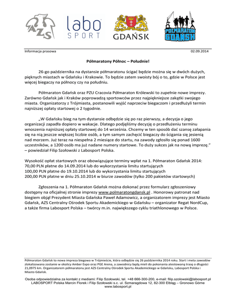 Informacja prasowa 02.09.2014 Półmaratony Północ – Południe! 26-go października na dystansie półmaratonu ścigać będzie można się w dwóch dużych, pięknych miastach w Gdańsku i Krakowie. To będzie zatem swoisty bój o to, gdzie w Polsce jest więcej biegaczy na północy czy na południu. Półmaraton Gdańsk oraz PZU Cracovia Półmaraton Królewski to zupełnie nowe imprezy. Zarówno Gdańsk jak i Kraków poprowadzą sportowców przez najpiękniejsze zakątki swojego miasta. Organizatorzy z Trójmiasta, postanowili wyjść naprzeciw biegaczom i przedłużyli termin najniższej opłaty startowej o 2 tygodnie. „W Gdańsku bieg na tym dystansie odbędzie się po raz pierwszy, a decyzja o jego organizacji zapadła dopiero w wakacje. Dlatego podjęliśmy decyzję o przedłużeniu terminu wnoszenia najniższej opłaty startowej do 14 września. Chcemy w ten sposób dać szansę załapania się na nią jeszcze większej liczbie osób, a tym samym zachęcić biegaczy do ścigania się jesienią nad morzem. Już teraz na niespełna 2 miesiące do startu, na zawody zgłosiło się ponad 1600 uczestników, a 1200 osób ma już nadane numery startowe. To duży sukces jak na nową imprezę.” – powiedział Filip Szołowski z Labosport Polska. Wysokość opłat startowych oraz obowiązujące terminy wpłat na 1. Półmaraton Gdańsk 2014: 70,00 PLN płatne do 14.09.2014 lub do wykorzystania limitu startujących 100,00 PLN płatne do 19.10.2014 lub do wykorzystania limitu startujących 200,00 PLN płatne w dniu 25.10.2014 w biurze zawodów (tylko 200 pakietów startowych) Zgłoszenia na 1. Półmaraton Gdańsk można dokonać przez formularz zgłoszeniowy dostępny na oficjalnej stronie imprezy www.polmaratongdansk.pl . Honorowy patronat nad biegiem objął Prezydent Miasta Gdańska Paweł Adamowicz, a organizatorem imprezy jest Miasto Gdańsk, AZS Centralny Ośrodek Sportu Akademickiego w Gdańsku – organizator Regat NordCup, a także firma Labosport Polska – twórcy m.in. największego cyklu triathlonowego w Polsce. Półmaraton Gdańsk to nowa impreza biegowa w Trójmieście, która odbędzie się 26 października 2014 roku. Start i meta zawodów zlokalizowana zostanie w okolicy Amber Expo oraz PGE Arena, a zawodnicy będą mieli do pokonania atestowaną trasę o długości 21,0975 km. Organizatorem półmaratonu jest AZS Centralny Ośrodek Sportu Akademickiego w Gdańsku, Labosport Polska i Miasto Gdańsk. Osoba odpowiedzialna za kontakt z mediami: Filip Szołowski, tel. +48 666-300-200, e-mail: [email protected] LABOSPORT Polska Marcin Florek i Filip Szołowski s.c. ul. Szmaragdowa 12, 82-300 Elbląg – Gronowo Górne www.labosport.pl