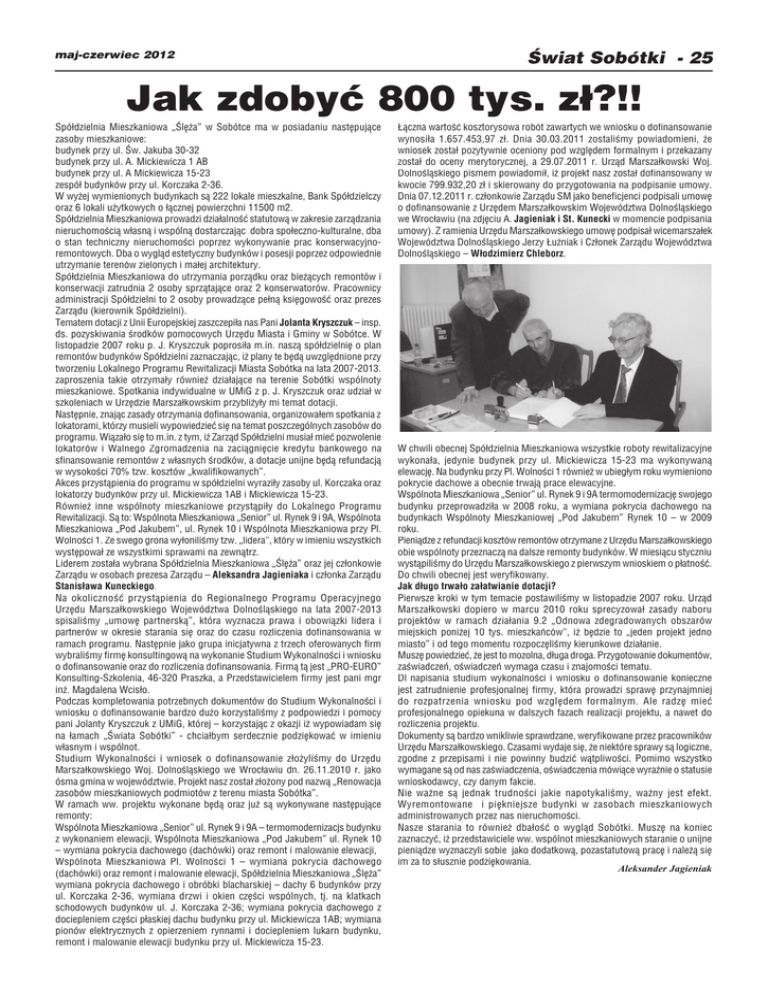 maj-czerwiec 2012 maj-czerwiec Świat Sobótki - 25 Jak zdobyć 800 tys. zł?!! Spółdzielnia Mieszkaniowa „Ślęża” w Sobótce ma w posiadaniu następujące zasoby mieszkaniowe: budynek przy ul. Św. Jakuba 30-32 budynek przy ul. A. Mickiewicza 1 AB budynek przy ul. A Mickiewicza 15-23 zespół budynków przy ul. Korczaka 2-36. W wyżej wymienionych budynkach są 222 lokale mieszkalne, Bank Spółdzielczy oraz 6 lokali użytkowych o łącznej powierzchni 11500 m2. Spółdzielnia Mieszkaniowa prowadzi działalność statutową w zakresie zarządzania nieruchomością własną i wspólną dostarczając dobra społeczno-kulturalne, dba o stan techniczny nieruchomości poprzez wykonywanie prac konserwacyjnoremontowych. Dba o wygląd estetyczny budynków i posesji poprzez odpowiednie utrzymanie terenów zielonych i małej architektury. Spółdzielnia Mieszkaniowa do utrzymania porządku oraz bieżących remontów i konserwacji zatrudnia 2 osoby sprzątające oraz 2 konserwatorów. Pracownicy administracji Spółdzielni to 2 osoby prowadzące pełną księgowość oraz prezes Zarządu (kierownik Spółdzielni). Tematem dotacji z Unii Europejskiej zaszczepiła nas Pani Jolanta Kryszczuk – insp. ds. pozyskiwania środków pomocowych Urzędu Miasta i Gminy w Sobótce. W listopadzie 2007 roku p. J. Kryszczuk poprosiła m.in. naszą spółdzielnię o plan remontów budynków Spółdzielni zaznaczając, iż plany te będą uwzględnione przy tworzeniu Lokalnego Programu Rewitalizacji Miasta Sobótka na lata 2007-2013. zaproszenia takie otrzymały również działające na terenie Sobótki wspólnoty mieszkaniowe. Spotkania indywidualne w UMiG z p. J. Kryszczuk oraz udział w szkoleniach w Urzędzie Marszałkowskim przybliżyły mi temat dotacji. Następnie, znając zasady otrzymania dofinansowania, organizowałem spotkania z lokatorami, którzy musieli wypowiedzieć się na temat poszczególnych zasobów do programu. Wiązało się to m.in. z tym, iż Zarząd Spółdzielni musiał mieć pozwolenie lokatorów i Walnego Zgromadzenia na zaciągnięcie kredytu bankowego na sfinansowanie remontów z własnych środków, a dotacje unijne będą refundacją w wysokości 70% tzw. kosztów „kwalifikowanych”. Akces przystąpienia do programu w spółdzielni wyraziły zasoby ul. Korczaka oraz lokatorzy budynków przy ul. Mickiewicza 1AB i Mickiewicza 15-23. Również inne wspólnoty mieszkaniowe przystąpiły do Lokalnego Programu Rewitalizacji. Są to: Wspólnota Mieszkaniowa „Senior” ul. Rynek 9 i 9A, Wspólnota Mieszkaniowa „Pod Jakubem”, ul. Rynek 10 i Wspólnota Mieszkaniowa przy Pl. Wolności 1. Ze swego grona wyłoniliśmy tzw. „lidera”, który w imieniu wszystkich występował ze wszystkimi sprawami na zewnątrz. Liderem została wybrana Spółdzielnia Mieszkaniowa „Ślęża” oraz jej członkowie Zarządu w osobach prezesa Zarządu – Aleksandra Jagieniaka i członka Zarządu Stanisława Kuneckiego. Na okoliczność przystąpienia do Regionalnego Programu Operacyjnego Urzędu Marszałkowskiego Województwa Dolnośląskiego na lata 2007-2013 spisaliśmy „umowę partnerską”, która wyznacza prawa i obowiązki lidera i partnerów w okresie starania się oraz do czasu rozliczenia dofinansowania w ramach programu. Następnie jako grupa inicjatywna z trzech oferowanych firm wybraliśmy firmę konsultingową na wykonanie Studium Wykonalności i wniosku o dofinansowanie oraz do rozliczenia dofinansowania. Firmą tą jest „PRO-EURO” Konsulting-Szkolenia, 46-320 Praszka, a Przedstawicielem firmy jest pani mgr inż. Magdalena Wcisło. Podczas kompletowania potrzebnych dokumentów do Studium Wykonalności i wniosku o dofinansowanie bardzo dużo korzystaliśmy z podpowiedzi i pomocy pani Jolanty Kryszczuk z UMiG, której – korzystając z okazji iż wypowiadam się na łamach „Świata Sobótki” - chciałbym serdecznie podziękować w imieniu własnym i wspólnot. Studium Wykonalności i wniosek o dofinansowanie złożyliśmy do Urzędu Marszałkowskiego Woj. Dolnośląskiego we Wrocławiu dn. 26.11.2010 r. jako ósma gmina w województwie. Projekt nasz został złożony pod nazwą „Renowacja zasobów mieszkaniowych podmiotów z terenu miasta Sobótka”. W ramach ww. projektu wykonane będą oraz już są wykonywane następujące remonty: Wspólnota Mieszkaniowa „Senior” ul. Rynek 9 i 9A – termomodernizacjs budynku z wykonaniem elewacji, Wspólnota Mieszkaniowa „Pod Jakubem” ul. Rynek 10 – wymiana pokrycia dachowego (dachówki) oraz remont i malowanie elewacji, Wspólnota Mieszkaniowa Pl. Wolności 1 – wymiana pokrycia dachowego (dachówki) oraz remont i malowanie elewacji, Spółdzielnia Mieszkaniowa „Ślęża” wymiana pokrycia dachowego i obróbki blacharskiej – dachy 6 budynków przy ul. Korczaka 2-36, wymiana drzwi i okien części wspólnych, tj. na klatkach schodowych budynków ul. J. Korczaka 2-36; wymiana pokrycia dachowego z dociepleniem części płaskiej dachu budynku przy ul. Mickiewicza 1AB; wymiana pionów elektrycznych z opierzeniem rynnami i dociepleniem lukarn budynku, remont i malowanie elewacji budynku przy ul. Mickiewicza 15-23. Łączna wartość kosztorysowa robót zawartych we wniosku o dofinansowanie wynosiła 1.657.453,97 zł. Dnia 30.03.2011 zostaliśmy powiadomieni, że wniosek został pozytywnie oceniony pod względem formalnym i przekazany został do oceny merytorycznej, a 29.07.2011 r. Urząd Marszałkowski Woj. Dolnośląskiego pismem powiadomił, iż projekt nasz został dofinansowany w kwocie 799.932,20 zł i skierowany do przygotowania na podpisanie umowy. Dnia 07.12.2011 r. członkowie Zarządu SM jako beneficjenci podpisali umowę o dofinansowanie z Urzędem Marszałkowskim Województwa Dolnośląskiego we Wrocławiu (na zdjęciu A. Jagieniak i St. Kunecki w momencie podpisania umowy). Z ramienia Urzędu Marszałkowskiego umowę podpisał wicemarszałek Województwa Dolnośląskiego Jerzy Łużniak i Członek Zarz