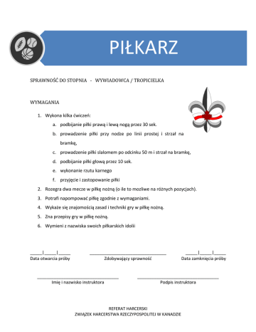 PIŁKARZ SPRAWNOŚĆ DO STOPNIA - WYWIADOWCA / TROPICIELKA WYMAGANIA 1. Wykona kilka ćwiczeń: a. podbijanie piłki prawą i lewą nogą przez 30 sek. b. prowadzenie piłki przy nodze po linii prostej i strzał na bramkę, c. prowadzenie piłki slalomem po odcinku 50 m i strzał na bramkę, d. podbijanie piłki głową przez 10 sek. e. wykonanie rzutu karnego f. przyjęcie i zastopowanie piłki 2. Rozegra dwa mecze w piłkę nożną (o ile to mozliwe na różnych pozycjach). 3. Potrafi napompować piłkę zgodnie z wymaganiami. 4. Wykaże się znajomością zasad i techniki gry w piłkę nożną. 5. Zna przepisy gry w piłkę nożną. 6. Wymieni z nazwiska swoich piłkarskich idolii _____|_____|_____ Data otwarcia próby ________________________________ Zdobywający sprawność __________________________________ Imię i nazwisko instruktora _____|_____|_____ Data zamknięcia próby __________________________________ Podpis instruktora REFERAT HARCERSKI ZWIĄZEK HARCERSTWA RZECZYPOSPOLITEJ W KANADZIE