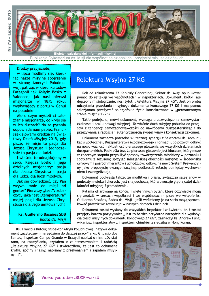 Nr 79 – Lipiec 2015 Biuletyn salezjańskiej informacji misyjnej Publikacja Dykasterium ds. Misji dla wspólnot salezjańskich i przyjaciół misji salezjańskich Drodzy przyjaciele, w lipcu modlimy się, kierując nasze misyjne spojrzenie w stronę Ameryki Południowej: patrząc w kierunku ludów Patagonii jak Ksiądz Bosko z Valdocco; jak nasi pierwsi misjonarze w 1875 roku, wypływający z portu w Genui na południe. Ale o czym myśleli ci salezjanie misjonarze, co kryło się w ich duszach? Na te pytania odpowiada nam papież Franciszek słowami orędzia na Światowy Dzień Misyjny 2015, gdy pisze, że misje to pasja dla Jezusa Chrystusa i jednocześnie to pasja dla ludzi. I właśnie to odnajdujemy w sercu Księdza Bosko i jego dzielnych misjonarzy: pasja dla Jezusa Chrystusa i pasja dla ludzi, dla ludzi młodych. Jak się dowiedzieć, czy Pan wzywa mnie do misji ad gentes? Pierwszy „test”: zobaczyć, jaka jest „temperatura” mojej pasji dla Jezusa Chrystusa i dla Jego umiłowanych! Ks. Guillermo Basañes SDB Radca ds. Misji Relektura Misyjna 27 KG Rok od zakończenia 27 Kapituły Generalnej, Sektor ds. Misji opublikował pomoc do refleksji we wspólnotach i w inspektoriach. Dokument, krótki, ale dogłębny misjologicznie, nosi tytuł: „Relektura Misyjna 27 KG”. Jest on próbą odczytania przesłania misyjnego dokumentu końcowego 27 KG i ma pomóc salezjanom przeżywać salezjańskie życie konsekrowane w „permanentnym stanie misji” (EG 25). Takie podejście, mówi dokument, wymaga przezwyciężenia samowystarczalności i braku odwagi misyjnej. To właśnie duch misyjny pobudza do przejścia z tendencji samozachowawczości do nawrócenia duszpasterskiego i do przeżywania z radością i autentycznością swojej wiary i konsekracji zakonnej. Dokument zaznacza potrzebę skutecznej synergii z Sektorami ds. Komunikacji Społecznej, Duszpasterstwa Młodzieżowego i Formacji, co pozwoli odkryć na nowo ważność i aktualność pierwszego głoszenia we wszystkich działaniach duszpasterskich. Podkreśla też, że pierwsze głoszenie jest kluczem, który może w znacznym stopniu przybliżyć sposoby towarzyszenia młodzieży w poznaniu i spotkaniu z Jezusem; sprzyjać salezjańskiej obecności misyjnej w środowisku cyfrowym i pośród imigrantów i uchodźców; odkryć na nowo System Prewencyjny jako propozycję ewangelizacyjną; podkreślić relację pomiędzy wychowaniem i ewangelizacją. Dokument podkreśla także, że modlitwa i ofiara, zwłaszcza salezjanów w podeszłym wieku i chorych, jest siłą duchową, która owocuje głębią całej działalności misyjnej Zgromadzenia. Pytania ofiarowane na końcu, i wiele innych pytań, które oczywiście mogą się zrodzić w sercach współbraci i we wspólnotach – pisze we wstępie ks. Guillermo Basañes, Radca ds. Misji – jeśli weźmiemy je na serio mogą sprowokować prawdziwe rewolucje w naszych domach i dziełach. Dokument został wysłany do wszystkich inspektorii w kwietniu br. i został przyjęty bardzo pozytywnie: „Jest to bardzo przydatne narzędzie dla wydobycia treści misyjnych dokumentu końcowego 27 KG”, zaznaczył ks. Andrew Fung, wikariusz inspektorialny z inspektorii chińskiej z siedzibą w Hong Kongu. Ks. Francois Dufour, inspektor Afryki Południowej, nazywa dokument „użytecznym narzędziem do dalszej pracy” a ks. Gildasio dos Santos, inspektor Campo Grande w Brazylii napisał o nim: „Dzisiaj rano, na rozmyślaniu, czytałem z zainteresowaniem i radością „Relekturę Misyjną 27 KG” i stwierdziłem, że jest to dokument krótki, spójny i jasny, napisany z przekonaniem i zapałem misyjnym!”. Video: youtu.be/z8OXK-waxzU Jeśli to jest wola Boża, idź i nie bój się! Kiedy byłem dzieckiem, moi rodzice zabierali mnie co niedzielę do kościoła na Mszę św. Po Mszy spotykaliśmy się z księdzem misjonarzem, proboszczem. Uczył nas śpiewać, tańczyć i modlić się. Raz w miesiącu odwiedzał i odprawiał Mszę św. w naszej wiosce. Jako misjonarz był bardzo sumienny w odwiedzaniu ludzi z odległych miejsc. Był bardzo miły i poświęcony dla wszystkich. Od dziecka znałem wielu misjonarzy europejskich, księży z innych zgromadzeń, którzy pracowali w naszej parafii. Ale moje powołanie misyjne umocniło się, gdy wstąpiłem do Zgromadzenia Salezjańskiego. Świadectwo życia i świętości salezjańskich misjonarzy, pracujących w moim kraju, umocniły moje salezjańskie powołanie misyjne. Ich świadectwo wiary i troska o młodzież biedną i prostą pozwoliły mi marzyć, że kiedyś i ja będę kapłanem misjonarzem jak oni. Dzisiaj wielu mówi, że Indonezja potrzebuje misjonarzy, ponieważ wielu Indonezyjczyków wciąż nie usłyszało Dobrej Nowiny i nie zna Jezusa. Kiedy powiedziałem rodzicom, że chcę być misjonarzem, byli zaskoczeni i trochę smutni. Moja mama powiedziała: „Dlaczego jedziesz tak daleko, kiedy my tutaj potrzebujemy misjonarzy? Ale jeśli to jest wola Boża i twoje powołanie, idź i nie bój się, będziemy ci towarzyszyć modlitwą”. Jestem bardzo wdzięczny moim formatorom salezjańskim, którzy towarzyszyli mi w moim powołaniu misyjnym. Otrzymaliśmy wiele od misjonarzy, i także my wydajemy owoce, choć może jeszcze małe. „Darmo otrzymaliście, darmo dawajcie” (Mt 10,18). Wierzę, że świadectwo radości młodych i miłość Chrystusa są dla wszystkich, bez granic. Po rozeznaniu, powiedziałem całym sobą „tak” dla misji ad gentes i na całe życie. Potem Przełożony Generalny, ks. Pascual Chávez, wysłał mnie do Paragwaju. Jako misjonarz, musiałem się nauczyć języka hiszpańskiego, który nie znałem i języka Guarani: większość Paragwajczyków używa tych dwóch języków. Doświadczyłem „szoku kulturowego”, bo musiałem dostosować się do nowej kultury i tradycji, bardzo różnych i bogatych. Czasem tęsknię za indonezyjskim jedzeniem, przyjaciółmi i rodziną. Ale dzięki cierpliwości, stopniowo 