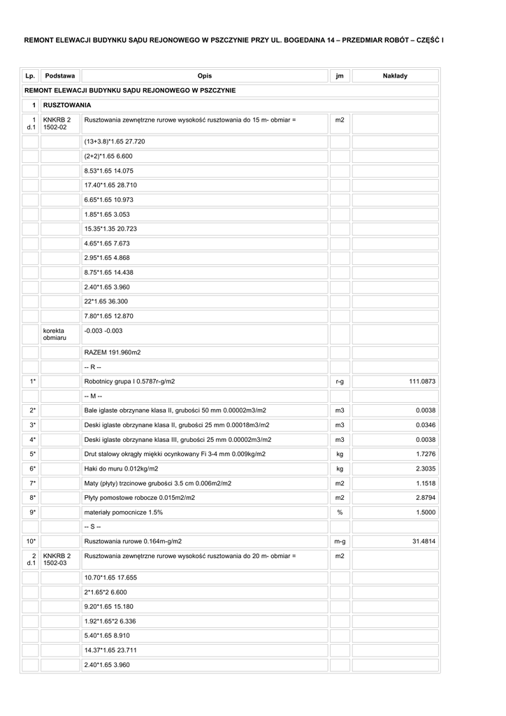REMONT ELEWACJI BUDYNKU SĄDU REJONOWEGO W PSZCZYNIE PRZY UL. BOGEDAINA 14 – PRZEDMIAR ROBÓT – CZĘŚĆ I Lp. Podstawa Opis jm Nakłady REMONT ELEWACJI BUDYNKU SĄDU REJONOWEGO W PSZCZYNIE 1 1 d.1 RUSZTOWANIA KNKRB 2 1502-02 Rusztowania zewnętrzne rurowe wysokość rusztowania do 15 m- obmiar = m2 (13+3.8)*1.65 27.720 (2+2)*1.65 6.600 8.53*1.65 14.075 17.40*1.65 28.710 6.65*1.65 10.973 1.85*1.65 3.053 15.35*1.35 20.723 4.65*1.65 7.673 2.95*1.65 4.868 8.75*1.65 14.438 2.40*1.65 3.960 22*1.65 36.300 7.80*1.65 12.870 korekta obmiaru -0.003 -0.003 RAZEM 191.960m2 -- R -- 1* Robotnicy grupa I 0.5787r-g/m2 r-g 111.0873 -- M -2* Bale iglaste obrzynane klasa II, grubości 50 mm 0.00002m3/m2 m3 0.0038 3* Deski iglaste obrzynane klasa II, grubości 25 mm 0.00018m3/m2 m3 0.0346 4* Deski iglaste obrzynane klasa III, grubości 25 mm 0.00002m3/m2 m3 0.0038 5* Drut stalowy okrągły miękki ocynkowany Fi 3-4 mm 0.009kg/m2 kg 1.7276 6* Haki do muru 0.012kg/m2 kg 2.3035 7* Maty (płyty) trzcinowe grubości 3.5 cm 0.006m2/m2 m2 1.1518 8* Płyty pomostowe robocze 0.015m2/m2 m2 2.8794 9* materiały pomocnicze 1.5% % 1.5000 Rusztowania rurowe 0.164m-g/m2 m-g 31.4814 Rusztowania zewnętrzne rurowe wysokość rusztowania do 20 m- obmiar = m2 -- S -10* 2 d.1 KNKRB 2 1502-03 10.70*1.65 17.655 2*1.65*2 6.600 9.20*1.65 15.180 1.92*1.65*2 6.336 5.40*1.65 8.910 14.37*1.65 23.711 2.40*1.65 3.960 Lp. Podstawa Opis jm Nakłady RAZEM 82.352m2 -- R -1* Robotnicy grupa I 0.6246r-g/m2 r-g 51.4371 -- M -2* Bale iglaste obrzynane klasa II, grubości 50 mm 0.00001m3/m2 m3 0.0008 3* Deski iglaste obrzynane klasa II, grubości 25 mm 0.00019m3/m2 m3 0.0156 4* Deski iglaste obrzynane klasa III, grubości 25 mm 0.00002m3/m2 m3 0.0016 5* Drut stalowy okrągły miękki ocynkowany Fi 3-4 mm 0.009kg/m2 kg 0.7412 6* Haki do muru 0.012kg/m2 kg 0.9882 7* Maty (płyty) trzcinowe grubości 3.5 cm 0.005m2/m2 m2 0.4118 8* Płyty pomostowe robocze 0.0154m2/m2 m2 1.2682 9* materiały pomocnicze 1.5% % 1.5000 m-g 14.5763 -- S -10* 3 d.1 Rusztowania rurowe 0.177m-g/m2 KNBK 5 1109-29 Daszki ochronne na rusztowaniach, rusztowanie wysokości do 20 m (poz. 271) obmiar = 2+6.53+14.37+17.40+6.65+1.85+17.72+14.40+3.8+13+14.85+15.35+4.65+5.40+2. 92 = 140.890m m -- R -1* Robotnicy 1.61r-g/m r-g 226.8329 -- M -2* Drut stalowy okrągły miękki Fi 3 mm 0.14kg/m kg 19.7246 3* Płyty pomostowe robocze 3.15m2/m m2 443.8035 4* Płyty trzcinowe wielowarstwowe grubości 35 mm 1.68m2/m m2 236.6952 Rusztowania rurowe 5.9m-g/m m-g 831.2510 Osłony z siatki na rusztowaniach zewnętrznych obmiar = m2 -- S -5* 4 d.1 KNNR 2 1505-01 10.70*20 214.000 2.0*20 40.000 9.20*20 184.000 1.92*20 38.400 3.8*20 76.000 2*20*2 80.000 , 5.40*22.50 121.500 14.37*22.50 323.325 2.40*22.50 54.000 16.8*15 252.000 4*15 60.000 8.53*15 127.950 17.40*15 261.000 6.65*15 99.750 1.85*15 27.750 15.35*15 230.250 4.65*15 69.750 Lp. Podstawa Opis jm Nakłady 2.95*15 44.250 8.75*15 131.250 2.40*15 36.000 22*15 330.000 7.8*15 117.000 RAZEM 2918.175m2 -- R -1* Robotnicy 0.032r-g/m2 r-g 93.3816 Siatka z tworzyw sztucznych 0.14m2/m2 m2 408.5445 KNR 2-02 1611-09 Rusztowania ramowe warszawskie wielokolumnowe, daszki ochronne nad wejściami, nakłady podstawowe obmiar = m2 wejście główne 4.04*2.92 11.797 wejścia boczne 4.20*14 58.800 wejścia z tyłu podwórka 16.5*2 33.000 -- M -2* 5 d.1 RAZEM 103.597m2 -- R -1* Monter grupa II 0.24r-g/m2 r-g 24.8633 2* Robotnicy grupa I 0.65r-g/m2 r-g 67.3381 -- M -3* Deski iglaste obrzynane klasa II, grubości 25 mm 0.012m3/m2 m3 1.2432 4* Maty (płyty) trzcinowe grubości 3.5 cm 0.47m2/m2 m2 48.6906 5* Gwoździe budowlane okrągłe gołe 0.03kg/m2 kg 3.1079 6* materiały pomocnicze 1.5% % 1.5000 Konstrukcja rurowa daszków 0.25m-g/m2 m-g 25.8993 Rusztowania ramowe warszawskie wielokolumnowe, daszki ochronne nad wejściami, ilości materiałów na plac budowy obmiar = 103.597m2 m2 -- S -7* 6 d.1 KNR 2-02 1611-09 -- M -1* Deski iglaste obrzynane klasa II, grubości 25 mm 0.08m3/m2 m3 8.2878 2* materiały pomocnicze 1.5% % 1.5000 Osłony okien, folią polietylenową obmiar = m2 7 d.1 KNR 2-02 0925-01 1*1.5*5 7.500 1.25*2.25*5 14.063 2*0.6*2 2.400 1.3*2 2.600 1.5*5*3 22.500 1.25*2.25 2.813 1*1.5 1.500 0.6*2*2 2.400 1.5*0.75*6 6.750 Lp. Podstawa Opis jm Nakłady 1.10*2.5*3 8.250 1*2.25*2 4.500 1*1.5*4 6.000 1*2 2.000 1.4*2.0*2 5.600 1*1*2 2.000 1.4*2*2 5.600 1*2*3 6.000 1*2*2 4.000 0.5*1.4*2 1.400 0.4*1 0.400 1.6*3.2*20 102.400 3*2.2 6.600 2*2.2*6 26.400 3*3 9.000 3.2*4.0*3 38.400 3*9 27.000 3.2*2.2 7.040 1.1*1.4 1.540 0.75*1*2 1.500 1.25*2.25*9 25.313 1.4*2.25*2 6.300 2.75*3.15 8.663 3*2.20 6.600 2*3.14*2.5/2 7.850 1.2*5 6.000 1.2*5.5 6.600 1.2*6 7.200 0.75*0.75*2 1.125 korekta obmiaru -0.002 -0.002 RAZEM 403.805m2 -- R -- 1* Robotnicy grupa I 0.0026r-g/m2 r-g 1.0499 2* Tynkarze grupa II 0.2101r-g/m2 r-g 84.8394 -- M -3* Deski iglaste obrzynane klasa III 0.00033m3/m2 m3 0.1333 4* Folia kalandrowana z PVC uplastycznionego 0.3833m2/m2 m2 154.7785 5* Gwoździe budowlane okrągłe gołe 0.0072kg/m2 kg 2.9074 6* materiały pomocnicze 1.5% % 1.5000 m-g 5.4514 -- S -7* Żuraw okienny przenośny 0.15 t 0.0135m-g/m2 Razem dział RUSZTOWANIA Lp. Podstawa Opis 2 ROBOTY REMONTOWO KONSERWATORSKIE 3 RENOWACJA WATKU CEGLANEGO 4 elewacja północno zachodnia 8 d.4 KNBK 8 0105-03 czyszczenie muru z cegły poprzez naniesienie pasty czyszczącej Alkutex przy pomocy pedzla- 5% powierzchni całkowitej obmiar = jm Nakłady m2 (13.65-1.89)*15.35*0.05 9.026 4.70*(13.65-1.89)*0.05 2.764 5.40*(13.65-1.89)*0.05 3.175 10.05*3.85*0.05 1.935 (14.80-1.89)*2.95*0.05 1.904 minus okna -1.0*1.5*5*0.05 -0.375 -1.25*2.25*5*0.05 -0.703 -2*0.6*2*5*0.05 -0.600 -1.3*2.0*0.05 -0.130 -1.2*5.0*3*0.05 -0.900 -1.25*2.25*1*0.05 -0.141 -1.0*1.5*0.05 -0.075 -0.6*2*2*.05 -0.120 RAZEM 15.760m2 -- R -- 1* Robotnicy budowlani 1.02r-g/m2 r-g 16.0752 -- M -2* Alkutex Fasadenreiniger Paste 0.3kg/m2 kg 4.7280 3* materiały pomocnicze 0% % 0.0000 Praca rusztowania 1.5m-g/m2 m-g 23.6400 czyszczenie muru z cegły poprzez n