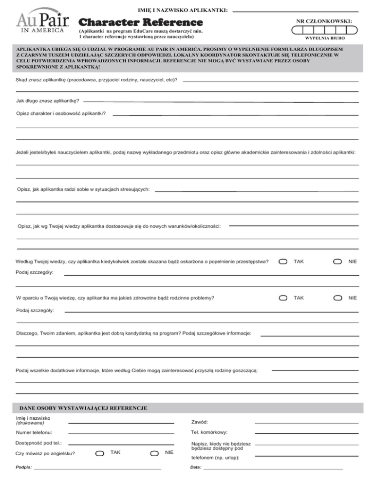 IMIĘ I NAZWISKO APLIKANTKI: Character Reference NR CZŁONKOWSKI: (Aplikantki na program EduCare muszą dostarczyć min. 1 character referencje wystawioną przez nauczyciela) WYPEŁNIA BIURO APLIKANTKA UBIEGA SIĘ O UDZIAŁ W PROGRAMIE AU PAIR IN AMERICA. PROSIMY O WYPEŁNIENIE FORMULARZA DLUGOPISEM Z CZARNYM TUSZEM UDZIELAJĄC SZCZERYCH ODPOWIEDZI. LOKALNY KOORDYNATOR SKONTAKTUJE SIĘ TELEFONICZNIE W CELU POTWIERDZENIA WPROWADZONYCH INFORMACJI. REFERENCJE NIE MOGĄ BYĆ WYSTAWIANE PRZEZ OSOBY SPOKREWNIONE Z APLIKANTKĄ! Skąd znasz aplikantkę (pracodawca, przyjaciel rodziny, nauczyciel, etc)? Jak długo znasz aplikantkę? Opisz charakter i osobowość aplikantki? Jeżeli jesteś/byłeś nauczycielem aplikantki, podaj nazwę wykładanego przedmiotu oraz opisz główne akademickie zainteresowania i zdolności aplikantki: Opisz, jak aplikantka radzi sobie w sytuacjach stresujących: Opisz, jak wg Twojej wiedzy aplikantka dostosowuje się do nowych warunków/okoliczności: Według Twojej wiedzy, czy aplikantka kiedykolwiek została skazana bądź oskarżona o popełnienie przestępstwa? TAK NIE TAK NIE Podaj szczegóły: W oparciu o Twoją wiedzę, czy aplikantka ma jakieś zdrowotne bądź rodzinne problemy? Podaj szczegóły: Dlaczego, Twoim zdaniem, aplikantka jest dobrą kandydatką na program? Podaj szczegółowe informacje: Podaj wszelkie dodatkowe informacje, które według Ciebie mogą zainteresować przyszłą rodzinę goszczącą: DANE OSOBY WYSTAWIAJĄCEJ REFERENCJE Imię i nazwisko (drukowane) Zawód: Numer telefonu: Tel. komórkowy: Dostępność pod tel.: Napisz, kiedy nie będziesz będziesz dostępny pod Czy mówisz po angielsku? TAK Podpis: ____________________________________________________ NIE telefonem (np. urlop): Data: _________________________________________________________