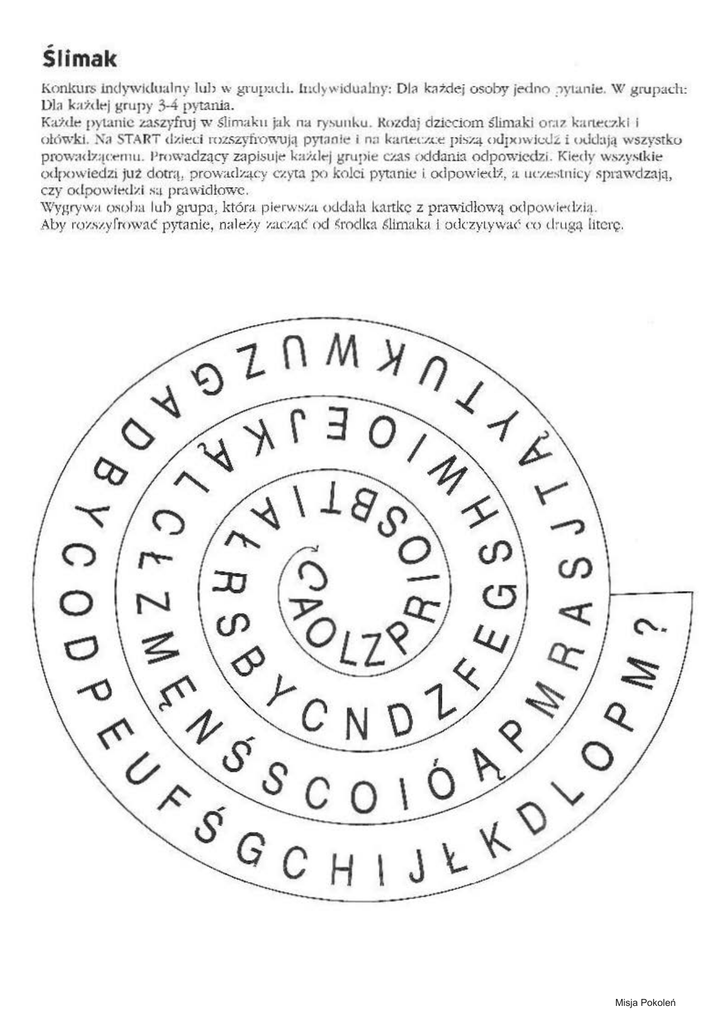 Ślimak Konkurs indywidualny luh w grupach. Indywidualny: Dla kat.<łej osoby jedno ,1y1.a1iit:. \V/ grupach: Dla k:1żdt:j grupy 3-4 pytania. Każdt: pytanie zaszyfruj w ślimaku j:Lk na ry~u11"u . Rozdaj dzieciom ślimaki or:11. kartt:o.ki i ołówki. N"ll ST1\RT d:r.ieci rozszyfiX)V.'Ują pytan ie i na kan.ec„.t:e pis7.ą ou1x1wi<..:d:G i 01.kbją wszystko prov."t1dz:1c:t'mu. Prowadzący z:1pi.suje:: ka:i.cl..-j grupit: czas oddania odpowiedzi. Kiedy ws1.y.~1kie odpowiedzi już d.otr<!: prowacl:r.ący czym po k11lci pyt:mic i. odpowiedz, a uczesl11icy sprawd zają, czy odpowit:d:d s:1 prmviclłowc. \'Vygryw;1 c.isc.ilia lub giupa, która pie rwsl.:Lc>dd<1ła kartkc z p ra"l'liidlow:l odpow il'dzh1. Aby rozs:t.yfrować pyt~nie, nale:i.y 7.ao.at~ nd ~rocl lrn ślimaka i ~'dczyt.yw<H' co d :·ug:~ litcrg. "" o o o Misja Pokoleń