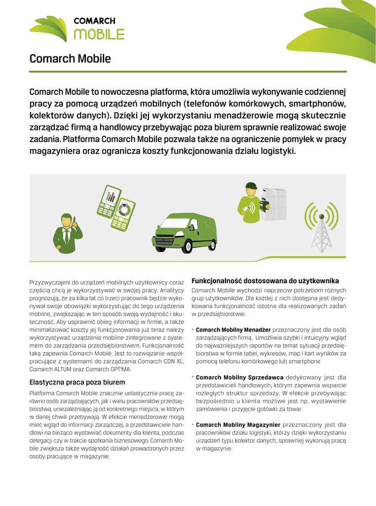 Comarch Mobile Comarch Mobile to nowoczesna platforma, która umożliwia wykonywanie codziennej pracy za pomocą urządzeń mobilnych (telefonów komórkowych, smartphonów, kolektorów danych). Dzięki jej wykorzystaniu menadżerowie mogą skutecznie zarządzać firmą a handlowcy przebywając poza biurem sprawnie realizować swoje zadania. Platforma Comarch Mobile pozwala także na ograniczenie pomyłek w pracy magazyniera oraz ogranicza koszty funkcjonowania działu logistyki. Przyzwyczajeni do urządzeń mobilnych użytkownicy coraz częścią chcą je wykorzystywać w swojej pracy. Analitycy prognozują, że za kilka lat co trzeci pracownik będzie wykonywał swoje obowiązki wykorzystując do tego urządzenia mobilne, zwiększając w ten sposób swoją wydajność i skuteczność. Aby usprawnić obieg informacji w firmie, a także minimalizować koszty jej funkcjonowania już teraz należy wykorzystywać urządzenia mobilne zintegrowane z systemem do zarządzania przedsiębiorstwem. Funkcjonalność taką zapewnia Comarch Mobile. Jest to rozwiązanie współpracujące z systemami do zarządzania Comarch CDN XL, Comarch ALTUM oraz Comarch OPT!MA. Elastyczna praca poza biurem Platforma Comarch Mobile znacznie uelastycznia pracę zarówno osób zarządzających, jak i wielu pracowników przedsiębiorstwa, uniezależniając ją od konkretnego miejsca, w którym w danej chwili przebywają. W efekcie menadżerowie mogą mieć wgląd do informacji zarządczej, a przedstawiciele handlowi na bieżąco wystawiać dokumenty dla klienta, podczas delegacji czy w trakcie spotkania biznesowego. Comarch Mobile zwiększa także wydajność działań prowadzonych przez osoby pracujące w magazynie. Funkcjonalność dostosowana do użytkownika Comarch Mobile wychodzi naprzeciw potrzebom różnych grup użytkowników. Dla każdej z nich dostępna jest dedykowana funkcjonalność istotna dla realizowanych zadań w przedsiębiorstwie: • Comarch Mobilny Menadżer przeznaczony jest dla osób zarządzających firmą. Umożliwia szybki i intuicyjny wgląd do najważniejszych raportów na temat sytuacji przedsiębiorstwa w formie tabel, wykresów, map i kart wyników za pomocą telefonu komórkowego lub smartphone • Comarch Mobilny Sprzedawca dedykowany jest dla przedstawicieli handlowych, którym zapewnia wsparcie rozległych struktur sprzedaży. W efekcie przebywając bezpośrednio u klienta możliwe jest np. wystawienie zamówienia i przyjęcie gotówki za towar • Comarch Mobilny Magazynier przeznaczony jest dla pracowników działu logistyki, którzy dzięki wykorzystaniu urządzeń typu kolektor danych, sprawniej wykonują pracę w magazynie. Comarch Mobilny Sprzedawca W warunkach ostrej konkurencji rynkowej firmy prześcigają się w sposobach na zdobycie nowych klientów. Aby firma sprzedająca towary bezpośrednio u nabywców mogła być jak najbliżej swoich klientów potrzebne jest odpowiednie wsparcie. Gwarantuje je Comarch Mobilny Sprzedawca – nowoczesne rozwiązanie stworzone z myślą o przedstawicielach handlowych. Jakie możliwości daje Comarch Mobilny Sprzedawca? Dzięki aplikacji Comarch Mobilny Sprzedawca możliwa jest elastyczna sprzedaż poza biurem, praktycznie w każdym miejscu i o każdej porze. Codzienne zadania opiekuna handlowego stają się łatwiejsze w wykonaniu, co przekłada się na wzrost przychodów. Mobilność się opłaca Praca z wykorzystaniem Comarch Mobilny Sprzedawca przynosi liczne korzyści, zarówno dla bezpośredniego użytkownika, jak i dla całości przedsiębiorstwa: • usprawnienie pracy przedstawiciela handlowego, • wsparcie w powiększaniu udziału w rynku, • możliwość szybkiej reakcji na potrzeby klienta, • natychmiastowy dostęp do niezbędnych informacji zgromadzonych w systemach do zarządzania, z każdego miejsca i o każdej porze, • mobilne wsparcie dla rozległej działalności sprzedażowej i marketingowej, • skrócenie czasu obsługi klienta, • minimalizacja kosztów procesu sprzedażowego, • budowanie innowacyjnego wizerunku dzięki wykorzystaniu nowoczesnych technologii. Dzięki integracji z systemami ERP dostarczanymi przez Comarch przedstawiciel handlowy przebywając w terenie może mieć dostęp do informacji zgromadzonych w systemie do zarządzania firmą. Rozwiązanie pozwala także na tworzenie dokumentu np. faktury u klienta uwzględniając przysługujące mu promocje. Ponadto przedstawiciel handlowy ma wgląd do należności poszczególnych kontrahentów, które może na bieżąco egzekwować. W efekcie cały proces sprzedaży można sfinalizować już w trakcie wizyty u kontrahenta. Comarch Mobile pozwala na zarządzanie pracą przedstawicieli handlowych umożliwiając m.in. planowanie wizyt handlowych, w ramach których przygotowujemy listę klientów, których powinien odwiedzić nasz pracownik. Osoba zarządzająca ma możliwość wyznaczenia zadań, które mają być zrealizowane podczas wizyty handlowej. Zadaniem może być przyjęcie zamówienia, gotówki czy też wprowadzenie informacji na temat poziomu zadowolenia kontrahenta ze współpracy czy sposobu prezentacji oferowanych produktów. Narzędzie umożliwia także rejestrację danych na temat przejazdu czy czasu rozpoczęcia i zakończenia konkretnego spotkania, w efekcie czego osoba zarządzająca pracą przedstawicieli handlowych ma pełną informację na temat prowadzonych przez nich działań. Z poziomu urządzenia mobilnego użytkownik ma również wgląd do celów, które musi osiągnąć. Plan sprzedaży może być utworzony na obsługiwany rejon, grupę kontrahentów lub grupę towarów. Sprzedawca może na bieżąco monitorować zarówno założony plan, jak i jego dotychczasową realizację. Rys. 1 Formatka tworzenia dokumentu KP umożliwia wybranie z listy kontrahenta uiszczającego płatność, ustalenie kwoty wpłaty, oraz dodanie opisu. Rys. 2 Na ekranie urządzenia mobilinego sprzedawca ma możliwość Użytkownik może także pracować