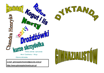 Teksty zebrały i opracowały: Maria Tyszkiewicz - Wieja Elżbieta Michalska e-mail [email protected] http://www.gimnazpiechowice.prv.pl Różne zawody Chryzantemy pani Hani Nauczyciel szkoły średniej wybrał się z uczniami do zakładów Pani Hania była dobrą i bardzo hojną staruszką. Mieszkała w pracy, aby poznali różne zawody. Najpierw wybrali się do huty, gdzie niewielkiej chałupce pod Chełmem. Całymi godzinami oddawała się wytapia się stal. Rozmawiali z hutnikami o ciężkiej harówce. Zwiedzali swemu hobby, jakim była hodowla chryzantem, chabrów i hortensji. cala hutę, wchodzili do poszczególnych hal. Oglądali suwnicę z wielkimi Wieczorami uwielbiała czytać książki historyczne. hakami. Następnie, zwiedzając piekarnię, dowiedzieli się, jak piecze Pewnego spokojnego wieczoru zerwał się straszny huragan, się chleb, obejrzeli piec chlebowy, chwalili wypiekane pieczywo. którego pani Hania śmiertelnie się przeraziła. Jej ogród zamienił się w Ponieważ było dużo chętnych, musieli chodzić grupami, aby poznać jeden wielki hulający harmider. Bohaterka wpadła w histerię, ale dokładnie charakter pracy poszczególnych zawodów. hamowała ją myśl, że jest chora na nadciśnienie i postanowiła zaparzyć Wszystkich zawodów nie udało się zaprezentować, ale uczniowie i tak byli zadowoleni z wycieczki. sobie herbatę z ziółek. Gdy huragan ucichł, zajrzała do swojego ukochanego ogrodu. Uratowały się tylko hortensje, które schowały się pod niewielkim Katarzyna Cwetschek II a drzewkiem hebanowym. Siedząc na ogrodowym hamaku i rozpaczając, pani Hania zauważyła w chaszczach malutkiego kota. Zabrała go do domu i nakarmiła chudzinę schłodzonym mlekiem. Nazwała go Herman. Dorota Kaczorowska II a Hodowca Henryk mieszkał na Helu razem z żoną i dwójką dzieci. Zajmował Pani Helena się hodowlą rzadko spotykanych roślin. W tym celu wynajął ogromną, ocieplaną halę. Było to mało opłacalne hobby i nie dawało zarobić na Pani Helena jest to sześćdziesięciotrzyletnia emerytka z chleb, dlatego utrzymaniem rodziny zajmowała się żona Halina. Chełma. Ma kochającego męża Henryka i dwóch synów, Hieronima i Pracowała w pobliskiej szkole, ucząc dziewczęta haftu. Ich starsza Huberta, Którzy obecnie mieszkają w Chorzowie. Z wykształcenia była córka studiowała chemię na holenderskim uniwersytecie. Choć był to historykiem, ponieważ interesowały ją dzieje Polski i świata. Oprócz dodatkowy wydatek, nie żałowali tej decyzji, ponieważ Hania chętnie tego hodowała wiele gatunków kwiatów. W jej kolekcji znaleźć można przykładała się do nauki. Syn Hubert był harcerzem i chętnie grywał na barwne hiacynty, piękne hortensje i różnokolorowe róże. harmonijce przy ognisku. Sąsiedzi chwalili Hanię i jej brata, więc Uwielbiała zwierzęta, dlatego trzymała w domu małą charciczkę, która pewnego razu, wykazując się horrendalna głupotą, stłukła rodzice byli dumni ze swych pociech. Małgorzata Porębska II a zabytkową chińską porcelanę stojącą na komodzie z czarnego hebanu. W południe pani Helena zapraszała do siebie sąsiadkę – panią Hannę, której synowie studiowali na Uniwersytecie w Harvardzie, co było chlubą matki. Nieraz razem haftowały różnobarwne wzory na białych serwetach i tak czas mijał im aż do wieczora. Marek Job II a Chichoczący duch Drożdżówki Panowała duchota. Noc nadchodziła cicho, nie było słychać nawet W pewien dżdżysty, chłodny wieczór przemoczony przechodzień chrząszczy. Wyszliśmy z kuchni przytuleni do chłodnego, pachnącego schronił się do małej, schludnej kawiarenki, która była chlubą miasta. stęchlizną muru. Czekaliśmy na ducha. Ze strach aż burczało mi w Sprzedawał w niej charakterystyczny chłopina – chudy, cherlawy, ale z brzuchu. Bałam się, że niechcący kichnę. Po chwili rozległ się upiorny olbrzymią charyzmą. śmiech ducha. Chichotał gdzieś wysoko na dachu. Stałam cichuteńko, Przechodzień wstąpił na małą herbatkę. Rozejrzał się uważnie i słuchałam oniemiała. Duch chodził po strychu, hulał po dachu z blachy. zachwycił obrusami wyhaftowanymi w smoki, srebrnymi świecznikami Nie opuszczał go dobry humor, wciąż chichotał. Nagle rozległ się huk. oraz zastawą, która liczyła sobie ze trzysta lat. Wkoło ludzie chuchali To duch spadł na chodnik. Uciekliśmy w popłochu. na gorące kawy i zajadali się pysznymi drożdżówkami. Nasz bohater musiał szybko wyjść z kawiarenki, zorientował się, że nie wziął portfela. Basia Przybycień II a Aga Iskrzycka II a Rzeźbiarz Nad niewielką rzeczką mieszkał rzeźbiarz z żoną i gromadką dzieci. Gdy tylko mgła nad rzeczułką zaczęła rzednąc, budził się ów Hrabia żarłok. Po porannym obrządku zwierząt w gospodarstwie wyruszał do Przepyszna poszóstna kareta pędziła co koń wyskoczy po pracy w Żyrardowie. Ponieważ był jedynym żywicielem rodziny, oprócz wyboistej drodze. Nagle stangret ściągnął lejce, a konie dziko zarżały pracy w swym ulubionym rzemiośle, zajmował się żeglarstwem. i zahamowały tak, że przed ich kopytami urosła niewielka hałda ziemi. Gdy przyjeżdżał do domu po długiej podróży, od razu oblegała To zając hultaj przeciął im drogę i hyc! – wskoczył w chaszcze. go grupka żwawych chłopców. Jeden z nich był już uczniem w „Hańba!” – huknął hrabia wychodząc z powozu. Na głowie miał perukę z żyrardowskiej szkole. Pilnym był on żakiem, przez co przynosił harcapem – teraz nieco zsuniętą na oczy – w ręku trzymał wachlarz z zaszczyt swym rodzicom – rzeźbiarzowi i jego małżonce. wyhaftowanym cherubinem. Pod szyją pysznił się halsztuk. Hajducy Małgorzata Porębska II a hardo poczęli poprawiać jego zmięty strój. Zza snopków siana dało się słyszeć chichotanie chłopów, którzy przerwali na chwilę harówkę w polu. Hrabia chrząknął groźnie i zw