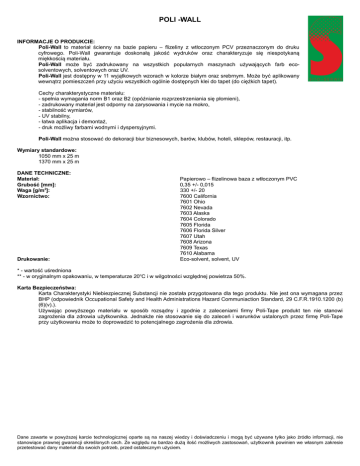 POLI -WALL INFORMACJE O PRODUKCIE: Poli-Wall to materiał ścienny na bazie papieru – flizeliny z wtłoczonym PCV przeznaczonym do druku cyfrowego. Poli-Wall gwarantuje doskonałą jakość wydruków oraz charakteryzuje się niespotykaną miękkością materiału. Poli-Wall może być zadrukowany na wszystkich popularnych maszynach używających farb ecosolventowych, solventowych oraz UV. Poli-Wall jest dostępny w 11 wyjątkowych wzorach w kolorze białym oraz srebrnym. Może być aplikowany wewnątrz pomieszczeń przy użyciu wszystkich ogólnie dostępnych klei do tapet (do ciężkich tapet). Cechy charakterystyczne materiału: - spełnia wymagania norm B1 oraz B2 (opóźnianie rozprzestrzeniania się płomieni), - zadrukowany materiał jest odporny na zarysowania i mycie na mokro, - stabilność wymiarów, - UV stabilny, - łatwa aplikacja i demontaż, - druk możliwy farbami wodnymi i dyspersyjnymi. Poli-Wall można stosować do dekoracji biur biznesowych, barów, klubów, hoteli, sklepów, restauracji, itp. Wymiary standardowe: 1050 mm x 25 m 1370 mm x 25 m DANE TECHNICZNE: Materiał: Grubość [mm]: Waga [g/m2]: Wzornictwo: Drukowanie: Papierowo – flizelinowa baza z wtłoczonym PVC 0,35 +/- 0,015 330 +/- 20 7600 California 7601 Ohio 7602 Nevada 7603 Alaska 7604 Colorado 7605 Florida 7606 Florida Silver 7607 Utah 7608 Arizona 7609 Texas 7610 Alabama Eco-solvent, solvent, UV * - wartość uśredniona ** - w oryginalnym opakowaniu, w temperaturze 20oC i w wilgotności względnej powietrza 50%. Karta Bezpieczeństwa: Karta Charakterystyki Niebiezpiecznej Substancji nie została przygotowana dla tego produktu. Nie jest ona wymagana przez BHP (odpowiednik Occupational Safety and Health Administrations Hazard Communiaction Standard, 29 C.F.R.1910.1200 (b) (6)(v).). Używając powyższego materiału w sposób rozsądny i zgodnie z zaleceniami firmy Poli-Tape produkt ten nie stanowi zagrożenia dla zdrowia użytkownika. Jednakże nie stosowanie się do zaleceń i warunków ustalonych przez firmę Poli-Tape przy użytkowaniu może to doprowadzić to potencjalnego zagrożenia dla zdrowia. Dane zawarte w powyższej karcie technologicznej oparte są na naszej wiedzy i doświadczeniu i mogą być używane tylko jako źródło informacji, nie stanowiące prawnej gwarancji określonych cech. Ze względu na bardzo dużą ilość możliwych zastosowań, użytkownik powinien we własnym zakresie przetestować dany materiał dla swoich potrzeb, przed ostatecznym użyciem.