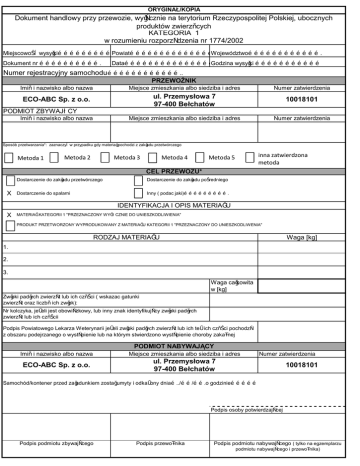 ORYGINAŁ/KOPIA Dokument handlowy przy przewozie, wyłącznie na terytorium Rzeczypospolitej Polskiej, ubocznych produktów zwierzęcych KATEGORIA 1 w rozumieniu rozporządzenia nr 1774/2002 Miejscowość wysyłki……………………………… Powiat…………………………………… Województwo………………………………. Dokument nr …………………………. Data……………………………………… Godzina wysyłki …………………………… Numer rejestracyjny samochodu ……………………………….. PRZEWOŹNIK Imię i nazwisko albo nazwa Miejsce zmieszkania albo siedziba i adres Numer zatwierdzenia ECO-ABC Sp. z o.o. ul. Przemysłowa 7 97-400 Bełchatów 10018101 Miejsce zmieszkania albo siedziba i adres Numer zatwierdzenia PODMIOT ZBYWAJĄCY Imię i nazwisko albo nazwa Sposób przetwarzania*: zaznaczyć w przypadku gdy materiał pochodzi z zakładu przetwórczego Metoda 1 Metoda 2 Metoda 3 Metoda 4 inna zatwierdzona metoda Metoda 5 CEL PRZEWOZU* X Dostarczenie do zakładu przetwórczego Dostarczenie do zakładu pośredniego Dostarczenie do spalarni Inny ( podac jaki)………………………. IDENTYFIKACJA I OPIS MATERIAŁU X MATERIAŁ KATEGORII 1 "PRZEZNACZONY WYŁĄCZNIE DO UNIESZKODLIWIENIA" PRODUKT PRZETWORZONY WYPRODUKOWANY Z MATERIAŁU KATEGORII 1 "PRZEZNACZONY DO UNIESZKODLIWENIA" RODZAJ MATERIAŁU Waga [kg] 1. 2. 3. Waga całkowita w [kg] Zwłoki padłych zwierząt lub ich części ( wskazac gatunki zwierząt oraz liczbę ich zwłok): Nr kolczyka, jeżeli jest obowiązkowy, lub inny znak identyfikujący zwłoki padłych zwierząt lub ich częścii Podpis Powiatowego Lekarza Weterynarii jeżeli zwłoki padłych zwierząt lub ich też ich części pochodzą z obszaru podejrzanego o wystąpienie lub na którym stwierdzono wystąpienie choroby zakaźnej PODMIOT NABYWAJĄCY Imię i nazwisko albo nazwa Miejsce zmieszkania albo siedziba i adres ECO-ABC Sp. z o.o. ul. Przemysłowa 7 97-400 Bełchatów Numer zatwierdzenia 10018101 Samochód/kontener przed załadunkiem został umyty i odkażony dnia…../……/…….o godzinie…………… Podpis osoby potwierdzającej Podpis podmiotu zbywającego Podpis przewoźnika Podpis podmiotu nabywającego ( tylko na egzemplarzu podmiotu nabywającego i przewoźnika)