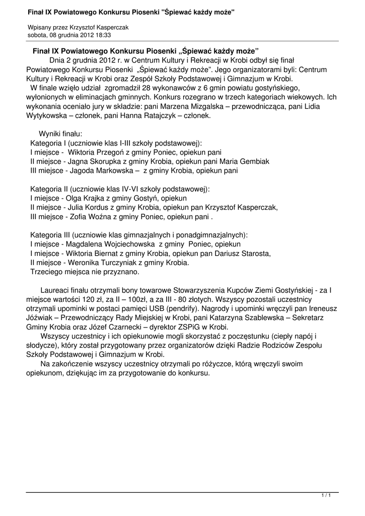 Finał IX Powiatowego Konkursu Piosenki "Śpiewać każdy może" Wpisany przez Krzysztof Kasperczak sobota, 08 grudnia 2012 18:33 Finał IX Powiatowego Konkursu Piosenki „Śpiewać każdy może” Dnia 2 grudnia 2012 r. w Centrum Kultury i Rekreacji w Krobi odbył się finał Powiatowego Konkursu Piosenki „Śpiewać każdy może”. Jego organizatorami byli: Centrum Kultury i Rekreacji w Krobi oraz Zespół Szkoły Podstawowej i Gimnazjum w Krobi. W finale wzięło udział zgromadził 28 wykonawców z 6 gmin powiatu gostyńskiego, wyłonionych w eliminacjach gminnych. Konkurs rozegrano w trzech kategoriach wiekowych. Ich wykonania oceniało jury w składzie: pani Marzena Mizgalska – przewodnicząca, pani Lidia Wytykowska – członek, pani Hanna Ratajczyk – członek. Wyniki finału: Kategoria I (uczniowie klas I-III szkoły podstawowej): I miejsce - Wiktoria Przegoń z gminy Poniec, opiekun pani II miejsce - Jagna Skorupka z gminy Krobia, opiekun pani Maria Gembiak III miejsce - Jagoda Markowska – z gminy Krobia, opiekun pani Kategoria II (uczniowie klas IV-VI szkoły podstawowej): I miejsce - Olga Krajka z gminy Gostyń, opiekun II miejsce - Julia Kordus z gminy Krobia, opiekun pan Krzysztof Kasperczak, III miejsce - Zofia Woźna z gminy Poniec, opiekun pani . Kategoria III (uczniowie klas gimnazjalnych i ponadgimnazjalnych): I miejsce - Magdalena Wojciechowska z gminy Poniec, opiekun I miejsce - Wiktoria Biernat z gminy Krobia, opiekun pan Dariusz Starosta, II miejsce - Weronika Turczyniak z gminy Krobia. Trzeciego miejsca nie przyznano. Laureaci finału otrzymali bony towarowe Stowarzyszenia Kupców Ziemi Gostyńskiej - za I miejsce wartości 120 zł, za II – 100zł, a za III - 80 złotych. Wszyscy pozostali uczestnicy otrzymali upominki w postaci pamięci USB (pendrify). Nagrody i upominki wręczyli pan Ireneusz Jóźwiak – Przewodniczący Rady Miejskiej w Krobi, pani Katarzyna Szablewska – Sekretarz Gminy Krobia oraz Józef Czarnecki – dyrektor ZSPiG w Krobi. Wszyscy uczestnicy i ich opiekunowie mogli skorzystać z poczęstunku (ciepły napój i słodycze), który został przygotowany przez organizatorów dzięki Radzie Rodziców Zespołu Szkoły Podstawowej i Gimnazjum w Krobi. Na zakończenie wszyscy uczestnicy otrzymali po różyczce, którą wręczyli swoim opiekunom, dziękując im za przygotowanie do konkursu. 1/1