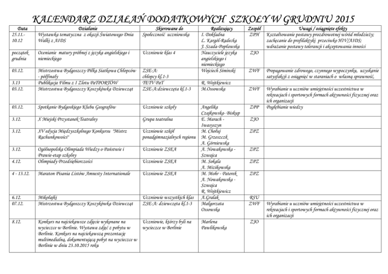 KALENDARZ DZIAŁAŃ DODATKOWYCH SZKOŁY W GRUDNIU 2015