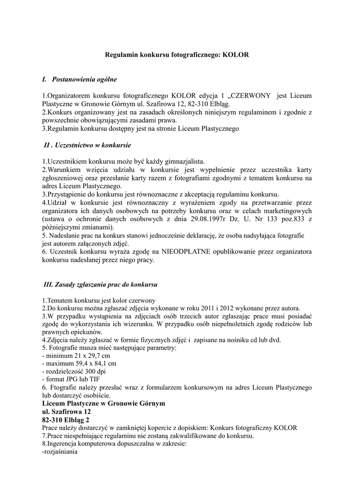 Regulamin konkursu fotograficznego: KOLOR I. Postanowienia ogólne 1.Organizatorem konkursu fotograficznego KOLOR edycja 1 „CZERWONY jest Liceum Plastyczne w Gronowie Górnym ul. Szafirowa 12, 82-310 Elbląg. 2.Konkurs organizowany jest na zasadach określonych niniejszym regulaminem i zgodnie z powszechnie obowiązującymi zasadami prawa. 3.Regulamin konkursu dostępny jest na stronie Liceum Plastycznego II . Uczestnictwo w konkursie 1.Uczestnikiem konkursu może być każdy gimnazjalista. 2.Warunkiem wzięcia udziału w konkursie jest wypełnienie przez uczestnika karty zgłoszeniowej oraz przesłanie karty razem z fotografiami zgodnymi z tematem konkursu na adres Liceum Plastycznego. 3.Przystąpienie do konkursu jest równoznaczne z akceptacją regulaminu konkursu. 4.Udział w konkursie jest równoznaczny z wyrażeniem zgody na przetwarzanie przez organizatora ich danych osobowych na potrzeby konkursu oraz w celach marketingowych (ustawa o ochronie danych osobowych z dnia 29.08.1997r Dz. U. Nr 133 poz.833 z późniejszymi zmianami). 5. Nadesłanie prac na konkurs stanowi jednocześnie deklarację, że osoba nadsyłająca fotografie jest autorem załączonych zdjęć. 6. Uczestnik konkursu wyraża zgodę na NIEODPŁATNE opublikowanie przez organizatora konkursu nadesłanej przez niego pracy. III. Zasady zgłaszania prac do konkursu 1.Tematem konkursu jest kolor czerwony 2.Do konkursu można zgłaszać zdjęcia wykonane w roku 2011 i 2012 wykonane przez autora. 3.W przypadku wystąpienia na zdjęciach osób trzecich autor zgłaszając prace musi posiadać zgodę do wykorzystania ich wizerunku. W przypadku osób niepełnoletnich zgodę rodziców lub prawnych opiekunów. 4.Zdjęcia należy zgłaszać w formie fizycznych zdjęć i zapisane na nośniku cd lub dvd. 5. Fotografie musza mieć następujące parametry: - minimum 21 x 29,7 cm - maximum 59,4 x 84,1 cm - rozdzielczość 300 dpi - format JPG lub TIF 6. Ftografie należy przesłać wraz z formularzem konkursowym na adres Liceum Plastycznego lub dostarczyć osobiście. Liceum Plastyczne w Gronowie Górnym ul. Szafirowa 12 82-310 Elbląg 2 Prace należy dostarczyć w zamkniętej kopercie z dopiskiem: Konkurs fotograficzny KOLOR 7.Prace niespełniające regulaminu nie zostaną zakwalifikowane do konkursu. 8.Ingerencja komputerowa dopuszczalna w zakresie: -rozjaśniania -przyciemniania -kadrowania -redukcji kolorów -zmianie kontrastu Nie dopuszczalny jest: kolaż w programach graficznych 9.Każdy uczestnik może zgłosić maksymalnie 5 prac. Może to być 1 fotografia lub cykl prac. IV. Termin nadsyłania prac: 25 maja 2012r. Decyduje data wpłynięcia pracy do siedziby szkoły. Komisja składająca się ze specjalistów w dziedzinie fotografii powołana przez Dyrektora Liceum Plastycznego zbierze się do dnia 31 maja 2012r. i dokona oceny prac V. Laureaci konkursu otrzymają dyplomy i nagrody. W konkursie zostaną przyznane nagrody: 1. pierwsze miejsce: bezpłatny udział w tygodniowym plenerze fotograficzno - malarskim organizowanym przez Liceum Plastyczne w Gronowie Górnym (w miesiącu czerwcu 2012) 2. drugie miejsce: aparat fotograficzny z kartą pamięci 3. trzecie miejsce: nagroda książkowa VI. Postanowienia końcowe 1.Organizatorzy zastrzegają sobie prawo do: - zmiany regulaminu konkursu - nie przyznania nagrody głównej w przypadku niespełnienia przez uczestników regulaminu konkursu lub niskiej wartości merytorycznej prac. 2.. Organizator nie odpowiada za uszkodzenie prac podczas przesyłki. 3. Organizator nie zwraca prac nadesłanych na konkurs. Komisarz konkursu: Karolina Hajec- Kalińska