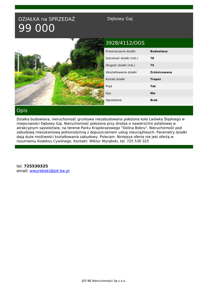 DZIAŁKA na SPRZEDAŻ Dębowy Gaj 99 000 3928/4112/OGS Przeznaczenie działki Budowlana Szerokość działki (mb.) 78 Długość działki (mb.) 75 Ukształtowanie działki Zróżnicowana Kształt działki Trapez Prąd Tak Gaz Nie Ogrodzenie Brak Opis Działka budowlana, nieruchomość gruntowa niezabudowana położona koło Lwówka Śląskiego w miejscowości Dębowy Gaj. Nieruchomość położona przy drodze o nawierzchni asfaltowej w atrakcyjnym sąsiedztwie, na terenie Parku Krajobrazowego "Dolina Bobru". Nieruchomość pod zabudowę mieszkaniową jednorodzinną z dopuszczeniem usług nieuciążliwych. Parametry działki dają duże możliwości kształtowania zabudowy. Polecam. Niniejsza oferta nie jest ofertą w rozumieniu Kodeksu Cywilnego. Kontakt: Wiktor Wyrębski, tel. 725 530 325 tel. 725530325 email: [email protected] JOT-BE Nieruchomości Sp.z o.o. Powered by TCPDF (www.tcpdf.org)