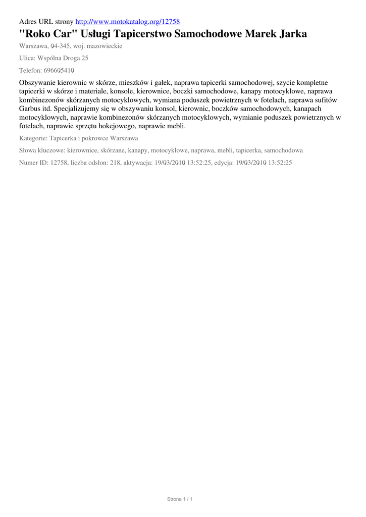 Adres URL strony http://www.motokatalog.org/12758 "Roko Car" Usługi Tapicerstwo Samochodowe Marek Jarka Warszawa, 04-345, woj. mazowieckie Ulica: Wspólna Droga 25 Telefon: 696605410 Obszywanie kierownic w skórze, mieszków i gałek, naprawa tapicerki samochodowej, szycie kompletne tapicerki w skórze i materiale, konsole, kierownice, boczki samochodowe, kanapy motocyklowe, naprawa kombinezonów skórzanych motocyklowych, wymiana poduszek powietrznych w fotelach, naprawa sufitów Garbus itd. Specjalizujemy się w obszywaniu konsol, kierownic, boczków samochodowych, kanapach motocyklowych, naprawie kombinezonów skórzanych motocyklowych, wymianie poduszek powietrznych w fotelach, naprawie sprzętu hokejowego, naprawie mebli. Kategorie: Tapicerka i pokrowce Warszawa Słowa kluczowe: kierownice, skórzane, kanapy, motocyklowe, naprawa, mebli, tapicerka, samochodowa Numer ID: 12758, liczba odsłon: 218, aktywacja: 19/03/2010 13:52:25, edycja: 19/03/2010 13:52:25 Strona 1 / 1