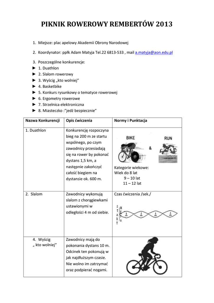 PIKNIK ROWEROWY REMBERTÓW 2013 1. Miejsce: plac apelowy Akademii Obrony Narodowej 2. Koordynator: ppłk Adam Matyja Tel.22 6813-533 , mail [email protected] 3. ► ► ► ► ► ► ► ► Poszczególne konkurencje: 1. Duathlon 2. Slalom rowerowy 3. Wyścig „kto wolniej” 4. Basketbike 5. Konkurs rysunkowy o tematyce rowerowej 6. Ergometry rowerowe 7. Strzelnica elektroniczna 8. Miasteczko :”jedź bezpiecznie” Nazwa Konkurencji Opis ćwiczenia 1. Duathlon Konkurencję rozpoczyna bieg na 200 m ze startu wspólnego, po czym zawodnicy przesiadają się na rower by pokonać dystans 1,5 km, a następnie zakończyć całość biegiem na dystansie ok. 600 m. 2. Slalom 4. Wyścig „ kto wolniej” Zawodnicy wykonują slalom z chorągiewkami ustawionymi w odległości 4 m od siebie. Zawodnicy mają do pokonania dystans 10 m. Odcinek ten pokonują w jak najdłuższym czasie. Nie wolno im zatrzymać oraz podpierać nogami. Normy i Punktacja Kategorie wiekowe: Wiek do 8 lat 9 – 10 lat 11 – 12 lat Czas ćwiczenia /sek./ 4. Basketbike Zawodnik ma do pokonania 3 rundy w trakcie których musi wykonać 3 rzuty różnymi piłkami: do kosza (piłką tenisową, do siatkówki i do koszykówki). 5. Konkurs Wszystkich chętnych rysunkowy o serdecznie zapraszamy tematyce rowerowej do wspólnego tworzenia prac w specjalnie stworzonym namiocie artystycznym. 6. Ergometry rowerowe Rywalizacja kto osiągnie najlepszy wynik. 7. Strzelnica elektroniczna. Strzelanie do celu. 8. Miasteczko :”jedź bezpiecznie” Miasteczko ruchu drogowego propagujące bezpieczne poruszanie się na drogach. 9. Spotkanie z ciekawym człowiekiem Gościem specjalnym będzie wybitny dziennikarz sportowy, komentator EUROSPORTU znawca kolarstwa Tomasz Jaroński