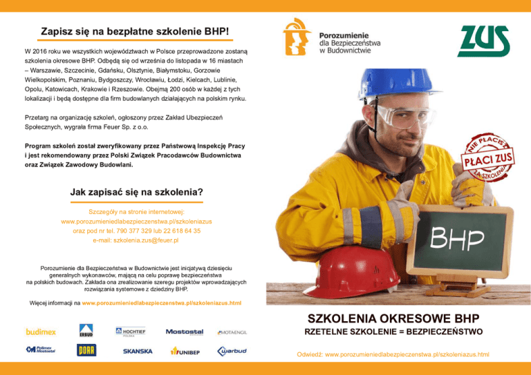 Zapisz się na bezpłatne szkolenie BHP! W 201 6 roku we wszystkich województwach w Polsce przeprowadzone zostaną szkolenia okresowe BHP. Odbędą się od września do listopada w 1 6 miastach – Warszawie, Szczecinie, Gdańsku, Olsztynie, Białymstoku, Gorzowie Wielkopolskim, Poznaniu, Bydgoszczy, Wrocławiu, Łodzi, Kielcach, Lublinie, Opolu, Katowicach, Krakowie i Rzeszowie. Obejmą 200 osób w każdej z tych lokalizacji i będą dostępne dla firm budowlanych działających na polskim rynku. Przetarg na organizację szkoleń, ogłoszony przez Zakład Ubezpieczeń Społecznych, wygrała firma Feuer Sp. z o.o. Program szkoleń został zweryfikowany przez Państwową Inspekcję Pracy i jest rekomendowany przez Polski Związek Pracodawców Budownictwa oraz Związek Zawodowy Budowlani. Jak zapisać się na szkolenia? Szczegóły na stronie internetowej: www.porozumieniedlabezpieczenstwa.pl/szkoleniazus oraz pod nr tel. 790 377 329 lub 22 61 8 64 35 e-mail: [email protected] Porozumienie dla Bezpieczeństwa w Budownictwie jest inicjatywą dziesięciu generalnych wykonawców, mającą na celu poprawę bezpieczeństwa na polskich budowach. Zakłada ona zrealizowanie szeregu projektów wprowadzających rozwiązania systemowe z dziedziny BHP. Więcej informacji na www.porozumieniedlabezpieczenstwa.pl/szkoleniazus.html SZKOLENIA OKRESOWE BHP RZETELNE SZKOLENIE = BEZPIECZEŃSTWO Odwiedź: www.porozumieniedlabezpieczenstwa.pl/szkoleniazus.html Co zyskasz, uczestnicząc w szkoleniach BHP? • Podniesiesz kwalifikacje swoich pracowników, nie płacąc za to. • Zdobędziesz realną, praktyczną wiedzę z zakresu bezpieczeństwa robót budowlanych, co będzie podstawą późniejszego bezpieczeństwa pracowników na budowie. Szkolenie BHP nie musi być nudne! Na podstawie doświadczeń i codziennej praktyki specjaliści firm Porozumienia dla Bezpieczeństwa w Budownictwie opracowali program szkoleń okresowych BHP. Nasze szkolenia są: • Masz wpływ na zmniejszenie liczby wypadków, zmniejszenie absencji w pracy, a przez to związanych z tym kosztów. Pamiętaj, że szkolenia okresowe są obowiązkowe. Przekonaj się o wartości szkoleń, skorzystaj z nich, włączając się w działania zmierzające do osiągnięcia głównego celu, jakim jest „zero wypadków” na budowach! • bezpłatne dla małych i średnich firm budowlanych, w całości sfinansowane przez ZUS, • „szyte na miarę”, stworzone na bazie naszych wspólnych doświadczeń, • stale aktualizowane o nowe wnioski z wypadków, dlatego posiadają wysoki poziom merytoryczny, • oparte na standardach i materiałach Porozumienia dla Bezpieczeństwa w Budownictwie, • rzetelne, prowadzone w ciekawy i niebanalny sposób, • koncentrują się na rzeczywistych zagrożeniach związanych z działalnością budowlaną, • zawierają praktyczne wskazówki, a ich program obejmuje ćwiczenia w praktyce, zgodnie z zasadą „Bez wiedzy, jak pracować, nie ma bezpiecznej pracy” . Michał Wasilewski Koordynator w Porozumieniu dla Bezpieczeństwa w Budownictwie WIEDZA UMIEJĘTNOŚĆ PRAKTYKA