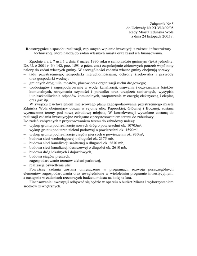 Załącznik Nr 5 do Uchwały Nr XLVI/409/05 Rady Miasta Zduńska Wola z dnia 24 listopada 2005 r. Rozstrzygniecie sposobu realizacji, zapisanych w planie inwestycji z zakresu infrastruktury technicznej, które należą do zadań własnych miasta oraz zasad ich finansowania. Zgodnie z art. 7 ust. 1 z dnia 8 marca 1990 roku o samorządzie gminnym (tekst jednolity: Dz. U. z 2001 r. Nr 142, poz. 1591 z późn. zm.) zaspokojenie zbiorowych potrzeb wspólnoty należy do zadań własnych gminy. W szczególności zadania własne gminy obejmują sprawy: − ładu przestrzennego, gospodarki nieruchomościami, ochrony środowiska i przyrody oraz gospodarki wodnej; − gminnych dróg, ulic, mostów, placów oraz organizacji ruchu drogowego; − wodociągów i zagospodarowanie w wodę, kanalizacji, usuwania i oczyszczania ścieków komunalnych, utrzymania czystości i porządku oraz urządzeń sanitarnych, wysypisk i unieszkodliwiania odpadów komunalnych, zaopatrzenia w energię elektryczną i cieplną oraz gaz itp. W związku z uchwaleniem miejscowego planu zagospodarowania przestrzennego miasta Zduńska Wola obejmujący obszar w rejonie ulic: Paprockiej, Głównej i Bocznej, zostaną wyznaczone tereny pod nową zabudowę miejską. W konsekwencji wywołane zostaną do realizacji zadania inwestycyjne związane z przystosowaniem terenu do zabudowy. Do zadań związanych z przystosowaniem terenu do zabudowy należą: − wykup gruntu pod realizację nowych dróg o powierzchni ok. 10705m2, − wykup gruntu pod teren zieleni parkowej o powierzchni ok. 1590m2, − wykup gruntu pod realizację ciągów pieszych o powierzchni ok. 930m2, - budowa sieci wodociągowej o długości ok. 2175 mb, − budowa sieci kanalizacji sanitarnej o długości ok. 2870 mb, − budowa sieci kanalizacji deszczowej o długości ok. 2610 mb, − budowa dróg lokalnych i dojazdowych, − budowa ciągów pieszych, - zagospodarowanie terenów zieleni parkowej, − realizacja oświetlenia ulic. Powyższe zadania zostaną umieszczone w programach rozwoju poszczególnych elementów zagospodarowania oraz uwzględnione w wieloletnim programie inwestycyjnym, a następnie w zadaniach rzeczowych budżetu miasta na kolejne lata. Finansowanie inwestycji odbywać się będzie w oparciu o budżet Miasta i wykorzystaniem środków zewnętrznych.