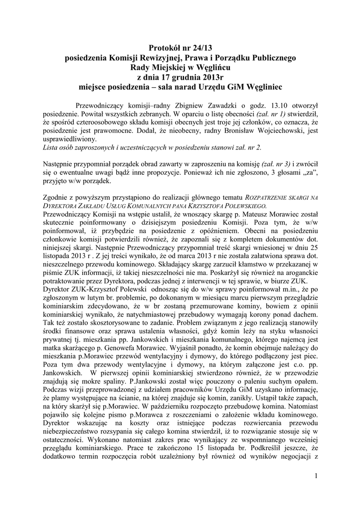 Protokół nr 24/13 posiedzenia Komisji Rewizyjnej, Prawa i Porządku Publicznego Rady Miejskiej w Węglińcu z dnia 17 grudnia 2013r miejsce posiedzenia – sala narad Urzędu GiM Węgliniec Przewodniczący komisji–radny Zbigniew Zawadzki o godz. 13.10 otworzył posiedzenie. Powitał wszystkich zebranych. W oparciu o listę obecności (zał. nr 1) stwierdził, że spośród czteroosobowego składu komisji obecnych jest troje jej członków, co oznacza, że posiedzenie jest prawomocne. Dodał, że nieobecny, radny Bronisław Wojciechowski, jest usprawiedliwiony. Lista osób zaproszonych i uczestniczących w posiedzeniu stanowi zał. nr 2. Następnie przypomniał porządek obrad zawarty w zaproszeniu na komisję (zał. nr 3) i zwrócił się o ewentualne uwagi bądź inne propozycje. Ponieważ ich nie zgłoszono, 3 głosami „za”, przyjęto w/w porządek. Zgodnie z powyższym przystąpiono do realizacji głównego tematu ROZPATRZENIE SKARGI NA DYREKTORA ZAKŁADU USŁUG KOMUNALNYCH PANA KRZYSZTOFA POLEWSKIEGO. Przewodniczący Komisji na wstępie ustalił, że wnoszący skargę p. Mateusz Morawiec został skutecznie poinformowany o dzisiejszym posiedzeniu Komisji. Poza tym, że w/w poinformował, iż przybędzie na posiedzenie z opóźnieniem. Obecni na posiedzeniu członkowie komisji potwierdzili również, że zapoznali się z kompletem dokumentów dot. niniejszej skargi. Następnie Przewodniczący przypomniał treść skargi wniesionej w dniu 25 listopada 2013 r . Z jej treści wynikało, że od marca 2013 r nie została załatwiona sprawa dot. nieszczelnego przewodu kominowego. Składający skargę zarzucił kłamstwo w przekazanej w piśmie ZUK informacji, iż takiej nieszczelności nie ma. Poskarżył się również na aroganckie potraktowanie przez Dyrektora, podczas jednej z interwencji w tej sprawie, w biurze ZUK. Dyrektor ZUK-Krzysztof Polewski odnosząc się do w/w sprawy poinformował m.in., że po zgłoszonym w lutym br. problemie, po dokonanym w miesiącu marcu pierwszym przeglądzie kominiarskim zdecydowano, że w br zostaną przemurowane kominy, bowiem z opinii kominiarskiej wynikało, że natychmiastowej przebudowy wymagają korony ponad dachem. Tak też zostało skosztorysowane to zadanie. Problem związanym z jego realizacją stanowiły środki finansowe oraz sprawa ustalenia własności, gdyż komin leży na styku własności prywatnej tj. mieszkania pp. Jankowskich i mieszkania komunalnego, którego najemcą jest matka skarżącego p. Genowefa Morawiec. Wyjaśnił ponadto, że komin obejmuje należący do mieszkania p.Morawiec przewód wentylacyjny i dymowy, do którego podłączony jest piec. Poza tym dwa przewody wentylacyjne i dymowy, na którym załączone jest c.o. pp. Jankowskich. W pierwszej opinii kominiarskiej stwierdzono również, że w przewodzie znajdują się mokre spaliny. P.Jankowski został więc pouczony o paleniu suchym opałem. Podczas wizji przeprowadzonej z udziałem pracowników Urzędu GiM uzyskano informację, że plamy występujące na ścianie, na której znajduje się komin, zanikły. Ustąpił także zapach, na który skarżył się p.Morawiec. W październiku rozpoczęto przebudowę komina. Natomiast pojawiło się kolejne pismo p.Morawca z roszczeniami o założenie wkładu kominowego. Dyrektor wskazując na koszty oraz istniejące podczas rozwiercania przewodu niebezpieczeństwo rozsypania się całego komina stwierdził, iż to rozwiązanie stosuje się w ostateczności. Wykonano natomiast zakres prac wynikający ze wspomnianego wcześniej przeglądu kominiarskiego. Prace te zakończono 15 listopada br. Podkreślił jeszcze, że dodatkowo termin rozpoczęcia robót uzależniony był również od wyników negocjacji z 1 p.Jankowskim nt. jego udziału w kosztach tego przedsięwzięcia. Z dalszych wyjaśnień wynikało, iż ostatnia opinia kominiarska wykazała nieszczelność między przewodami oraz nieszczelność komina na połączeniu strychu. Dyrektor stwierdził, że prace te zostaną wykonane do końca I kwartału przyszłego roku. Podkreślił także, że zakład nie widzi podstaw do wykonania wkładu kominowego mieszkania stanowiącego własność p.Jankowskiego. Pytany o to dlaczego nie wykonano zleconego pomiaru na obecność tlenku węgla, poinformował, iż uzyskał informację, że jeżeli w opinii nie ma o tym zapisu oznacza, że tlenku nie ma. Dodał, że w innym przypadku zostałoby wydane zalecenie wyłączenia komina z eksploatacji. Przewodniczący Komisji wyraził zdziwienie, podkreślając, że cały czas w pismach skarżącego mówi się o substancjach toksycznych, czadzie i spalinach. Radna Wanda Batog zauważyła, że przeprowadzone prace nic nie wniosły, bo ani nie polepszyły ani nie pogorszyły stanu wykazywanego w skardze. Natomiast okazuje się, że przewody są nieszczelne na całej długości. Dyrektor zauważył, że wynika to dopiero z opinii kominiarskiej otrzymanej w miesiącu grudniu. Po odczytaniu przez prowadzącego obrady treści w/w opinii, Dyrektor podkreślił, że dalsze działanie ZUK polegało będzie na wyjaśnieniu, dlaczego mimo zlecenia, nie została dokonana kontrola pomiaru tlenku węgla. Poza tym w związku z ponownym stwierdzeniem występowania w przewodzie mokrych spalin, na wystąpieniu do p.Jankowskiego o założenie wkładu kominowego, albo przemurowanie kominu. Zlecone zostanie także otynkowanie, celem zlikwidowania nieszczelności na poziomie dachu. Pytany przez Przewodniczącego Rady Waldemara Błauciaka, co będzie w przypadku, gdy zainteresowany nie zgodzi się na żądania ZUK, Dyrektor wskazał tryb Nadzoru Budowlanego, w ramach którego wydane zostanie orzeczenie o sposobie usunięcia usterek, rozstrzygające nie co do winy, a do bezpieczeństwa obiektu. Dyrektor wskazując na kwestię bezpieczeństwa skarżącego, zobowiązał się również do zakupu dla w/w czujnika tlenku węgla. Poza tym powiedział, że w br zostanie wystosowane pismo do p.Jankowskiego, dodając, 