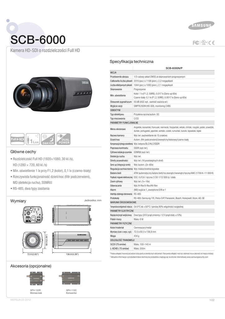 SCB-6000 Kamera HD-SDI o rozdzielczości Full HD Specyfikacja techniczna SCB-6000N/P 8*;+" Przetwornik obrazu 1/3-calowy układ CMOS ze skanowaniem progresywnym Całkowita liczba pikseli 2010 (poz.) x 1108 (pion.), 2,2 megapikseli Liczba efektywnych pikseli 1944 (poz.) x 1092 (pion.), 2,1 megapikseli Skanowanie Progresywne Min. oświetlenie Kolor: 1 lx (F1,2, 50IRE), 0,017 lx (Sens-up 60x) Czarno-biały: 0,1 lx (F1,2, 50IRE), 0,0017 lx (Sens-up 60x) Stosunek sygnał/szum 50 dB (AGC wył., wartość ważona wł.) Wyjście wizji SMPTE292M (HD-SDI), monitoring CVBS OBIEKTYW Typ obiektywu Przysłona ręczna/autom. DC Typ mocowania C/CS 1"3".&53:'6/,$+0/"-/& Full 1Lux D&N ICR Menu ekranowe Angielski, koreański, francuski, niemiecki, hiszpański, włoski, chiński, rosyjski, polski, szwedzki, duński, portugalski, japoński, serbski, czeski, rumuński, turecki, tajwański, tajski /B[XBLBNFSZ Wył./wł. (wyświetlanie do 15 znaków) Dzień/noc Autom. (filtr podczerwieni)/zewnętrzny/kolorowy/czarno-biały Kompensacja tylnego oświetlenia Wył./własna BLC/HLC/SSDR Poprawa kontrastu Główne cechy SSDR (wył./wł.) Cyfrowa redukcja szumów SSNRIII (wył./wł.) t3P[E[JFMD[PĆè'VMM)%¨LMT )%¨LMT t.JOPĆXJFUMFOJFMYQS[Z'LPMPS MYD[BSOPCJBZ t3zeczywista funkcjonalnoĆèE[JFìOPDGJMUSQPED[FSXJFOJ .%EFUFLDKBSVDIV 44/3III t34EXBUZQZ[BTJMBOJB Detekcja ruchu Wył./wł. Strefy prywatności Wył./wł. (16 prostokątnych stref) 4FOTVQJOUFHSBDKBSBNLJ Wył./autom. (2x–60x) Regulacja wzmocnienia Wył./niskie/średnie/wysokie Balans bieli ATW (automatyczny balans bieli)/na zewnątrz/wewnątrz/ręczny/AWC (1700 K–11 000 K) Prędkość migawki elektronicznej ESC / A.FLK / ręczna (1/30-1/12 000 s) / stała Zoom cyfrowy Wył./wł. (1x–16x) Odwracanie Wył./H-Rev/V-Rev/HV-Rev "MBSN (MD) wyjście 1, zewnętrzne D/N w 1 Interfejs zdalnego sterowania RS-485 Jednostka: mm Wymiary RS-485: Samsung-T/E, Pelco-D/P, Panasonic, Bosch, Honeywell, Vicon, AD, GE 8"36/,*ø30%08*4,08& Temperatura/wilgotność robocza Od 0°C do +50°C / poniżej 90% wilgotności względnej AUDIO OUT AUDIO IN SD CARD 1"3".&53:&-&,53:$;/& SD SYSTEM POWER VIDEO Protokoły RESET /BQJƻDJFQSƼEXFKĆDJPXZ Dwa typy (24 V prąd zmienny i 12 V prąd stały ±10%) NETWORK 1 2 3 4 5 ACT LINK GND Pobór mocy AC 24V DC 12V Maks. 6 W 1"3".&53:'*;:$;/& Kolor/materiał Ciemnoszary/metal 60.0 (2.36") (2.36") 8ZNJBSZT[FSYXZTYH 72,0 x 60,0 x 136,8 mm 72.0 (2.83") (2.83") 72.0 Waga 434 g 0%-&(0øå53"/4.*4+* 136.8 (5.39") 136.8 (5.39") $7PN×X Maks. 100–140 m -$)%PN×X Maks. 200m * Podana odległość transmisji jest jedynie liczbą opartą na teoretycznych obliczeniach. Rzeczywista odległość może być natomiast inna w zależności od miejsca instalacji. * Aktualne informacje o produktach/dane techniczne produktów znajdują się na stronie internetowej www.samsungsecurity.com Akcesoria (opcjonalne) SPH-120R Wzmacniak WERSJA 03-2012 SPH-110C Konwerter 102