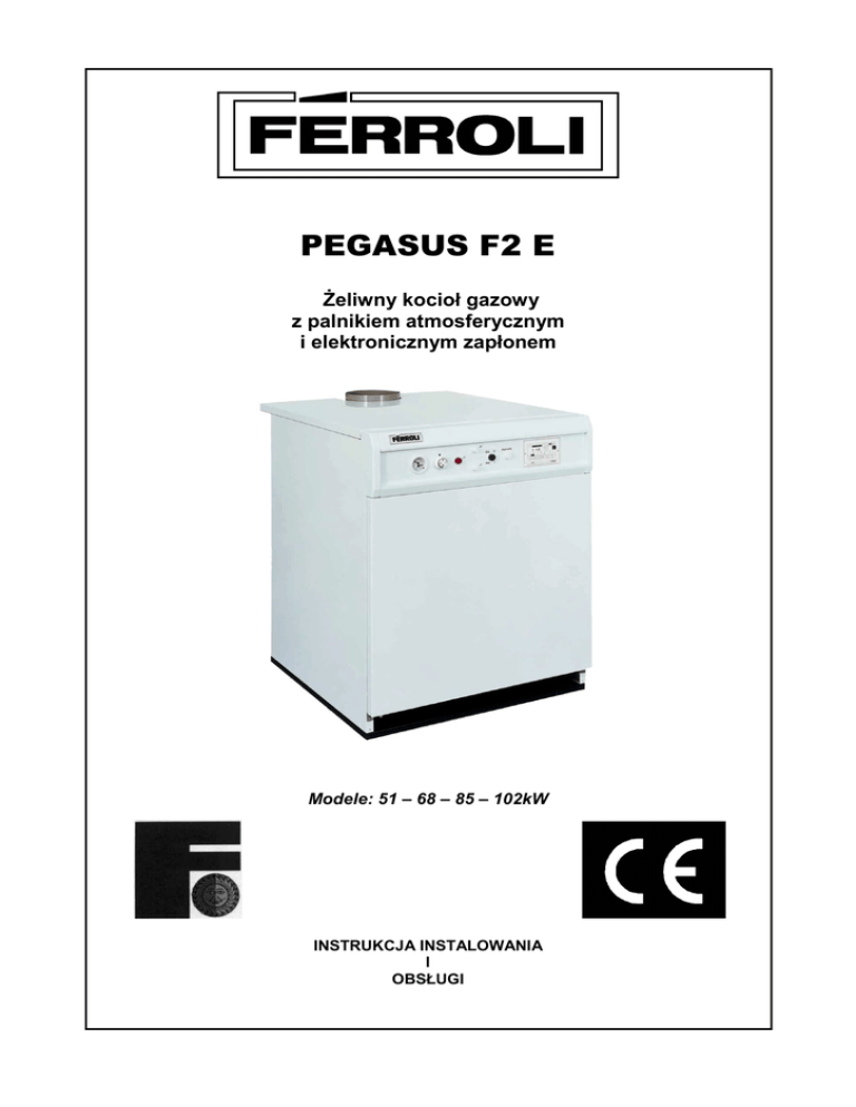PEGASUS F2 E Żeliwny kocioł gazowy z palnikiem atmosferycznym i elektronicznym zapłonem Modele: 51 – 68 – 85 – 102kW INSTRUKCJA INSTALOWANIA I OBSŁUGI PEGASUS F2 E SPIS TREŚCI 1 2 3 4 5 6 7 8 9 10 2 Opis ............................................................................................................................... 3 Podstawowe informacje techniczne................................................................................ 3 Instalacja........................................................................................................................ 6 Schematy połączeń, okablowanie .................................................................................. 6 Włączanie i wyłączanie..................................................................................................11 Regulacja ......................................................................................................................13 Zmiana paliwa z GZ-50 na LPG. ...................................................................................16 Konserwacja i czyszczenie............................................................................................17 Usterki...........................................................................................................................18 Dane dla gazu GZ35 .....................................................................................................19 PEGASUS F2 E 1 Opis 1.1 Wprowadzenie Kotły PEGASUS F2 E przeznaczone są do układów centralnego ogrzewania i produkcji c.w.u. Wersja podstawowa kotła przystosowana jest do pracy z gazem ziemnym GZ50. Możliwe jest przezbrojenie kotła na inny rodzaj gazu, które powinno być wykonane przez uprawnionego specjalistę. 1.2 Wymagania instalacyjne Montaż, instalacja, pierwsze uruchomienie i konserwacja powinny być przeprowadzone przez autoryzowanych pracowników serwisowych o odpowiednich kwalifikacjach. Instalacja kotła powinna być wykonana zgodnie z obowiązującymi przepisami (Polskie Normy, wytyczne UDT itd.) 2 Podstawowe informacje techniczne 2.1 Wymiary i podłączenia Rys.1 LEGENDA a1 powrót z instalacji c.o. 1 ½’’ a2 zasilanie instalacji c.o. 1 ½’’ a3 wlot gazu ¾’’ Wymiary Połączenia A mm B mm C ∅ mm D mm E mm Pegasus F2 51 550 96,5 180 43 Pegasus F2 68 640 96,5 180 Pegasus F2 85 720 106,5 Pegasus F2 102 800 106,5 Powrót Zasilanie Gaz Ciężar z PojeMax ciśnienie opakowa- mność niem wodna bar a1 ∅ a2 ∅ a3 ∅ kg l 35 1 ½’’ 1 ½’’ ¾’’ 260 22 4 46 38 1 ½’’ 1 ½’’ ¾’’ 300 26 4 200 44 36 1 ½’’ 1 ½’’ ¾’’ 350 30 4 200 42 34 1 ½’’ 1 ½’’ ¾’’ 400 34 4 3 PEGASUS F2 E 2.2 Dane techniczne PEGASUS F2 standardowo przygotowany jest do pracy z gazem naturalnym GZ50 (istnieje możliwość przezbrojenia kotła na inny rodzaj gazu). Kocioł może pracować z maksymalną temperaturą zasilania równą 82°C oraz z maksymalną różnicą temperatur ∆tmax=20°C. Typ kotła Pegasus F2 51 Pegasus F2 68 Pegasus F2 85 Pegasus F2 102 Moc cieplna wyjściowa kW 51 68 85 102 Obciążenie cieplne kW 56 74,8 93,5 112 Liczba członów żeliwnych szt. 4 5 6 7 kg/h 178 204 220 253 ∆T spalin – otoczenia °C 86 100 114 118 Sprawność kotła 80/60 % 90,9 90,9 91,0 91,0 Zawartość CO2 % 4,5 5,3 6,2 6,5 Pa 3 3 3 3 Strumień spalin Zapotrzebowanie ciągu MODEL Liczba sekcji Dysze główne Dysze pilota Minimalne ciśnienie gazu na zasilaniu **) (mbar) Ciśnienie gazu na palniku (mbar) Przepływ gazu GZ50 LPG GZ50 LPG GZ50 LPG GZ50 LPG GZ50 m3/h LPG kg/h Pegasus F2 51 3 3,5 2,15 0,4 0,24 20 38 13,3 36 5,9 4,34 Pegasus F2 68 4 3,5 2,15 0,4 0,24 20 38 13,3 36 7,9 5,79 Pegasus F2 85 5 3,5 2,15 0,4 0,24 20 38 13,3 36 9,9 7,24 Pegasus F2 102 6 3,5 2,15 0,4 0,24 20 38 13,3 36 11,8 8,68 **) Minimalne ciśnienie gazu na zasilaniu mierzone podczas pracy palnika. 2.3 Części składowe Legenda: 1. Termomanometr 2. Termostat regulacyjny 3. Przycisk usuwania blokady 4. Wyłącznik 5. Usuwanie blokady czujnika zaniku ciągu 6. Usuwanie blokady czujnika bezpieczeństwa (STB) 7. Centralka zapłonowa 8. Miejsce na sterownik pogodowy 9. Panel sterowniczy 10. Zespół gazowy 11. Pilot zapłonowy 12. Kolektor gazowy – palnik główny 13. Punkt pomiarowy ciśnienia gazu 14. Automatyczny odpowietrznik 15. Zawór spustowy 16. Punkt próbkowania spalin Rys. 2 4 PEGASUS F2 E 2.4 Charakterystyka strat ciśnienia Straty ciśnienia po stronie wodnej dla kotłów Pegasus F2 przedstawia wykres (Rys.3) Rys.3 2.5 Termostat zaniku ciągu kominowego Kocioł wyposażony jest seryjnie w termostat zaniku ciągu kominowego, który odcina dopływ gazu do kotła w przypadku stwierdzenia nie prawidłowego przepływu spalin, zapewniając tym samym wysoki poziom bezpieczeństwa podczas pracy urządzenia. W przypadku zadziałania termostatu, należy ręcznie usunąć blokadę kotła (odkręcić zaślepkę 5 rys.2, po czym wcisnąć przycisk usuwania blokady). Kocioł powinien powrócić do normalnej pracy. Jeśli wystąpi potrzeba wymiany termostatu z.c., należy używać tylko oryginalnych części. Należy upewnić się, że podłączenia elektryczne po wymianie są poprawne, nie należy pozastawiać termostatu odłączonego od układu elektrycznego kotła. Przy częstych blokadach kotła należy skontaktować się z uprawnionym serwisem. Podczas czyszczenia przerywacza ciągu kominowego, należy uważać, aby nie uszkodzić kapilary (czujnika) termostatu z.c.k. Rys.4. Usytuowanie czujnika zaniku ciągu w kotle 5 PEGASUS F2 E 3 Instalacja Powinna być uprawnienia. 3.1 wykonana przez wyspecjalizowane firmy posiadające odpowiednie Ogólne zalecenia Instalacja kotła powinna być wykonana zgodnie z obowiązującymi przepisami. Zalecamy wstawić między kotłem i instalacją c.o. zawory odcinające, które pozwolą, w razie konieczności odłączyć kocioł od instalacji bez jej opróżniania. Różnica temperatur wody pomiędzy zasil
