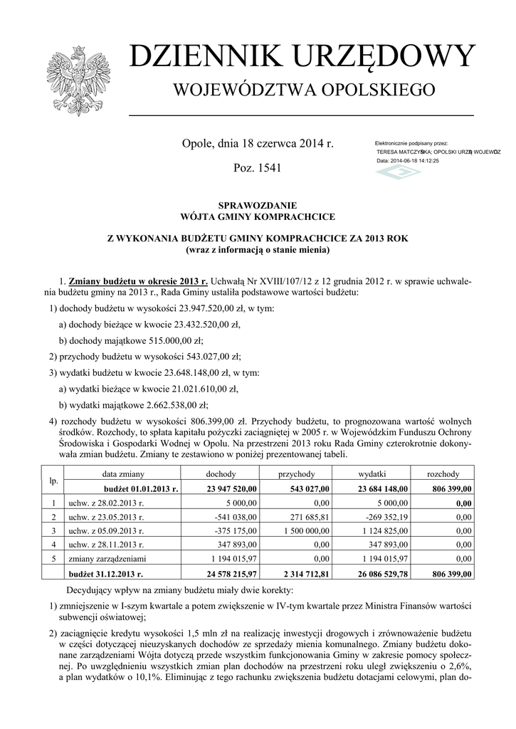 DZIENNIK URZĘDOWY WOJEWÓDZTWA OPOLSKIEGO Opole, dnia 18 czerwca 2014 r. Elektronicznie podpisany przez: TERESA MATCZYŃSKA; OPOLSKI URZĄD WOJEWÓDZKI Data: 2014-06-18 14:12:25 Poz. 1541 SPRAWOZDANIE WÓJTA GMINY KOMPRACHCICE Z WYKONANIA BUDŻETU GMINY KOMPRACHCICE ZA 2013 ROK (wraz z informacją o stanie mienia) 1. Zmiany budżetu w okresie 2013 r. Uchwałą Nr XVIII/107/12 z 12 grudnia 2012 r. w sprawie uchwalenia budżetu gminy na 2013 r., Rada Gminy ustaliła podstawowe wartości budżetu: 1) dochody budżetu w wysokości 23.947.520,00 zł, w tym: a) dochody bieżące w kwocie 23.432.520,00 zł, b) dochody majątkowe 515.000,00 zł; 2) przychody budżetu w wysokości 543.027,00 zł; 3) wydatki budżetu w kwocie 23.648.148,00 zł, w tym: a) wydatki bieżące w kwocie 21.021.610,00 zł, b) wydatki majątkowe 2.662.538,00 zł; 4) rozchody budżetu w wysokości 806.399,00 zł. Przychody budżetu, to prognozowana wartość wolnych środków. Rozchody, to spłata kapitału pożyczki zaciągniętej w 2005 r. w Wojewódzkim Funduszu Ochrony Środowiska i Gospodarki Wodnej w Opolu. Na przestrzeni 2013 roku Rada Gminy czterokrotnie dokonywała zmian budżetu. Zmiany te zestawiono w poniżej prezentowanej tabeli. lp. data zmiany dochody przychody wydatki rozchody budżet 01.01.2013 r. 23 947 520,00 543 027,00 23 684 148,00 806 399,00 1 uchw. z 28.02.2013 r. 5 000,00 0,00 5 000,00 0,00 2 uchw. z 23.05.2013 r. -541 038,00 271 685,81 -269 352,19 0,00 3 uchw. z 05.09.2013 r. -375 175,00 1 500 000,00 1 124 825,00 0,00 4 uchw. z 28.11.2013 r. 347 893,00 0,00 347 893,00 0,00 5 zmiany zarządzeniami 1 194 015,97 0,00 1 194 015,97 0,00 budżet 31.12.2013 r. 24 578 215,97 2 314 712,81 26 086 529,78 806 399,00 Decydujący wpływ na zmiany budżetu miały dwie korekty: 1) zmniejszenie w I-szym kwartale a potem zwiększenie w IV-tym kwartale przez Ministra Finansów wartości subwencji oświatowej; 2) zaciągnięcie kredytu wysokości 1,5 mln zł na realizację inwestycji drogowych i zrównoważenie budżetu w części dotyczącej nieuzyskanych dochodów ze sprzedaży mienia komunalnego. Zmiany budżetu dokonane zarządzeniami Wójta dotyczą przede wszystkim funkcjonowania Gminy w zakresie pomocy społecznej. Po uwzględnieniu wszystkich zmian plan dochodów na przestrzeni roku uległ zwiększeniu o 2,6%, a plan wydatków o 10,1%. Eliminując z tego rachunku zwiększenia budżetu dotacjami celowymi, plan do- Dziennik Urzędowy Województwa Opolskiego –2– Poz. 1541 chodów na koniec roku był niższy od uchwalonej pierwotnie wersji budżetu o 0,5 mln zł. Jest to efekt urealnienia planu sprzedaży mienia komunalnego (działek budowlanych). Przychody, oprócz wartości zaciągniętego kredytu inwestycyjnego, zwiększono o 271.685,81 zł. Jest to kwota wynikająca z ustalenia ostatecznej kwoty wolnych środków na wartość 814.712,81 zł. Planowana na początek roku wartość rozchodów na przestrzeni roku nie uległa zmianie. 2. Dochody budżetu Plan dochodów budżetu został zrealizowany w 100,7%, to jest w kwocie 24.740.368,72 zł. Dochody bieżące wykonano w 99,8 %. Realizację planu dochodów bieżących, w podziale na działy klasyfikacji budżetowej, przedstawia poniższe zestawienie: Symbol i nazwa działu lp. 1 2 1 010 Rolnictwo i łowiectwo 2 600 Transport i łączność 3 700 Gospodarka mieszkaniowa 4 750 Administracja publiczna 5 751 Urzędy naczelnych organów władzy państwowej 6 752 Obrona narodowa 7 756 Dochody od osób prawnych, od osób fizycznych i od innych … 8 758 Różne rozliczenia 9 801 Oświata i wychowanie Plan 31.12.2013 3 Wykonanie 31.12.2013 4 % 4:3 Udział % 5 6 98,6 0,7 62 000,00 67 345,90 108,6 0,3 28 100,00 26 725,35 95,1 0,1 103 936,00 109 452,82 105,3 0,5 1 933,00 1 933,00 100,0 0,0 173 653,41 171 157,24 600,00 575,00 95,8 0,0 10 927 727,00 10 918 560,34 99,9 45,0 9 629103,67 9 600 543,74 99,7 39,6 720 294,06 676 540,87 93,9 2,8 10 851 Ochrona zdrowia 125 000,00 134 434,08 107,5 0,6 11 852 Pomoc społeczna 2 267 712,00 2 251 333,70 99,3 9,3 12 854 Edukacyjna opieka wychowawcza 94 437,00 93 422,00 98,9 0,4 13 900 Gosp. komunalna i ochr. środowiska 14 921 Kultura i ochrona dziedzictwa narodowego 30 000,00 32 836,00 89 233,57 297,4 13 081,00 39,8 0,4 0,1 15 926 Kultura fizyczna 90 142,00 77 980,34 86,5 0,3 24 287 474,14 24 232 318,95 99,8 100,0 razem: Wykonanie planu dochodów bieżących w 99,8% świadczy o dokładnym i realnym planowaniu. Analiza zrealizowanych dochodów wskazuje na to, iż 84,6% całej wartości bieżących wpływów do budżetu uzyskano w dwóch działach klasyfikacji budżetowej, tj. w dziale „dochody od osób prawnych, od osób fizycznych i od innych jednostek nie posiadających osobowości prawnej” oraz w dziale „różne rozliczenia”. W wymienionych działach sklasyfikowano dwa największe źródła dochodów: subwencję ogólną i udziały gminy w podatku dochodowym od osób fizycznych. Suma dochodów z tych dwóch źródeł stanowi kwotę 16.134.410,00 zł, czyli 66,6% całości bieżących dochodów. Kolejną, co do wielkości, pozycją dochodów są podatki lokalne, do których zalicza się podatek od nieruchomości, podatek rolny, podatek leśny i podatek od środków transportu. Łączne dochody z podatków lokalnych, to kwota 3.812.934,78 zł, co stanowi 15,7% zrealizowanych bieżących dochodów budżetu. Należy podkreślić wysoką ściągalność podatków lokalnych. Osoby fizyczne wpłaciły 95,9% naliczonych podatków, a osoby prawne 97,6%. Łącznie dochody z tytułu wpłat podatków lokalnych wyniosły 96,6% wartości dostarczonych podatnikom zobowiązań. Stosunkowo niskie wykonanie planu dochodów bieżących w dziale „kultura i ochrona dziedzictwa narodowego” jest wynikiem opóźnienia w zwrocie środków z Programu Rozwoju Obszarów Wiejskich („Gmina w obiektywie”). Natomiast plan dochodów majątkowych, w ujęciu statystycznym, został wykonany aż w 188,2%. Sprzedano 7 działek budowlanych w Komprachcicac
