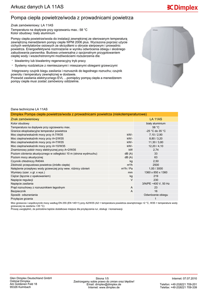 Arkusz danych LA 11AS Pompa ciepła powietrze/woda z prowadnicami powietrza Znak zamówieniowy: LA 11AS Temperatura na dopływie przy ogrzewaniu max.: 58 °C Kolor obudowy: biały aluminium Pompy ciepła powietrze/woda do instalacji zewnętrznej ze sterowanym temperaturą zewnętrzną menedżerem pompy ciepła WPM 2006 plus. Wyciszona poprzez użycie cichych wentylatorów osiowych ze skrzydłami o obrysie sierpowym i prowadnic powietrza. Energoefektywne rozmrażanie w wyniku odwrócenia obiegu i skośnego zabudowania parownika. Budowa uniwersalna z opcjonalnym przygotowaniem ciepłej wody i wszechstronnymi możliwościami rozszerzenia dla: - biwalentny lub biwalentny regeneracyjny tryb pracy - Systemy rozdzielcze z niemieszanymi i mieszanymi obiegami grzewczymi Integrowany czujnik biegu zasilania i rozrusznik do łagodnego rozruchu; czujnik powrotu i temperatury zewnętrznej w dostawie. Przewód zasilania elektrycznego EVL ...pomiędzy pompą ciepła a menedżerem pompy ciepła musi zostać zamówiony oddzielnie. Dane techniczne LA 11AS Dimplex Pompa ciepła powietrze/woda z prowadnicami powietrza (niskotemperaturowe) Znak zamówieniowy LA 11AS Kolor obudowy Temperatura na dopływie przy ogrzewaniu max. Granice eksploatacyjne temperatur powietrza Moc cieplna/wskaźnik mocy przy A-7/W35 Moc cieplna/wskaźnik mocy przy A+2/W35 Moc cieplna/wskaźnik mocy przy A+7/W35 Moc cieplna/wskaźnik mocy przy A+10/W35 Znamionowy pobór mocy elektrycznej przy A+2/W35 Poziom ciśnienia akustycznego w odległości 10 m (strona wydmuchu) Poziom mocy akustycznej Czynnik chłodniczy R404A Zdolność przepustowa powietrza (źródło ciepła) Natężenie przepływu wody grzewczej przy wew. różnicy ciśnień Wymiary (szer. x gł. x wys.) Ciężar (łącznie z opakowaniem) Napięcie regulacji Napięcie zasilania Prąd rozruchowy z rozrusznikiem łagodnym Bezpiecznik Sposób odszraniania Przyłącze grzania kW/kW/kW/kW/kW dB (A) dB (A) kg m³/h m³/h / Pa mm kg V A A biały aluminium 58 °C -25 °C do 35 °C 7,10 / 2,90 8,80 / 3,20 11,30 / 3,80 12,20 / 4,10 2,74 33 63 2,50 2500 1,00 / 3000 1360 x 850 x 1360 219 230 3/N/PE ~400 V, 50 Hz 23 16 Odwrócenie obiegu 1 Moc grzewcza i współczynnik mocy według EN 255 (EN 14511) przy A2/W35 (A2 = temperatura powietrza zewnętrznego +2 °C, W35 = temperatura wody grzewczej na zasilaniu +35 °C) Proszę uwzględnić, że potrzebne będzie dodatkowe miejsce dla przyłączenia rur, obsługi i konserwacji. Glen Dimplex Deutschland GmbH Oddział Dimplex Am Goldenen Feld 18 95326 Kulmbach Strona 1/5 Zastrzegamy sobie prawo do zmian oraz błędów! Email: [email protected] Internet: www.dimplex.de Internet: 07.07.2010 Telefon: +49 (0)9221 709-201 Telefax: +49 (0)9221 709-339 Wyposażenie urządzenia LA 11AS Opis Typ-nr Numer artykułu Ilości przykładow e LA 11AS EVL 996-1 EVL 997-1 EVL 998-1 EVL 999-1 339950 321990 322000 322010 359120 1 1 AS 976 PSW 100 PSW 200 PSW 500 KPV 25 DDV 25 UP 60 UP 80 WWM 25 UPE 60 VTB 25 MMH 25 MMB 25 322180 351090 339830 339210 346590 358390 340300 340310 346600 358870 339870 348640 348880 HL 11C HL 16C HL 26C HL 36C HCT 300 HDLR 450 351730 351740 351750 351760 351210 337450 WWSP 332 WWSP 880 WWSP 442E 346610 337880 353370 PWS 332 CTHK 631 CTHK 632 CTHK 633 CTHK 634 FLH 60 FLHU 70 FLH 25M SVK 852 PWD 750 348620 336180 335910 322140 322150 338060 338070 349430 326660 349100 PWD 900 362860 VTB 25 WWM 25 WPG 25 339870 346600 356030 1 UP 60 340300 1 NWPM EWPM LWPM 410 RBG WPM AP PGD FG 3115 Norm NTC-2 FA 550 KRRV 003 356960 356970 339410 339700 356570 336620 353400 338550 322070 Sztuk Cena Pompa ciepła Pompa ciepła powietrze/woda z prowadnicami powietrza Przewód sterowniczy 10 m Przewód sterowniczy 20m Przewód sterowniczy 30m Przewód sterowniczy 40 m Akcesoria hydrauliczne Przyłącze węża 1* Podstawa zbiornika buforowego 100l* Podstawa zbiornika buforowego 200 l* Uniwersalny zbiornik buforowy 500 l* Kompaktowy rozdzielacz z zaworem przelewowym* Podwójny rozdzielacz bezciśnieniowy Pompa obiegowa wody grzewczej Pompa obiegowa wody grzewczej Moduł ciepłej wody / moduł niemieszanego obiegu grzewczego Elektronicznie regulowana pompa obiegowa dla wody grzewczej Belka rozdzielacza Mieszany obieg grzewczy z czujnikiem temperatury Moduł mieszalnika do systemów biwalentnych 1 1 1 1 Akcesoria do ogrzewania Konwektor wentylatorowy grzanie/chłodzenie* Konwektor wentylatorowy grzanie/chłodzenie* Konwektor wentylatorowy grzanie/chłodzenie* Konwektor wentylatorowy grzanie/chłodzenie* Ogrzewanie rurowe 3 kW Podzespoły rur do grzałek* Wyposażenie dodatkowe przygotowania ciepłej wody Zasobnik ciepłej wody 300 l z czujnikiem temperatury* Zasobnik ciepłej wody 400 l z czujnikiem temperatury* Design zasobnik ciepłej wody z obudową z blachy i czujnikiem temperatury* Kombinacja zbiorników dla ogrzewania i przygotowania ciepłej wody Grzałka 2,0 kW CTHK 631 Grzałka 2,9 kW CTHK 632 Grzałka 4,5 kW CTHK 633 Grzałka 6,0 kW CTHK 634 Ogrzewanie kołnierzowe do ciepłej wody Ogrzewanie kołnierzowe do ciepłej wody Ogrzewanie kołnierzowe FLH 25M Układ zaworów zabezpieczających Zbiornik kombinacyjny dla ogrzewania i centralnego podgrzewania przepływowego wody pitnej* Zbiornik kombinacyjny dla ogrzewania i centralnego podgrzewania przepływowego wody pitnej* Belka rozdzielacza Moduł ciepłej wody / moduł niemieszanego obiegu grzewczego Seria pomp DN 25 do bezpośredniego podłączenia zbiornika ciepłej wody Pompa obiegowa wody grzewczej 1 1 1 Wyposażenie dodatkowe techniki regulacji Rozszerzenie dla podłączenia sieci Ethernet Rozszerzenie dla przyłączenia magistrali KNX/EIB Karta wtykowa menedżera pompy ciepła Grupa przekaź ników basenu / zdalny wskaź nik zakłóceń Pilot zdalnego sterowania WPM 2006/2007/EconPlus/R* Czujnik temperatury zewnętrznej w obudowie Czujnik temperatury Czujnik systemowy Termostat ogrzewania i ciepłej wody Glen Dimplex Deutschland GmbH Oddział Dimplex Am Goldenen Feld 18 95326 Kulmbach Strona 2/5 Zast