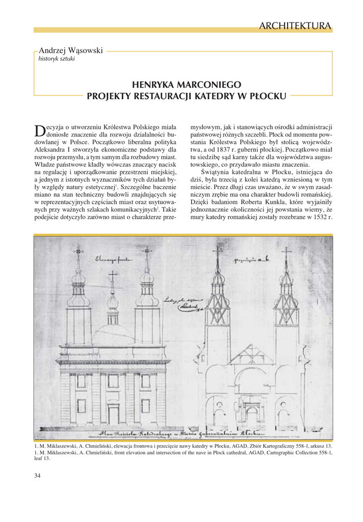 ARCHITEKTURA Andrzej Wàsowski historyk sztuki HENRYKA MARCONIEGO PROJEKTY RESTAURACJI KATEDRY W P¸OCKU D ecyzja o utworzeniu Królestwa Polskiego mia∏a donios∏e znaczenie dla rozwoju dzia∏alnoÊci budowlanej w Polsce. Poczàtkowo liberalna polityka Aleksandra I stworzy∏a ekonomiczne podstawy dla rozwoju przemys∏u, a tym samym dla rozbudowy miast. W∏adze paƒstwowe k∏ad∏y wówczas znaczàcy nacisk na regulacj´ i uporzàdkowanie przestrzeni miejskiej, a jednym z istotnych wyznaczników tych dzia∏aƒ by∏y wzgl´dy natury estetycznej1. Szczególne baczenie miano na stan techniczny budowli znajdujàcych si´ w reprezentacyjnych cz´Êciach miast oraz usytuowanych przy wa˝nych szlakach komunikacyjnych2. Takie podejÊcie dotyczy∏o zarówno miast o charakterze prze- mys∏owym, jak i stanowiàcych oÊrodki administracji paƒstwowej ró˝nych szczebli. P∏ock od momentu powstania Królestwa Polskiego by∏ stolicà województwa, a od 1837 r. guberni p∏ockiej. Poczàtkowo mia∏ tu siedzib´ sàd karny tak˝e dla województwa augustowskiego, co przydawa∏o miastu znaczenia. Âwiàtynia katedralna w P∏ocku, istniejàca do dziÊ, by∏a trzecià z kolei katedrà wzniesionà w tym mieÊcie. Przez d∏ugi czas uwa˝ano, ˝e w swym zasadniczym zr´bie ma ona charakter budowli romaƒskiej. Dzi´ki badaniom Roberta Kunkla, które wyjaÊni∏y jednoznacznie okolicznoÊci jej powstania wiemy, ˝e mury katedry romaƒskiej zosta∏y rozebrane w 1532 r. 1. M. Miklaszewski, A. Chmieliƒski, elewacja frontowa i przeci´cie nawy katedry w P∏ocku, AGAD, Zbiór Kartograficzny 558-1, arkusz 13. 1. M. Miklaszewski, A. Chmieliƒski, front elevation and intersection of the nave in P∏ock cathedral, AGAD, Cartographic Collection 558-1, leaf 13. 34 2. M. Miklaszewski, plan sytuacyjny koÊcio∏a katedralnego..., AGAD, Zbiór Kartograficzny 558-1, arkusz 1. 2. M. Miklaszewski, situational plan of the cathedral church, AGAD, Cartographic Collection 558-1, leaf 1. Na ich miejscu architekt Bernardino, syn Zenobiego de Gianotis wraz ze wspó∏pracownikami – Janem Cini i Filipem z Fiesole – wznieÊli w latach 1532-1535 renesansowy koÊció∏, zachowany w zasadniczym za∏o˝eniu do dziÊ3. Zosta∏ on rozbudowany w latach 1556-1563 przez Jana Baptyst´ z Wenecji. Przed∏u˝ono wtedy prezbiterium i dobudowano od zachodu fasad´ z dwoma wie˝ami. Nast´pna przebudowa mia∏a miejsce oko∏o 1665 r., kiedy to zastàpiono oÊmiobocznà kopu∏´ sferycznà i dodano wie˝om barokowe he∏my. Katedra p∏ocka wymaga∏a restauracji ju˝ w XVIII w. Oko∏o 1787 r., dzi´ki funduszom prymasa Micha∏a Poniatowskiego, wzniesiona zosta∏a nowa klasycystyczna fasada frontowa, której zadaniem by∏o umocowanie rysujàcych si´ Êcian i podparcie konstrukcji wie˝ (il. 1). Po trzecim rozbiorze w∏adze pruskie przystàpi∏y do porzàdkowania otoczenia katedry i dla odkrycia widoków rozkazawszy rozebraç mury koÊció∏ otaczajàce wystawi∏ ten˝e na wiatry nawalne i inne zawiewy burzliwe4, które Êwiàtyni stojàcej na wysokiej górze czyni∏y znaczàce uszkodzenia. Z∏y stan techniczny budowli przyczyni∏ si´ do podj´cia przez kapitu∏´ katedralnà staraƒ o pozyskanie Êrodków na gruntownà jej restauracj´, sama bowiem nie by∏a w stanie ponieÊç ci´˝aru kosztów planowanych robót. Za czasów rzàdów pruskich skonfiskowane zosta∏y jej liczne dobra i zasoby pieni´˝ne, za które próbowa∏a w czasach Królestwa Polskiego otrzymaç kompensacj´. W∏adze wojewódzkie, a potem gubernialne, interesowa∏y si´ losami koÊcio∏a katedralnego i popiera∏y inicjatyw´ koÊcielnà. Katedra usytuowana by∏a bowiem w centrum miasta, a bry∏a jej murów stanowi∏a istotny akcent jego sylwety. By∏a to tak˝e nekropolia w∏adców Polski, co przy wzrastajàcym zainteresowaniu dziejami kraju i narodowymi pamiàtkami nie pozostawa∏o bez znaczenia5. Rzàd gubernialny p∏ocki w swych pismach skierowanych do Komisji Rzàdowej Spraw Wewn´trznych 35 i Duchownych wyraênie podkreÊla∏, i˝ budowa ta pierwsza w guberni zas∏uguje na szczególnà opiek´ rzàdu6, zaÊ ten˝e ma naoczne przekonanie, i˝ budowa ta od wielu lat nie reperowana we wszystkich cz´Êciach i zanieczyszczona ra˝àcy przedstawia widok (...) Êciany i sklepienia zrujnowane (...) dachy zaciekajà7. Jednak˝e komisja ta, stanowiàca naczelny organ administracji paƒstwowej w zakresie spraw duchownych, nie znalaz∏a podstaw prawnych umo˝liwiajàcych wyasygnowanie funduszy na przeprowadzenie kompleksowego remontu, który móg∏ byç – jej zdaniem – sfinansowany jedynie ze Êrodków nale˝nych kapitule z ró˝nych tytu∏ów, sp∏ywajàcych jednak˝e do jej kasy nieregularnie. Wszelkie inwestycje przeprowadzane przy udziale paƒstwa zgodne by∏y z rozpowszechnionymi w ówczesnej Europie regu∏ami u˝ytecznoÊci i ekonomii, co w praktyce oznacza∏o cz´stokroç minimalizacj´ wydatków na podejmowane przedsi´wzi´cia, a tym samym odbija∏o si´ niekorzystnie na ich ostatecznym efekcie. Zasady te Êwi´ci∏y triumf od czasu wielkiej odbudowy po zniszczeniach doby napoleoƒskiej, by∏y skodyfikowane i propagowane przez popularnà doktryn´ Jeana-Nicolasa-Louisa Duranda8. W takich okolicznoÊciach w∏adze koÊcielne popierane jedynie przez lokalne podj´∏y inicjatyw´ ca∏kowitej restauracji katedry p∏ockiej. Mimo ˝e Komisja Rzàdowa Spraw Wewn´trznych i Duchownych odmówi∏a wspó∏finansowania przedsi´wzi´cia, to z racji obowiàzujàcych w Królestwie przepisów by∏a uprawniona do zatwierdzania projektów architektonicznych. Niejednokrotnie Komisja ze wzgl´du na nik∏à wartoÊç dokumentacji przedstawionej do jej akceptacji zleca∏a opracowanie nowych projektów w∏asnemu budowniczemu. Z takiej w∏aÊnie przyczyny Henryk Marconi, wybitny architekt 1 po∏. XIX w., pe∏niàcy wówczas funkcj´ budowniczego, zosta∏ zaanga˝owany do opracowania projektów restauracji katedry p