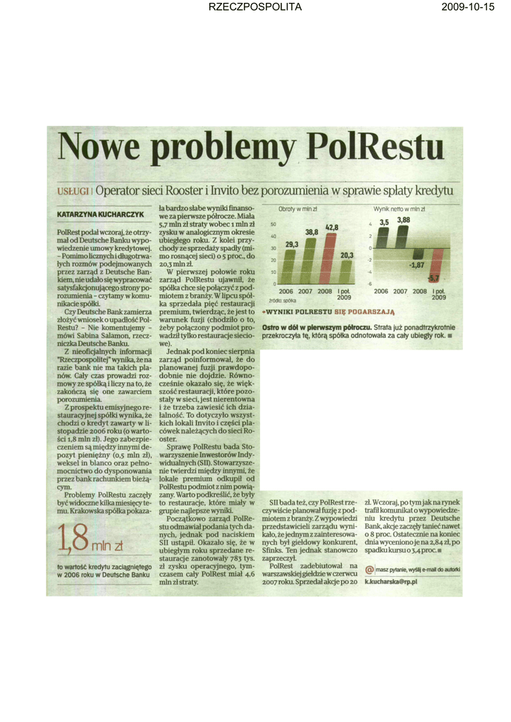 RZECZPOSPOLITA 2009-10-15 Nowe problemy PolRestu USŁUGI i Operator sieci Rooster i Invito bez porozumienia w sprawie spłaty kredytu KATARZYNA KUCHARCZYK PolRest podał wczoraj, że otrzy mał od Deutsche Banku wypo wiedzenie umowy kredytowej. - Pomimo licznych i długotrwa łych rozmów podejmowanych przez zarząd z Deutsche Ban kiem, nie udało się wypracować satysfakcjonującego strony po rozumienia - czytamy w komu nikacie spółki. Czy Deutsche Bank zamierza złożyć wniosek o upadłość Pol Restu? - Nie komentujemy mówi Sabina Salamon, rzecz niczka Deutsche Banku. Z nieoficjalnych informacji "Rzeczpospolitej" wynika, że na razie bank nie ma takich pla nów. Cały czas prowadzi roz mowy ze spółką i liczy na to, że zakończą się one zawarciem porozumienia. Z prospektu emisyjnego re stauracyjnej spółki wynika, że chodzi o kredyt zawarty w li stopadzie 2006 roku (o warto ści 1,8 mln zł). Jego zabezpie czeniem są między innymi de pozyt pieniężny (0,5 mln zł), weksel in blanco oraz pełno mocnictwo do dysponowania przez bank rachunkiem bieżą cym. Problemy PolRestu zaczęły być widoczne kilka miesięcy te mu. Krakowska spółka pokaza- 18 mlnzt to wartość kredytu zaciągniętego w 2006 roku w Deutsche Banku ła bardzo słabe wyniki finanso we za pierwsze półrocze. Miała 5,7 mln zł straty wobec 1 mln zł zysku w analogicznym okresie ubiegłego roku. Z kolei przy chody ze sprzedaży spadły (mi mo rosnącej sieci) o 5 proc., do 20,3 mln zł. W pierwszej połowie roku zarząd PolRestu ujawnił, że spółka chce się połączyć z pod miotem z branży. W lipcu spół ka sprzedała pięć restauracji premium, twierdząc, że jest to warunek fuzji (chodziło o to, żeby połączony podmiot pro wadzi tylko restauracje siecio we). Jednak pod koniec sierpnia zarząd poinformował, że do planowanej fuzji prawdopo dobnie nie dojdzie. Równo cześnie okazało się, że więk szość restauracji, które pozo stały w sieci, jest nierentowna i że trzeba zawiesić ich dzia łalność. To dotyczyło wszyst kich lokali Invito i części pla cówek należących do sieci Ro oster. Sprawę PolRestu bada Sto warzyszenie Inwestorów Indy widualnych (SD). Stowarzysze nie twierdzi między innymi, że lokale premium odkupił od PolRestu podmiot z nim powią zany. Warto podkreślić, że były to restauracje, które miały w grupie najlepsze wyniki. Początkowo zarząd PolRe stu odmawiał podania tych da nych, jednak pod naciskiem SII ustąpił. Okazało się, że w ubiegłym roku sprzedane re stauracje zanotowały 783 tys. zł zysku operacyjnego, tym czasem cały PolRest miał 4,6 mln zł straty. Obroty w mln zt Wynik netto w mln zt , 3,5 M8 -1,87 2006 źriłdto: spfltka 2007 2008 I pot. 2009 2006 2007 2008 I pot. 2009 ••WYNIKI POLRESTU SIC POGARSZAJĄ Ostro w dół w pierwszym półroczu. Strata już ponadtrzykrotnie przekroczyła tę, którą spółka odnotowała za cały ubiegły rok. • SII bada też, czy PolRest rze czywiście planował fuzję z pod miotem z branży. Z wypowiedzi przedstawicieli zarządu wyni kało, że jednym z zainteresowa nych był giełdowy konkurent, Sfinks. Ten jednak stanowczo zaprzeczył. PolRest zadebiutował na warszawskiej giełdzie w czerwcu 2007 roku. Sprzedał akcje po 20 zł. Wczoraj, po tym jak na rynek trafił komunikat o wypowiedze niu kredytu przez Deutsche Bank akcje zaczęły tanieć nawet o 8 proc. Ostatecznie na koniec dnia wyceniono je na 2,84 zł, po spadku kursu o 3,4 proc. • ( 5 ) ; masz pytanie, wyślij e-mail do autorki [email protected]