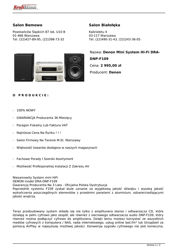 Salon Bemowo Salon Białołęka Powstańców Śląskich 87 lok. U10 B 01-466 Warszawa Tel. (22)427-89-95, (22)398-73-32 Kabrioletu 4 03-117 Warszawa Tel. (22)490-31-43, (22)243-36-05 Nazwa: Denon Mini System Hi-Fi DRADNP-F109 Cena: 2 995,00 zł Producent: Denon O PRODUKCIE: - 100% NOWY - GWARANCJA Producenta 36 Miesięcy - Paragon Fiskalny Lub Faktura VAT - Najniższa Cena Na Rynku ! ! ! - Salon Firmowy Na Terenie M.St. Warszawy - Większość towarów dostępna w naszych magazynach - Fachowe Porady I Szeroki Asortyment - Możliwość Profesjonalnej Instalacji Z Zakresu AV Niesamowity System mini HiFi DENON model DRA-DNP-F109 Gwarancja Producenta Na 3 Lata - Oficjalna Polska Dystrybucja Poprzednik systemu F109 zyskał duże uznanie za wyjątkową jakość dźwięku i wysoką jakość wykończenia poszczególnych elementów z przednimi panelami z aluminium, odzwierciedlającymi jakość wnętrza. Teraz przebudowany system składa się nie tylko z amplitunera stereo i odtwarzacza CD, które działają w pełni cyfrowo jako zespół, ale również z sieciowego odtwarzacza audio DNP-F109, który również można podłączyć cyfrowo do amplitunera. Dzięki temu możesz korzystać ze wszystkich mediów cyfrowych z komputera / NAS, radia internetowego, usług online last.fm* lub iUrządzeń za pomocą AirPlay w najwyższej możliwej jakości. Konwersja sygnału cyfrowego nie jest konieczna, strona 1 / 2 ponieważ sekcje końcowe są również cyfrowe i cyfrowy sygnał źródłowy mogą pozostać "nietknięte", w takim stopniu, jak to tylko możliwe. Całość może być sterowana poprzez aplikację nowej generacji dostępną dla urządzeń z systemem iOS lub Android lub łatwego w użyciu pilota zdalnego sterowania. Głośniki SC-F109 są idealnym dopełnieniem systemu zapewniając mocny ale szczegółowy dźwięk. Zalety: * Zestaw jest fabrycznie nowy, nigdy nie otwierany! * POLSKA GWARANCJA! * Wystawiamy faktury VAT 23% lub paragony. * Produkt dostępny najczęściej "od ręki" w naszym nowo-otwartym salonie na Bemowie bądź na Białołęce. WYSTAWIAMY POLSKIE RACHUNKI ZAKUPU (FAKTURA VAT, PARAGON) WRAZ Z POLSKĄ KARTĄ GWARANCYJNĄ. CENA ZAWIERA 23% PODATEK VAT. RACHUNEK JEST NIEZBĘDNY DO ZREALIZOWANIA GWARANCJI. TOWAR Z POLSKIEJ DYSTRYBUCJI. strona 2 / 2 Powered by TCPDF (www.tcpdf.org)