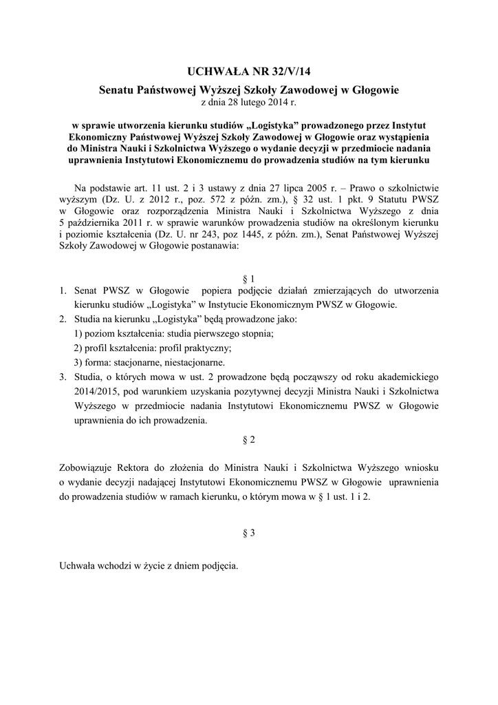 UCHWAŁA NR 32/V/14 Senatu Państwowej Wyższej Szkoły Zawodowej w Głogowie z dnia 28 lutego 2014 r. w sprawie utworzenia kierunku studiów „Logistyka” prowadzonego przez Instytut Ekonomiczny Państwowej Wyższej Szkoły Zawodowej w Głogowie oraz wystąpienia do Ministra Nauki i Szkolnictwa Wyższego o wydanie decyzji w przedmiocie nadania uprawnienia Instytutowi Ekonomicznemu do prowadzenia studiów na tym kierunku Na podstawie art. 11 ust. 2 i 3 ustawy z dnia 27 lipca 2005 r. – Prawo o szkolnictwie wyższym (Dz. U. z 2012 r., poz. 572 z późn. zm.), § 32 ust. 1 pkt. 9 Statutu PWSZ w Głogowie oraz rozporządzenia Ministra Nauki i Szkolnictwa Wyższego z dnia 5 października 2011 r. w sprawie warunków prowadzenia studiów na określonym kierunku i poziomie kształcenia (Dz. U. nr 243, poz 1445, z późn. zm.), Senat Państwowej Wyższej Szkoły Zawodowej w Głogowie postanawia: §1 1. Senat PWSZ w Głogowie popiera podjęcie działań zmierzających do utworzenia kierunku studiów „Logistyka” w Instytucie Ekonomicznym PWSZ w Głogowie. 2. Studia na kierunku „Logistyka” będą prowadzone jako: 1) poziom kształcenia: studia pierwszego stopnia; 2) profil kształcenia: profil praktyczny; 3) forma: stacjonarne, niestacjonarne. 3. Studia, o których mowa w ust. 2 prowadzone będą począwszy od roku akademickiego 2014/2015, pod warunkiem uzyskania pozytywnej decyzji Ministra Nauki i Szkolnictwa Wyższego w przedmiocie nadania Instytutowi Ekonomicznemu PWSZ w Głogowie uprawnienia do ich prowadzenia. §2 Zobowiązuje Rektora do złożenia do Ministra Nauki i Szkolnictwa Wyższego wniosku o wydanie decyzji nadającej Instytutowi Ekonomicznemu PWSZ w Głogowie uprawnienia do prowadzenia studiów w ramach kierunku, o którym mowa w § 1 ust. 1 i 2. §3 Uchwała wchodzi w życie z dniem podjęcia.