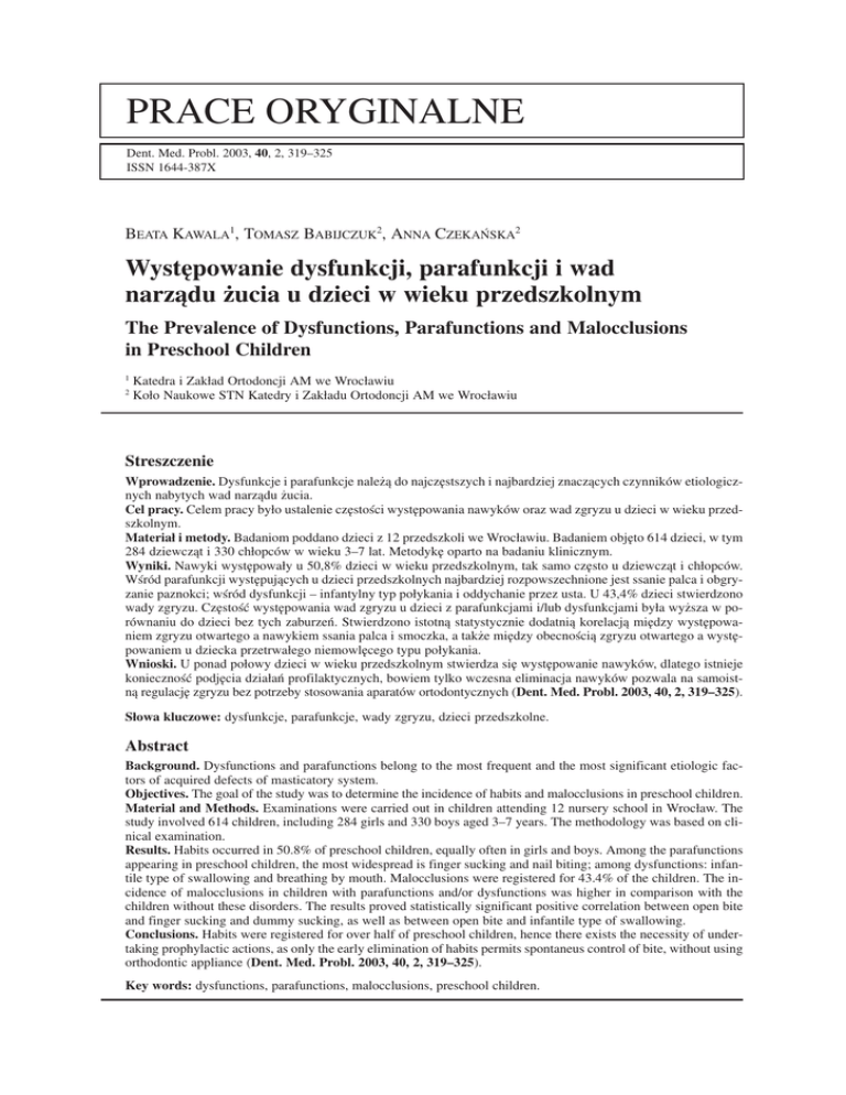 PRACE ORYGINALNE Dent. Med. Probl. 2003, 40, 2, 319–325 ISSN 1644−387X BEATA KAWALA1, TOMASZ BABIJCZUK2, ANNA CZEKAŃSKA2 Występowanie dysfunkcji, parafunkcji i wad narządu żucia u dzieci w wieku przedszkolnym The Prevalence of Dysfunctions, Parafunctions and Malocclusions in Preschool Children 1 2 Katedra i Zakład Ortodoncji AM we Wrocławiu Koło Naukowe STN Katedry i Zakładu Ortodoncji AM we Wrocławiu Streszczenie Wprowadzenie. Dysfunkcje i parafunkcje należą do najczęstszych i najbardziej znaczących czynników etiologicz− nych nabytych wad narządu żucia. Cel pracy. Celem pracy było ustalenie częstości występowania nawyków oraz wad zgryzu u dzieci w wieku przed− szkolnym. Materiał i metody. Badaniom poddano dzieci z 12 przedszkoli we Wrocławiu. Badaniem objęto 614 dzieci, w tym 284 dziewcząt i 330 chłopców w wieku 3–7 lat. Metodykę oparto na badaniu klinicznym. Wyniki. Nawyki występowały u 50,8% dzieci w wieku przedszkolnym, tak samo często u dziewcząt i chłopców. Wśród parafunkcji występujących u dzieci przedszkolnych najbardziej rozpowszechnione jest ssanie palca i obgry− zanie paznokci; wśród dysfunkcji – infantylny typ połykania i oddychanie przez usta. U 43,4% dzieci stwierdzono wady zgryzu. Częstość występowania wad zgryzu u dzieci z parafunkcjami i/lub dysfunkcjami była wyższa w po− równaniu do dzieci bez tych zaburzeń. Stwierdzono istotną statystycznie dodatnią korelacją między występowa− niem zgryzu otwartego a nawykiem ssania palca i smoczka, a także między obecnością zgryzu otwartego a wystę− powaniem u dziecka przetrwałego niemowlęcego typu połykania. Wnioski. U ponad połowy dzieci w wieku przedszkolnym stwierdza się występowanie nawyków, dlatego istnieje konieczność podjęcia działań profilaktycznych, bowiem tylko wczesna eliminacja nawyków pozwala na samoist− ną regulację zgryzu bez potrzeby stosowania aparatów ortodontycznych (Dent. Med. Probl. 2003, 40, 2, 319–325). Słowa kluczowe: dysfunkcje, parafunkcje, wady zgryzu, dzieci przedszkolne. Abstract Background. Dysfunctions and parafunctions belong to the most frequent and the most significant etiologic fac− tors of acquired defects of masticatory system. Objectives. The goal of the study was to determine the incidence of habits and malocclusions in preschool children. Material and Methods. Examinations were carried out in children attending 12 nursery school in Wrocław. The study involved 614 children, including 284 girls and 330 boys aged 3–7 years. The methodology was based on cli− nical examination. Results. Habits occurred in 50.8% of preschool children, equally often in girls and boys. Among the parafunctions appearing in preschool children, the most widespread is finger sucking and nail biting; among dysfunctions: infan− tile type of swallowing and breathing by mouth. Malocclusions were registered for 43.4% of the children. The in− cidence of malocclusions in children with parafunctions and/or dysfunctions was higher in comparison with the children without these disorders. The results proved statistically significant positive correlation between open bite and finger sucking and dummy sucking, as well as between open bite and infantile type of swallowing. Conclusions. Habits were registered for over half of preschool children, hence there exists the necessity of under− taking prophylactic actions, as only the early elimination of habits permits spontaneus control of bite, without using orthodontic appliance (Dent. Med. Probl. 2003, 40, 2, 319–325). Key words: dysfunctions, parafunctions, malocclusions, preschool children. 320 W etiologii nabytych wad narządu żucia za główne przyczyny uważa się: dysfunkcje, para− funkcje oraz przedwczesna utrata zębów mlecz− nych i stałych. W piśmiennictwie czynności typu stereoty− pów ruchowych, które nie są związane z procesa− mi lub mechanizmami fizjologicznymi, powtarza− ne często, niecelowe i wykonywane nieświado− mie są określane jako parafunkcje. Zalicza się do nich: ssanie smoczka, nagryzanie palca, języka, wargi górnej i dolnej, policzków, zgrzytanie zęba− mi. Dysfunkcje natomiast są to zaburzone mecha− nizmy czynności, w których bierze udział narząd żucia, m.in.: oddychanie przez usta, przetrwałe niemowlęce połykanie, a także nieprawidłowa wymowa. Zarówno dysfunkcje, jak i parafunkcje należą do najczęstszych, najbardziej znaczących czynników etiologicznych nabytych nieprawidło− wości morfologicznych i czynnościowych narzą− du żucia [1–3]. Parafunkcje są czynnościami słu− żącymi rozładowaniu uczucia niepokoju, osamot− nienia, bezczynności. Występują najczęściej u dzieci całkowicie lub częściowo pozbawionych poczucia bezpieczeństwa, miłości i więzi z naj− bliższą osobą [4]. Z danych piśmiennictwa wynika, że około 45% nawyków z okresu niemowlęcego utrzymu− je się do wieku przedszkolnego. Przetrwałe na− wyki ssania stwierdza się u dzieci w związku z przebytymi chorobami, wychowywaniem w trudnych, psychicznie patogennych warunkach środowiskowych, a także u dzieci nieśmiałych, trwożliwych [5, 6]. Często zdarza się, że przeby− wanie w licznej grupie i chęć naśladowania oto− czenia może sprzyjać przetrwaniu bądź też zapo− życzeniu szkodliwych nawyków [1]. Wystąpienie nawyków ustnych u dzieci sześcioletnich łączono ze zwiększeniem wrażliwości dzieci w chwili rozpoczynania nauki w przedszkolu [2]. W nie− których badaniach występowanie nawyku ssania korelowało z wykształceniem rodziców i zamoż− nością rodziny [5]. Wykazano również znaczącą predyspozycję do występowania nawyków ust− nych wśród dziewcząt, jedynaków, dzieci w złym stanie zdrowia, przewlekle chorych [4, 5]. Pato− logiczne oddychanie przez usta bierze swój po− czątek ze stanów chorobowych w obrębie nosa i gardła, będących przeszkodą w swo