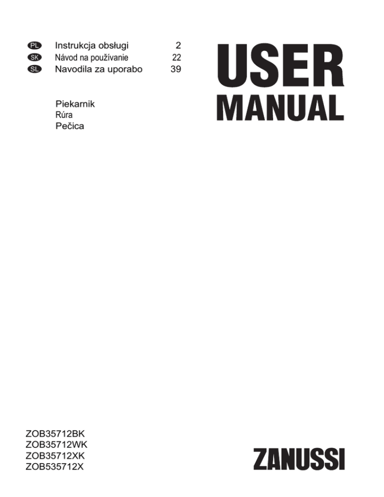 PL SK SL Instrukcja obsługi Návod na používanie Navodila za uporabo Piekarnik Rúra Pečica ZOB35712BK ZOB35712WK ZOB35712XK ZOB535712X 2 22 39 Spis treści Informacje dotyczące bezpieczeństwa _ _ _ Wskazówki dotyczące bezpieczeństwa _ _ Opis urządzenia _ _ _ _ _ _ _ _ _ _ _ _ _ _ Przed pierwszym użyciem _ _ _ _ _ _ _ _ _ Codzienna eksploatacja _ _ _ _ _ _ _ _ _ _ Funkcje zegara _ _ _ _ _ _ _ _ _ _ _ _ _ _ _ Korzystanie z akcesoriów _ _ _ _ _ _ _ _ _ 2 4 6 6 7 8 9 Dodatkowe funkcje _ _ _ _ _ _ _ _ _ _ _ _ Przydatne rady i wskazówki _ _ _ _ _ _ _ Konserwacja i czyszczenie _ _ _ _ _ _ _ _ Co zrobić, gdy… _ _ _ _ _ _ _ _ _ _ _ _ _ Dane techniczne _ _ _ _ _ _ _ _ _ _ _ _ _ Instalacja _ _ _ _ _ _ _ _ _ _ _ _ _ _ _ _ _ Ochrona środowiska _ _ _ _ _ _ _ _ _ _ _ 10 10 16 18 19 19 21 Producent zastrzega sobie możliwość wprowadzenia zmian bez wcześniejszego powiadomienia. Informacje dotyczące bezpieczeństwa Przed instalacją i rozpoczęciem eksploatacji urządzenia należy dokładnie przeczytać dołączoną instrukcję obsługi. Producent nie odpowiada za uszkodzenia i obrażenia ciała spowodowane nieprawidłową instalacją i eksploatacją. Należy zachować instrukcję wraz z urządzeniem do wykorzystania w przyszłości. Bezpieczeństwo dzieci i osób o ograniczonych zdolnościach ruchowych, sensorycznych lub umysłowych Ostrzeżenie! Występuje zagrożenie uduszeniem lub odniesieniem obrażeń mogących skutkować trwałym kalectwem. • Urządzenie mogą obsługiwać dzieci po ukończeniu ósmego roku życia oraz osoby o ograniczonych zdolnościach fizycznych, sensorycznych lub umysłowych bądź nieposiadające odpowiedniej wiedzy i doświadczenia, jeśli będą one nadzorowane przez dorosłą osobę lub osobę odpowiedzialną za ich bezpieczeństwo. • Nie należy pozwalać, aby dzieci bawiły się urządzeniem. Dzieci poniżej 3 lat nie wolno pozostawiać bez opieki w pobliżu urządzenia. • Wszystkie opakowania należy przechowywać poza zasięgiem dzieci. 2 www.zanussi.com • Dzieci i zwierzęta nie powinny zbliżać się do pracującego lub stygnącego urządzenia. Łatwo dostępne elementy urządzenia mocno się nagrzewają. • Jeśli urządzenie jest wyposażone w blokadę uruchomienia, zaleca się jej włączenie. • Czyszczeniem i konserwacją nie mogą zajmować się dzieci bez nadzoru dorosłych. Ogólne zasady bezpieczeństwa • Instalacji urządzenia i wymiany jego przewodu zasilającego może dokonać tylko wykwalifikowana osoba. • Podczas pracy urządzenia jego wnętrze mocno się nagrzewa. Nie dotykać elementów grzejnych w urządzeniu. Podczas wyjmowania i wkładania akcesoriów lub naczyń należy zawsze używać rękawic kuchennych. • Nie czyścić urządzenia za pomocą myjek parowych. • Przed przystąpieniem do konserwacji urządzenia należy odłączyć je od zasilania. • Do czyszczenia szyb w drzwiach nie należy używać ściernych środków czyszczących ani ostrych, metalowych myjek, ponieważ mogą one porysować powierzchnię, co może skutkować pęknięciem szkła. • Aby wymontować prowadnice blach, należy odciągnąć najpierw ich przednią, a następnie tylną część od bocznych ścianek. Zamontować prowadnice blach w odwrotnej kolejności. • Jeśli przewód zasilający jest uszkodzony, ze względów bezpieczeństwa musi go wymienić producent, autoryzowany serwis lub inna wykwalifikowana osoba. • Aby uniknąć porażenia prądem, przed przystąpieniem do wymiany żarówki należy upewnić się, że urządzenie zostało wyłączone. www.zanussi.com 3 Wskazówki dotyczące bezpieczeństwa Instalacja Ostrzeżenie! Urządzenie może zainstalować wyłącznie wykwalifikowana osoba. • Usunąć wszystkie elementy opakowania. • Nie instalować ani nie używać uszkodzonego urządzenia. • Postępować zgodnie z instrukcją instalacji dostarczoną wraz z urządzeniem. • Zachować ostrożność podczas przenoszenia urządzenia, ponieważ jest ono ciężkie. Zawsze używać rękawic ochronnych. • Nigdy nie ciągnąć urządzenia za uchwyt. • Zachować minimalne odstępy od innych urządzeń i mebli. • Należy zadbać o to, aby meble itp. znajdujące się obok urządzenia i nad nim spełniały odpowiednie wymogi bezpieczeństwa. • Boki urządzenia powinny sąsiadować z urządzeniami lub meblami o tej samej wysokości. • • • • • • Podłączenie do sieci elektrycznej Ostrzeżenie! Występuje zagrożenie pożarem i porażeniem prądem elektrycznym. • Wykwalifikowany elektryk powinien wykonać wszystkie połączenia elektryczne. • Urządzenie musi być uziemione. • Należy upewnić się, że informacje o podłączeniu elektrycznym podane na tabliczce znamionowej są zgodne z parametrami instalacji zasilającej. W przeciwnym razie należy skontaktować się z elektrykiem. • Należy zawsze używać prawidłowo zamontowanych gniazd elektrycznych z uziemieniem. • Nie stosować rozgałęźników ani przedłużaczy. • Należy zwrócić uwagę, aby nie uszkodzić wtyczki ani przewodu zasilającego. Wymianę uszkodzonego przewodu zasilającego 4 • należy zlecić przedstawicielowi serwisu lub wykwalifikowanemu elektrykowi. Przewody zasilające nie mogą dotykać drzwi urządzenia, zwłaszcza gdy drzwi są mocno rozgrzane. Zarówno w przypadku elementów znajdujących się pod napięciem, jak zaizolowanych części zabezpieczenie przed porażeniem prądem należy zamocować w taki sposób, aby nie można go było odłączyć bez użycia narzędzi. Podłączyć wtyczkę do gniazda elektrycznego dopiero po zakończeniu instalacji. Należy zadbać o to, aby po zakończeniu instalacji urządzenia wtyczka przewodu zasilającego była łatwo dostępna. Jeśli gniazdo elektryczne jest obluzowane, nie wolno podłączać do niego wtyczki. Przy odłączaniu urządzenia nie ciągnąć za przewód zasilający. Zawsze ciągnąć za wtyczkę. Konieczne jest zastosowanie odpowiednich wyłączników obwodu z
