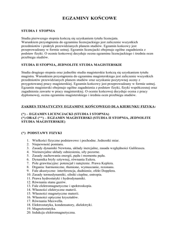 EGZAMINY KOŃCOWE STUDIA I STOPNIA Studia pierwszego stopnia kończą się uzyskaniem tytułu licencjata. Warunkiem przystąpienia do egzaminu licencjackiego jest zaliczenie wszystkich przedmiotów i praktyk przewidzianych planem studiów. Egzamin końcowy jest przeprowadzany w formie ustnej. Egzamin licencjacki obejmuje ogólne zagadnienia z podstaw fizyki. O ocenie końcowej decyduje ocena egzaminu licencjackiego i średnia ocen przebiegu studiów. STUDIA II STOPNIA, JEDNOLITE STUDIA MAGISTERSKIE Studia drugiego stopnia oraz jednolite studia magisterskie kończą się uzyskaniem tytułu magistra. Warunkiem przystąpienia do egzaminu magisterskiego jest zaliczenie wszystkich przedmiotów przewidzianych planem studiów oraz uzyskanie pozytywnej oceny z przygotowanej pracy magisterskiej. Egzamin końcowy jest przeprowadzany w formie ustnej. Egzamin magisterski obejmuje ogólne zagadnienia z podstaw fizyki, fizyki współczesnej oraz zagadnienia zawarte w pracy magisterskiej. O ocenie końcowej decyduje ocena z pracy dyplomowej, ocena egzaminu magisterskiego i średnia ocen przebiegu studiów. ZAKRES TEMATYCZNY EGZAMINU KOŃCOWEGO DLA KIERUNKU FIZYKA: (*) – EGZAMIN LICENCJACKI (STUDIA I STOPNIA) (*) ORAZ (**) – EGZAMIN MAGISTERSKI (STUDIA II STOPNIA, JEDNOLITE STUDIA MAGISTERSKIE) (*) PODSTAWY FIZYKI 1. Wielkości fizyczne podstawowe i pochodne. Jednostki miar. 2. Niepewność pomiaru. 3. Zasady dynamiki Newtona, układy inercjalne, zasada względności Galileusza. 4. Nieinercjalne układy odniesienia, siły pozorne. 5. Zasady zachowania energii, pędu i momentu pędu. 6. Dynamika bryły sztywnej, równania Eulera. 7. Pole grawitacyjne: potencjał i natężenie. Prawa Keplera. 8. Drgania: harmoniczne, tłumione, wymuszanie, rezonans. 9. Fale akustyczne: interferencja, dudnienie, efekt Dopplera. 10. Zasady termodynamiki, silniki cieplne, entropia. 11. Prawa hydrostatyki i hydrodynamiki. 12. Równania stanu gazów. 13. Fale elektromagnetyczne i spektroskopia. 14. Własności elektryczne materii. 15. Własności magnetyczne materii. 16. Własności optyczne kryształów. 17. Równania Maxwella. 18. Elektrostatyka, kondensatory, dielektryki. 19. Magnetostatyka. 20. Indukcja elektromagnetyczna. 21. Optyka geometryczna, odbicie i załamanie światła. 22. Interferencja i dyfrakcja światła. 23. Szczególna teoria względności, mechanika relatywistyczna. 24. Podstawy doświadczalne mechaniki kwantowej. 25. Postulaty mechaniki kwantowej, istota kwantowania. 26. Dynamika układu kwantowego. 27. Zagadnienie na wartości własne w teorii kwantów. 28. Układ okresowy pierwiastków a budowa atomów. (**) ELEMENTY FIZYKI WSPÓŁCZESNEJ 1. Zasady zachowania. 2. Zasada najmniejszego działania. 3. Postulaty klasycznej mechaniki statystycznej. 4. Postulaty kwantowej mechaniki statystycznej. 5. Termodynamiczny opis przejść fazowych. 6. III zasada termodynamiki na gruncie kwantowej mechaniki statystycznej. 7. Gazy doskonałe: Boltzmanna, Bosego i Fermiego. 8. Atom wodoru, widmo i jego struktura subtelna. 9. Atom w polu magnetycznym. 10. Spin cząstki i związane z nim efekty fizyczne. 11. Struktura subtelna linii widmowych atomów wieloelektronowych. 12. Metody przybliżone w mechanice kwantowej: rachunek zaburzeń. 13. Atomy i cząsteczki, powstawanie molekuł. 14. Układy wielu jednakowych cząstek, statystyki kwantowe. 15. Elektronowy i jądrowy rezonans paramagnetyczny. 16. Symetria kryształów i ich własności fizyczne. 17. Dynamika sieci krystalicznej. Fonony. Ciepło właściwe ciał stałych. 18. Własności fizyczne piezo-, piro- i ferroelektryków. 19. Własności fizyczne para-, dia- i ferromagnetyków. 20. Własności fizyczne półprzewodników. Domieszkowanie, złącza p-n. 21. Nadprzewodnictwo nisko- i wysokotemperaturowe. 22. Lasery i optyka kwantowa. 23. Przykładowe metody numeryczne rozwiązywania zagadnień fizycznych. 24. Zjawiska transportu: dyfuzja, lepkość, przewodnictwo cieplne i elektryczne. 25. Rozpraszanie, przekrój czynny. 26. Własności ciał stałych w ramach opisu kwantowego. 27. Własności i modele jąder atomowych. Przemiany jądrowe. 28. Kondensaty Bosego-Einsteina. (**) zagadnienia nadobowiązkowe 29. Własności fizyczne i budowa gwiazd 30. Modele ewolucji Wszechświata, czarne dziury. 31. Pola klasyczne i kwantowe. 32. Oddziaływanie elektromagnetyczne w teorii kwantów. 33. Cząstki elementarne i ich oddziaływania. 34. Przewodnictwo elektryczne ciał stałych. 35. Diamagnetyzm Landaua i paramagnetyzm Pauliego. 36. Metody numeryczne dla równania Schrödingera: dynamika i zagadnienie na wartości własne. 37. Metody numeryczne w mechanice statystycznej.