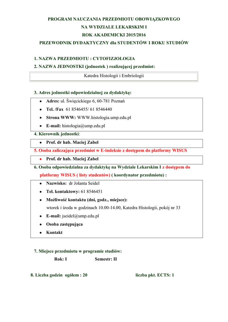PROGRAM NAUCZANIA PRZEDMIOTU OBOWIĄZKOWEGO NA WYDZIALE LEKARSKIM I ROK AKADEMICKI 2015/2016 PRZEWODNIK DYDAKTYCZNY dla STUDENTÓW I ROKU STUDIÓW 1. NAZWA PRZEDMIOTU : CYTOFIZJOLOGIA 2. NAZWA JEDNOSTKI (jednostek ) realizującej przedmiot: Katedra Histologii i Embriologii 3. Adres jednostki odpowiedzialnej za dydaktykę: Adres: ul. Święcickiego 6, 60-781 Poznań Tel. /Fax 61 8546455/ 61 8546440 Strona WWW: WWW.histologia.ump.edu.pl E-mail: [email protected] 4. Kierownik jednostki: Prof. dr hab. Maciej Zabel 5. Osoba zaliczająca przedmiot w E-indeksie z dostępem do platformy WISUS Prof. dr hab. Maciej Zabel 6. Osoba odpowiedzialna za dydaktykę na Wydziale Lekarskim I z dostępem do platformy WISUS ( listy studentów) ( koordynator przedmiotu) : Nazwisko: dr Jolanta Seidel Tel. kontaktowy: 61 8546451 Możliwość kontaktu (dni, godz., miejsce): wtorek i środa w godzinach 10.00-14.00, Katedra Histologii, pokój nr 33 E-mail: [email protected] Osoba zastępująca Kontakt 7. Miejsce przedmiotu w programie studiów: Rok: I 8. Liczba godzin ogółem : 20 Semestr: II liczba pkt. ECTS: 1 Jednostki uczestniczące w nauczaniu przedmiotu Semestr letni liczba godzin W Ć Ćwiczenia kategoria S Katedra Histologii i Embriologii 20 Razem: 20 9. Zakres wiedzy ( zgodnie z Rozporządzeniem Ministra Nauki i Szkolnictwa Wyższego z dnia 9 maja 2012 r. w sprawie standardów kształcenia dla kierunków Studiów: lekarskiego B.W12. charakteryzuje struktury I-, II-, III- oraz IV-rzędowe białek; zna modyfikacje potranslacyjne i funkcjonalne białka oraz ich znaczenie; B.W13. zna funkcje nukleotydów w komórce, struktury I- i II-rzędową DNA i RNA oraz strukturę chromatyny; B.W14. zna funkcje genomu, transkryptomu i proteomu człowieka oraz podstawowe metody stosowane w ich badaniu; opisuje procesy replikacji, naprawy i rekombinacji DNA, transkrypcji i translacji oraz degradacji DNA, RNA i białek; zna koncepcje regulacji ekspresji genów; B.W21. zna sposoby komunikacji między komórkami, a także między komórką a macierzą zewnątrzkomórkową oraz szlaki przekazywania sygnałów w komórce i przykłady zaburzeń w tych procesach prowadzące do rozwoju nowotworów i innych chorób; B.W22. zna procesy takie jak: cykl komórkowy, proliferacja, różnicowanie i starzenie się komórek, apoptoza i nekroza oraz ich znaczenie dla funkcjonowania organizmu; B.W28. zna mechanizmy starzenia się organizmu; B.W30. zna związek między czynnikami zaburzającymi stan równowagi procesów biologicznych a zmianami fizjologicznymi i patofizjologicznymi; B.W33. zna możliwości współczesnej telemedycyny jako narzędzia wspomagania pracy lekarza; 10. Umiejętności ( zgodnie z Rozporządzeniem Ministra Nauki i Szkolnictwa Wyższego z dnia 9 maja 2012 r. w sprawie standardów kształcenia dla kierunków Studiów: lekarskiego B.U6. przewiduje kierunek procesów biochemicznych w zależności od stanu energetycznego komórek; B.U11. korzysta z baz danych, w tym internetowych, i wyszukuje potrzebną informację za pomocą dostępnych narzędzi; 11. SYLABUS Na końcu przewodnika 12.Tematyka poszczególnych wykładów, ćwiczeń i seminariów Seminaria - Semestr letni Imię i nazwisko osoby prowadzącej zajęcia Tematyka seminariów Organella komórkowe. (B.W21; B.U11) Seminarium 1. Seminarium 9. Mitochondria, lizosomy, peroksysomy. (B.W21; B.U6; B.U11) Jądro komórkowe. Dziedziczenie. (B.W12; B.W13; B.W14) Cykl komórkowy i jego regulacja, starzenie się komórki, apoptoza. (B.W21; B.W22; B.W30; B.W28; B.U11) Adhezja, cząsteczki adhezyjne w rozwoju zarodkowym, nowotworach, w procesie zapalnym. (B.W21; B.W30; U11) Komunikacja międzykomórkowa – odbiór oraz przekazywanie sygnałów z udziałem receptorów. (B.W21; B.U11) Podstawy obrony immunologicznej. (B.W21; B.W30; B.U11) Kancerogeneza. Angiogeneza. (B.W21; B.W33; B.U11) Cytofizjologia śródbłonka i mięśnia sercowego. (B.W30; B.W33; B.U11) Seminarium 10. zaliczenie - test Seminarium 2. Seminarium 3. Seminarium 4. Seminarium 5. Seminarium 6. Seminarium 7. Seminarium 8. Izabela Pieścikowska Marcin Trejter Marcin Ruciński Jolanta Seidel Karolina Wojtowicz Marianna Tyczewska Agnieszka Malińska Patrycja SujkaKordowska Ludmiła Rafińska nauczyciele prowadzący zajęcia 13. Organizacja zajęć: Seminaria odbywają się w poniedziałki (grupy: 4,5,7,8) i w środy (grupy 1,2,3,6,9,10) Poniedziałki Środy SALA Gr. 4,5 – godz. 13.30- 15.00 Gr. 2,3 – godz. 11.30-13.00 A Grupa 4 Grupa 2 B Grupa 5 Grupa 3 SALA Gr.7,8 –godz. 15.00 – 16.30 Gr.6,9 – godz. 13.15 – 14.45 A Grupa 7 Grupa 6 B Grupa 8 Grupa 9 SALA Gr. 1,10 – godz. 15.00- 16.30 A Grupa 1 B Grupa 10 PLAN SEMINARIÓW Z CYTOFIZJOLOGII 2015/2016 PONIEDZIAŁEK ŚRODA SALA A SALA B 4, 7 5, 8 GRUPY DATA SEMINARIA GRUPY DATA SALA A SALA B 2,6,1 3,9,10 SEMINARIA 22.02.2016r. 1 2 24.02.2016r. 1 2 29.03.2016r. 2 1 02.03.2016r. 2 1 07.03.2016r. 3 4 09.03.2016r. 3 4 14.03.2016r. 4 3 16.03.2016r. 4 3 21.03.2016r. 5 6 23.03.2016r. 5 6 04.04.2016r. 6 5 06.04.2016r. 6 5 11.04.2016r. 7 8 13.04.2016r. 7 8 18.04.2016r. 8 9 20.04.2016r. 8 9 25.04.2016r. 9 7 27.04.2016r. 9 7 09.05.2016r. Sprawdzian końcowy 11.05.2016r. Sprawdzian końcowy Aktualny podział grupy studenckiej na stronie internetowej jednostki : www.histologia.ump.edu.pl REGULAMIN ZAJĘĆ: 1. Zajęcia odbywają się w II semestrze i prowadzone będą na sali ćwiczeniowej Katedry Histologii i Embriologii wg załączonego harmonogramu (strona www) 2. Na zajęcia studenci zobowiązani są opanować odpowiedni zakres materiału teoretycznego zgodnie z zamieszczonym harmonogramem. 3. Student jest zobowiązany do prowadzenia zeszytu, w którym na zakończenie każdych zajęć asystent wpisuje zaliczenie. Zajęcia zaliczane są na podstawie aktywności studenta. 4. Po zakończeniu seminariów studenci piszą sprawdzian końcowy (test 100 pytań) z całości przerobionego materiału. Sprawdzian końcowy można poprawiać dwukrotnie. 5. Studenci, którzy byli 
