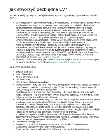 Jak stworzyć bezbłędne CV? Jest kilka wersji życiorysu, z których należy wybrać najbardziej odpowiedni dla siebie, m.in..: • Chronologiczny - podaje informacje o wykształceniu i doświadczeniu zawodowym w odwrotnym porządku chronologicznym zaczynając od ostatnio ukończonej szkoły/ostatniego miejsca zatrudnienia. Istotnymi informacjami są miejsca zatrudnienia oraz opisy obowiązków. Wersja życiorysu odpowiednia, kiedy stanowisko, o które się ubiegamy, jest podobne do zajmowanych wcześniej. • Funkcjonalny - kładzie nacisk na rodzaj i zakres kwalifikacji, a nie na tempo ich zdobywania. Zatem należy skoncentrować się na najważniejszych umiejętnościach i osiągnięciach. Polecany jest osobom, które przez długi okres pozostawały bez pracy bądź często zmieniały miejsce zatrudnienia. • Niekonwencjonalny (twórczy) - zalecany jest osobom ubiegającym się o stanowiska, na których kreatywność jest jednym z najważniejszych wymogów. Jedyną regułą przy tworzeniu takiego życiorysu jest jego oryginalność. Taką innowacyjną formą autoprezentacji jest VideoCV, czyli krótki dwuminutowy film ukazujący Ciebie, Twoje doświadczenie oraz pasje. Swoje Video CV możesz zamieścić na stronie: www.video-cv.prv.pl. • Europejski - proponowany jako obowiązujący w krajach UE. Wzór dokumentu jest dostępny na stronie internetowej: europass.cedefop.europa.eu. Co powinno zawierać CV? • • • • • • • • • • • • aktualne zdjęcie Imię i Nazwisko Adres, telefon, e-mail Cel zawodowy Określ swoje dążenia zawodowe. Wykształcenie - daty (od roku - do roku). Podaj najważniejsze szczeble edukacji w odwróconym porządku chronologicznym. Podaj nazwę szkoły, uczelni, wydział, specjalizację, uzyskany tytuł zawodowy. Dodatkowe kursy i szkolenia - daty (od roku - do roku). Uwzględnij przebyte kursy, szkolenia – są one dowodem Twojej aktywnej postawy, tym bardziej, jeżeli dotyczą stanowiska, o które się ubiegasz. Doświadczenia zawodowe - daty (od roku - do roku). Wymień wykonywane prace w odwróconym porządku chronologicznym. Wpisz nazwę firmy, zajmowane stanowisko, zakres obowiązków, podaj przykłady największych osiągnięć, projekty, nad którymi pracowałeś itp. Umieść również informacje o pracach niepełnoetatowych. Jeżeli starasz się o pierwszą pracę, uwzględnij także praktyki i staże zawodowe, prace dorywcze, wakacyjne i za granicą. Języki obce - wymień języki obce oraz określ stopień ich znajomości. Zawsze zaczynaj od języka, którym posługujesz się najlepiej. Uwzględnij kursy językowe, naukę języka za granicą oraz posiadane certyfikaty. Dodatkowe umiejętności Komputer – wylicz obsługiwane programy oraz języki programowania. Uwzględnij specjalistyczne kursy komputerowe. Prawo jazdy – wypisz odpowiednie kategorie, rok uzyskania, posiadanie • • • • samochodu. Inne – zaznacz umiejętność obsługi urządzeń biurowych, specjalistycznych maszyn, kasy fiskalnej itp. Zainteresowania - wymień zainteresowania zawodowe i pozazawodowe, tym bardziej jeżeli są one oryginalne. Staraj się je sprecyzować, nie używaj ogólników. Referencje - nie dołączaj referencji, lecz zadeklaruj chęć ich okazania (referencje dostępne na życzenie). Zastanów się, kto Ci może udzielić referencji. Klauzula o ochronie danych osobowych - Wyrażam zgodę na przetwarzanie moich danych osobowych w celach rekrutacji, zgodnie z Ustawą z dn. 29.08.1997 o ochronie danych osobowych (Dz.U. 2002r. Nr 101, poz. 926 ze zm.).
