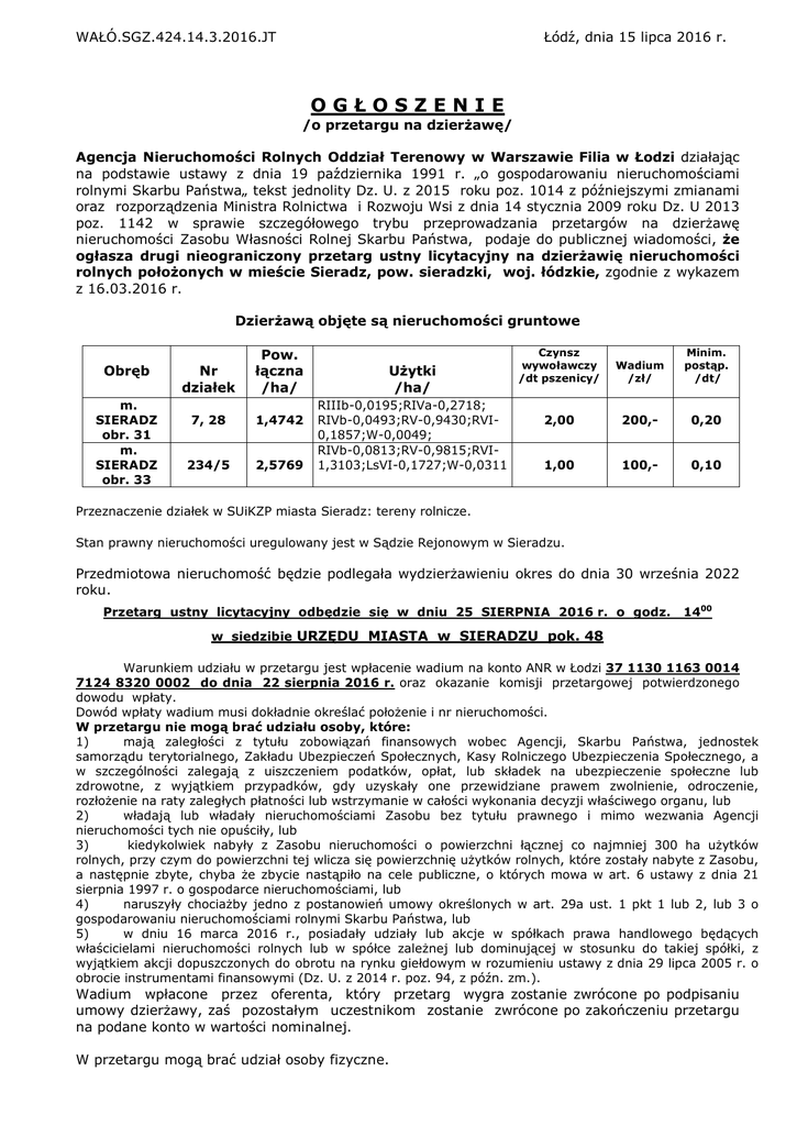 WAŁÓ.SGZ.424.14.3.2016.JT Łódź, dnia 15 lipca 2016 r. OGŁOSZENIE /o przetargu na dzierżawę/ Agencja Nieruchomości Rolnych Oddział Terenowy w Warszawie Filia w Łodzi działając na podstawie ustawy z dnia 19 października 1991 r. „o gospodarowaniu nieruchomościami rolnymi Skarbu Państwa„ tekst jednolity Dz. U. z 2015 roku poz. 1014 z późniejszymi zmianami oraz rozporządzenia Ministra Rolnictwa i Rozwoju Wsi z dnia 14 stycznia 2009 roku Dz. U 2013 poz. 1142 w sprawie szczegółowego trybu przeprowadzania przetargów na dzierżawę nieruchomości Zasobu Własności Rolnej Skarbu Państwa, podaje do publicznej wiadomości, że ogłasza drugi nieograniczony przetarg ustny licytacyjny na dzierżawię nieruchomości rolnych położonych w mieście Sieradz, pow. sieradzki, woj. łódzkie, zgodnie z wykazem z 16.03.2016 r. Dzierżawą objęte są nieruchomości gruntowe Obręb m. SIERADZ obr. 31 m. SIERADZ obr. 33 Nr działek Pow. łączna /ha/ 7, 28 1,4742 234/5 2,5769 Użytki /ha/ RIIIb-0,0195;RIVa-0,2718; RIVb-0,0493;RV-0,9430;RVI0,1857;W-0,0049; RIVb-0,0813;RV-0,9815;RVI1,3103;LsVI-0,1727;W-0,0311 Czynsz wywoławczy /dt pszenicy/ Wadium /zł/ Minim. postąp. /dt/ 2,00 200,- 0,20 1,00 100,- 0,10 Przeznaczenie działek w SUiKZP miasta Sieradz: tereny rolnicze. Stan prawny nieruchomości uregulowany jest w Sądzie Rejonowym w Sieradzu. Przedmiotowa nieruchomość będzie podlegała wydzierżawieniu okres do dnia 30 września 2022 roku. Przetarg ustny licytacyjny odbędzie się w dniu 25 SIERPNIA 2016 r. o godz. 1400 w siedzibie URZĘDU MIASTA w SIERADZU pok. 48 Warunkiem udziału w przetargu jest wpłacenie wadium na konto ANR w Łodzi 37 1130 1163 0014 7124 8320 0002 do dnia 22 sierpnia 2016 r. oraz okazanie komisji przetargowej potwierdzonego dowodu wpłaty. Dowód wpłaty wadium musi dokładnie określać położenie i nr nieruchomości. W przetargu nie mogą brać udziału osoby, które: 1) mają zaległości z tytułu zobowiązań finansowych wobec Agencji, Skarbu Państwa, jednostek samorządu terytorialnego, Zakładu Ubezpieczeń Społecznych, Kasy Rolniczego Ubezpieczenia Społecznego, a w szczególności zalegają z uiszczeniem podatków, opłat, lub składek na ubezpieczenie społeczne lub zdrowotne, z wyjątkiem przypadków, gdy uzyskały one przewidziane prawem zwolnienie, odroczenie, rozłożenie na raty zaległych płatności lub wstrzymanie w całości wykonania decyzji właściwego organu, lub 2) władają lub władały nieruchomościami Zasobu bez tytułu prawnego i mimo wezwania Agencji nieruchomości tych nie opuściły, lub 3) kiedykolwiek nabyły z Zasobu nieruchomości o powierzchni łącznej co najmniej 300 ha użytków rolnych, przy czym do powierzchni tej wlicza się powierzchnię użytków rolnych, które zostały nabyte z Zasobu, a następnie zbyte, chyba że zbycie nastąpiło na cele publiczne, o których mowa w art. 6 ustawy z dnia 21 sierpnia 1997 r. o gospodarce nieruchomościami, lub 4) naruszyły chociażby jedno z postanowień umowy określonych w art. 29a ust. 1 pkt 1 lub 2, lub 3 o gospodarowaniu nieruchomościami rolnymi Skarbu Państwa, lub 5) w dniu 16 marca 2016 r., posiadały udziały lub akcje w spółkach prawa handlowego będących właścicielami nieruchomości rolnych lub w spółce zależnej lub dominującej w stosunku do takiej spółki, z wyjątkiem akcji dopuszczonych do obrotu na rynku giełdowym w rozumieniu ustawy z dnia 29 lipca 2005 r. o obrocie instrumentami finansowymi (Dz. U. z 2014 r. poz. 94, z późn. zm.). Wadium wpłacone przez oferenta, który przetarg wygra zostanie zwrócone po podpisaniu umowy dzierżawy, zaś pozostałym uczestnikom zostanie zwrócone po zakończeniu przetargu na podane konto w wartości nominalnej. W przetargu mogą brać udział osoby fizyczne. Wadium nie podlega zwrotowi w przypadku, gdy: 1. żaden z uczestników przetargu ustnego nie zgłosi postąpienia ponad czynsz wywoławczy; 2. osoba, która przetarg wygra uchyli się od zawarcia umowy dzierżawy; 3. zawarcie umowy stanie się niemożliwe z przyczyn leżących po stronie oferenta, t.j. w szczególności nie uzyskania pisemnej zgody współmałżonka (w przypadku wspólności ustawowej) na dzierżawę nieruchomości, zgodnie z art.37 Kodeksu Rodzinnego i Opiekuńczego, bądź braku złożenia zabezpieczeń zapłaty należności wynikających z umowy dzierżawy, które to stanowią warunek zawarcia umowy. Dodatkowo uczestnicy przetargu, po zapoznaniu się z ogłoszeniem, przedmiotem przetargu oraz granicami nieruchomości, obowiązani są przedstawić Komisji Przetargowej: · Dokument stwierdzający tożsamość, · Stosowne pełnomocnictwo; (w przypadku uczestnictwa w przetargu pełnomocników uczestników przetargu, pełnomocnicy powinni okazać Komisji Przetargowej stosowne pełnomocnictwa), · Oświadczenie o zapoznaniu się z nieruchomością w terenie, projektem umowy dzierżawy zawierającym postanowienia, które nie podlegają ustaleniu w trybie przetargu, wymogami formalnymi zabezpieczeń należności oraz że nie zalegają wobec ANR z żadnymi płatnościami pod rygorem niedopuszczenia do przetargu · Potwierdzenie wpłaty wadium. Kandydat ustalony na dzierżawcę, celem zabezpieczenia kwoty należnej za 18-to miesięczny okres dzierżawy zobowiązany jest złożyć zabezpieczenie w postaci: ¾ złożenia weksli własnych in blanco przed zawarciem umowy dzierżawy. Projekt umowy dzierżawy i zarządzenia Prezesa ANR w sprawie zabezpieczenia należności są dostępne w siedzibie ANR w Łodzi, ul. Północna 27/29. Dzierżawa nieruchomości nastąpi wg danych ewidencyjnych, zgodnie z mapą ewidencyjną i wypisem z rejestru gruntów, wydanym przez Starostwo Powiatowe w Sieradzu. Kupujący oświadcza, że nie będzie występował z żadnymi roszczeniami wobec sprzedającego z tytułu ewentualnej niezgodności w zakresie rodzaju użytków oraz ewentualnej różnicy w powierzchni sprzedawanej nieruchomości, jeżeli po sprzedaży