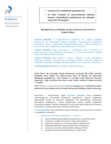 rozpoczynasz działalność gospodarczą? od dnia wydania Ci potwierdzenia nadania numeru identyfikacji podatkowej nie upłynęło więcej niż 18 miesięcy? Izba Skarbowa w Bydgoszczy SKORZYSTAJ Z BEZPŁATNEJ USŁUGI ASYSTENTA PODATNIKA Asystent podatnika to wyspecjalizowane stanowisko ds. wsparcia podatnika przeznaczone do indywidualnej obsługi podatników rozpoczynających działalność gospodarczą, którzy są jednocześnie mikroprzedsiębiorcami, a więc zatrudniają nie więcej niż 10 osób i osiągają obroty nieprzekraczające 2 mln EURO. Asystent podatnika będzie wspomagał ww. podatników przez 18 miesięcy od rozpoczęcia przez nich działalności gospodarczej tj. wydania potwierdzenia nadania numeru identyfikacji podatkowej (NIP). Asystent podatnika będzie działał w oparciu o jednolite w całej Administracji Podatkowej standardy i procedury tak, aby działać sprawnie, dostosować usługę do zidentyfikowanych potrzeb każdego mikroprzedsiębiorcy, który zwróci się o taką pomoc. Asystent podatnika funkcjonuje w każdym urzędzie skarbowym. Jeżeli chcesz, aby naczelnik urzędu skarbowego wyznaczył dla Ciebie asystenta podatnika, który będzie Cię wspierał przez okres 18 miesięcy od rozpoczęcia działalności gospodarczej – złóż wniosek, a w terminie 3 dni roboczych otrzymasz odpowiedź – imię i nazwisko oraz adres e-mail i numer telefonu Twojego asystenta w urzędzie. Wzór Wniosku o wyznaczenie asystenta podatnika dostępny jest w siedzibach urzędów skarbowych oraz zamieszczony na stronie internetowej każdego urzędu skarbowego. Korzystanie z indywidualnej opieki asystenta podatnika przez podatników rozpoczynających prowadzenie działalności gospodarczej zapewni podatnikom indywidualny dostęp do informacji niezbędnych dla prawidłowego realizowania obowiązków wynikających z prawa podatkowego, pomoże zapobiec popełnianiu ewentualnych błędów i omyłek wynikających z niewystarczającej znajomości przepisów, stosowanych w administracji reguł i procedur postępowania. Asystent podatnika służy podatnikowi ogólną informacją i wsparciem przede wszystkim w następujących obszarach : 1. Rozpoczęcia działalności gospodarczej – w zakresie: a) b) c) d) e) f) formy opodatkowania podatkiem dochodowym od osób fizycznych, zwolnienia z podatku od towarów i usług, limitu obrotów, właściwości miejscowej i rzeczowej organów podatkowych, składania dokumentów drogą elektroniczną (e-Deklaracje), stosowania oraz potwierdzenia profilu zaufanego ePUAP, uzyskania zaświadczenia lub informacji o nadaniu NIP, g) h) i) j) 2. Informacji podatkowej – w zakresie: a) b) 3. czynności wykonywanych przez urzędy skarbowe – z wykorzystaniem stosowanych kart usług/kart informacyjnych, uzyskiwania indywidualnej interpretacji przepisów prawa podatkowego. Rozliczenia podatku – w zakresie: a) b) c) 4. złożenia informacji o zgłoszeniu lub wycofaniu pełnomocnictwa, limitów dotyczących stosowania kas rejestrujących, uzyskania numeru ewidencyjnego dla kasy rejestrującej, uzyskania zwrotu kwoty wydatkowanej na zakup kasy rejestrującej, terminów składania deklaracji i informacji, terminów dokonywania wpłat podatków/zaliczek na podatek, numerów rachunków bankowych urzędu skarbowego. uzyskania zwrotu podatku od towarów i usług, zaliczenia wpłaty, nadpłaty lub zwrotu podatku na poczet zaległości podatkowych oraz bieżących i przyszłych zobowiązań podatkowych na wniosek podatnika, stwierdzenia nadpłaty podatku, uzyskania zwrotu nadpłaty podatku. Uzyskiwania zaświadczeń: zaświadczeń o niezaleganiu lub stwierdzającego stan zaległości podatkowych, b) zaświadczeń o dochodach, przychodach, obrotach, formach opodatkowania, c) innych zaświadczeń. a) 5. Innych zagadnień – m.in. w zakresie: a) b) c) d) e) f) zasad wnoszenia opłaty skarbowej, uzyskania ulg w spłacie zobowiązań lub zaległości podatkowych, uzyskania innych ulg przewidzianych przepisami prawa podatkowego, zastosowania instytucji „czynnego żalu”, obowiązków i praw podatnika w związku z kontrolą podatkową, udzielania ogólnych informacji o rodzajach spraw prowadzonych przez inne organy i ZUS w związku z prowadzoną działalnością gospodarczą