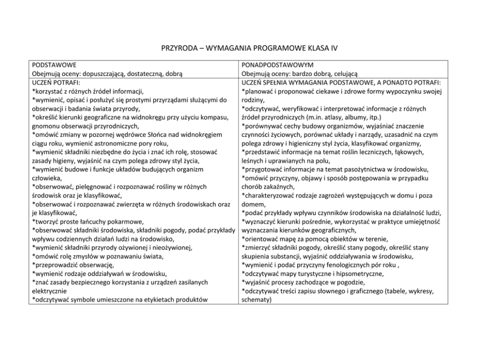 PRZYRODA – WYMAGANIA PROGRAMOWE KLASA IV