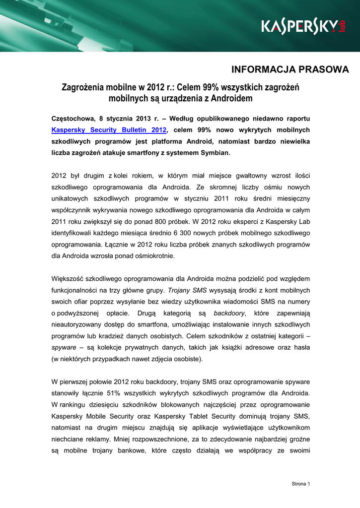 INFORMACJA PRASOWA Zagrożenia mobilne w 2012 r.: Celem 99% wszystkich zagrożeń mobilnych są urządzenia z Androidem Częstochowa, 8 stycznia 2013 r. – Według opublikowanego niedawno raportu Kaspersky Security Bulletin 2012, celem 99% nowo wykrytych mobilnych szkodliwych programów jest platforma Android, natomiast bardzo niewielka liczba zagrożeń atakuje smartfony z systemem Symbian. 2012 był drugim z kolei rokiem, w którym miał miejsce gwałtowny wzrost ilości szkodliwego oprogramowania dla Androida. Ze skromnej liczby ośmiu nowych unikatowych szkodliwych programów w styczniu 2011 roku średni miesięczny współczynnik wykrywania nowego szkodliwego oprogramowania dla Androida w całym 2011 roku zwiększył się do ponad 800 próbek. W 2012 roku eksperci z Kaspersky Lab identyfikowali każdego miesiąca średnio 6 300 nowych próbek mobilnego szkodliwego oprogramowania. Łącznie w 2012 roku liczba próbek znanych szkodliwych programów dla Androida wzrosła ponad ośmiokrotnie. Większość szkodliwego oprogramowania dla Androida można podzielić pod względem funkcjonalności na trzy główne grupy. Trojany SMS wysysają środki z kont mobilnych swoich ofiar poprzez wysyłanie bez wiedzy użytkownika wiadomości SMS na numery o podwyższonej opłacie. Drugą kategorią są backdoory, które zapewniają nieautoryzowany dostęp do smartfona, umożliwiając instalowanie innych szkodliwych programów lub kradzież danych osobistych. Celem szkodników z ostatniej kategorii – spyware – są kolekcje prywatnych danych, takich jak książki adresowe oraz hasła (w niektórych przypadkach nawet zdjęcia osobiste). W pierwszej połowie 2012 roku backdoory, trojany SMS oraz oprogramowanie spyware stanowiły łącznie 51% wszystkich wykrytych szkodliwych programów dla Androida. W rankingu dziesięciu szkodników blokowanych najczęściej przez oprogramowanie Kaspersky Mobile Security oraz Kaspersky Tablet Security dominują trojany SMS, natomiast na drugim miejscu znajdują się aplikacje wyświetlające użytkownikom niechciane reklamy. Mniej rozpowszechnione, za to zdecydowanie najbardziej groźne są mobilne trojany bankowe, które często działają we współpracy ze swoimi Strona 1 odpowiednikami z komputerów PC, czego najnowszym przykładem jest Carberp-in-theMobile. Platforma Android pozwala instalować aplikacje z niezaufanych źródeł, a jednym z gwarantowanych sposobów zafundowania sobie infekcji jest właśnie instalowanie oprogramowania z podejrzanych stron internetowych. Kolejnym niebezpiecznym trendem są szkodliwe aplikacje w oficjalnym sklepie Google Play – został on zapoczątkowany w 2011 roku i trwał również w 2012 roku mimo starań firmy Google ukierunkowanych na zmniejszenie aktywności cyberprzestępczej. Jednym z najbardziej niezwykłych przykładów mobilnego szkodliwego oprogramowania w 2012 roku była aplikacja Find and Call, która zdołała wślizgnąć się do Google Play oraz sklepu z aplikacjami firmy Apple. Najciekawsze interesujące przykłady oprogramowania według państwa mobilnego szkodliwego Stany Zjednoczone – FakeRun Trojan dla Androida o nazwie FakeRun był najszerzej rozpowszechniony w Stanach Zjednoczonych, ale występował także w innych krajach. Szkodnik ten nie kradnie danych osobistych użytkowników. Należy do ogromnej rodziny fałszywych aplikacji, które nie robią nic poza wyświetlaniem reklam przynoszących zyski oszustom. FakeRun bez problemu przeniknął do Google Play i nakłaniał użytkowników do ocenienia go na pięć gwiazdek oraz publikowania informacji na Facebooku, zanim jeszcze został uruchomiony. Jedyną rzeczą, jaką otrzymali użytkownicy, którzy skusili się na instalację tej aplikacji, były irytujące reklamy. Strona 2 Rosja – trojany wysyłające SMS-y na numery premium Rosyjski internet mobilny zalewają trojany SMS – szkodliwe programy wysyłające wiadomości na numery o podwyższonej opłacie, których główne działanie polega na kradzieży pieniędzy użytkowników. Na przykład trojan Opfake podszywa się pod skórę interfejsu, podczas gdy w rzeczywistości subskrybuje w imieniu użytkownika kosztowną zawartość premium. Niemcy – trojan Plangton Jednym z najpopularniejszych trojanów mobilnych w Europie jest Trojan.AndroidOS.Plangton.a. Dla niedoświadczonego właściciela smartfona jedynym dowodem istnienia tego szkodnika są pojawiające się od czasu do czasu reklamy oraz dziwne wpisy w sekcji zakładek przeglądarki internetowej Androida. Po infekcji trojan łączy się z serwerem kontroli i modyfikuje ulubione witryny po czym otwiera stronę, która naraża użytkowników na ryzyko stania się ofiarą oszustwa online. Pełny raport Kaspersky Security Bulletin 2012 jest dostępny w Encyklopedii Wirusów VirusList.pl prowadzonej przez Kaspersky Lab: http://www.viruslist.pl/analysis.html?newsid=730. Informację oraz raport można wykorzystać dowolnie z zastrzeżeniem podania firmy Kaspersky Lab jako źródła. Dalszych informacji udziela: Piotr Kupczyk Dyrektor biura komunikacji z mediami, Kaspersky Lab Polska [email protected] tel.: 0 801 000 215, (34) 368 18 14 tel. kom.: 518 935 846 Strona 3 Informacje o Kaspersky Lab Kaspersky Lab jest największą na świecie prywatną firmą tworzącą rozwiązania do ochrony punktów końcowych. Firma znalazła się w pierwszej czwórce producentów rozwiązań bezpieczeństwa punktów końcowych w klasyfikacji ogólnoświatowej*. Od 15 lat swojej działalności Kaspersky Lab pozostaje innowatorem w dziedzinie bezpieczeństwa IT i oferuje skuteczne rozwiązania bezpieczeństwa cyfrowego dla klientów indywidualnych, firm z sektora SMB oraz przedsiębiorstw. Obecnie firma działa w prawie 200 krajach na całym świecie, zapewniając ochronę ponad 300 milionom użytkowników. Polski oddział firmy istnieje od 2001 r. Więcej informacji można uzyskać na stronie www.kaspersky.pl. Facebook: http://www.facebook.com/KasperskyLabPolsk