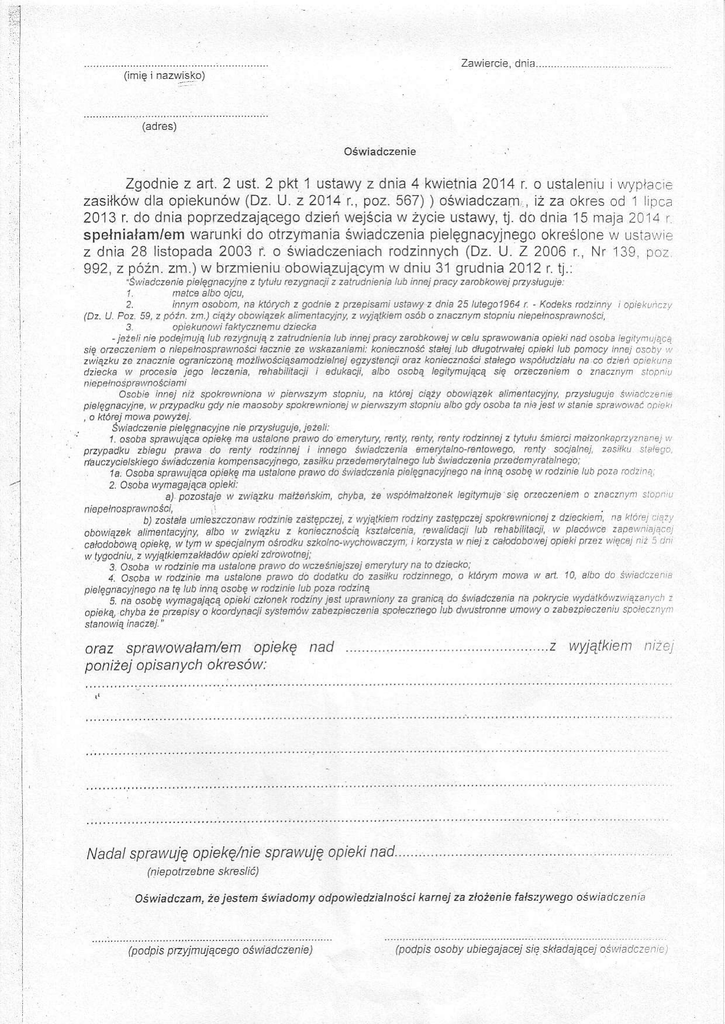 -r Z a w e r c i ed n i . . . . . . . . taores) oświadczenie a 0 1 4 r ' o u s t a l e n i uv ' r y o l a c , e z g o d n i ez a ń ' 2 U s t '2 p k t 1 U s t a w y Z d n i a 4k w j e t n i 2 z a s i ł k ó wd l a o p i e k u n ó W( D z . U ' z 2 0 1 4 | ' , p o z ' 5 6 7 )) o ś W i a d c z a ,mi Ż z a o k | e so d 1 i p c a W Zycje ustawy'tj' do dnia ]5 rr]a]a2C].]r 2013 r' da dnia poprzedzającegodzień Wejścia pie]ęgnacyjn-^g() okteś|one \^/ spełniałam/emWarunkido otrzymaniaśWiadczenia L]Sta!!. rodzinnych(Dz' 0' Z 2006 r' Nr 139. p.Ż: z dnia 28 listopada2003 |.'o śWiadczeniach W dniu 31 grudniaf012 r. L]'' 992, z póżn'zm ') W bŻmieniuobowiąZującym l .\ l I 's||iad.żenie pie]ęgnacyjne z tyt'łu rezy1naąiz zairudnienia lub hnel pftcyzarabkawej pżyjłjguje natcealba aicu i 2. inń|n ÓŚÓbon' na których f gÓdnie ż prfepiŚalni ustawy z dnla 25lute.]'1961r . KÓdeks rrjzinny ] rpr1łq.1| (Dz.U PÓż 39, f późn.zn') ciĄżyabÓwiązek alinentacyjny,f vlyjątkienosób Ófnacżnyń ŚtÓpnju hiepe]n.sprawnaś.r, 3 ÓbiekunÓł/i faklvcznemu dziecka .jeżelifje p.dejn)ją|ub .ezylinu]ąz zatrudnienialub inne)pra.y farÓbkÓfuej w Ćelusprawawaniaapiekinac Ósab] leg if.ljj1.? sję aŻeczenień Ó niepełnaspnwności |acznie ze vlskazaniam]: kaniecznÓść sta|ej lub d]ugatwałej apieki lub panÓcy ińhej a.ab! | zwiąfku ze znacznie ÓgfuhjĆfoną nÓżliwaściąsanadfielnej egfyś|encji araz krniecrnośEi stałega wspólu.]ziału na ĆĆ dzlen ..Iei|jl. dzieĆka w p|acasie jega lecfenja, ehab itac]i iedukacji, a]ba asabą legnynującą sję afeczenjen o fnacznyrn si.'nI Diep..ł|rÓspta\|naścianj aŚÓbie innej niż spakr.wniana ą pjeMszyn stapnij, na której ciąfy abÓ||iązek a]inentaryjny, pŻysłjguj. 'i|,j..].:Ż.|r|. pielęgnaĆyjne'wpżypa.]ku gdy nie maasahy sPakrewnianejwpieMszyń stÓpniualbÓ qł)yasÓba |a nt>iesLw siańie spre'ŃDw.ć.n|., ' Ó której nowa PÓwyże]' świa|lczenje pielęgnaĆyjne nie pzysłu|Ju]e' jezeh: '' 1 asaba sprawująCaopiekę ńa usta]aneprawa.]a enerytury,ren|y,ren|y,ren|y odzinneiz t'tuł|]śnicrcimałzarkapży|r.n.] f Bąty sacjaln.j 2a5lk' si.|.,.i,: ptypailku żb]egu p.awa do |enty ńdżjnnej i innega świa.leenia eńerylalnałentawega' nauĆfycjelskie1o śvr'iedĆfeniakanpensacyji]egr, zasi]k, plzedeńerytalnego lub świadĆzenlapżeden|ratalnega; pje!ęgnacyjnega na innąasabęw ołjzlne ||b p.fa |'dzrr.| 1a. osoba sprawują.'aopiekę na ustaloneprawÓ da ś,liadcżenia 2 o'aba rJ.".]a]ą d ap'el': ]c a) pofastaia w fv|,iąfku lnałżeńskim,chyba' fe wspó|naJżanekleqilynuje się or.€ c fenien Ó z|bcfr'^ N6 l|l,|.] ':|.,.) b) zÓstała unieszczÓnaw ra(lzinie za)tępcze], z wyjątkien |odziny zastępczej spakrcVłnEnejz dzie.kien a b o w i a f e k a | i n e n t a c y i 1 y , a | b Ó w z w i ą z k ' z k o n e c z n a s c i a l s z | a | . e n a ' r e i a l ( J a q ! ' ] u ' b r e h a t ) i l i h q i , w p l a c ó W c e z e p e i j i . ] 1.].,:|| ., 1 LÓż' sia v n Pj z c aladDbD 1ej apieki prez Ńięcć! .l;Ż ca/Ódo;Ó\|ą opiekę' |1].tyn W specja:nyn Óśradku sfkalnr v]l:nawsczln ' Ó ' | o d a v aaL, żdÓra'.' /.)god.'" f |yą'l]en 3 osoba Ń ńdzjnie ma uŚtalÓne prawa da fuĆześnEjszejeneryLury na ta dzięckÓ; 4, asoba w ra.]zjńiena Lstalane p|awa dó dÓdatk! da zasiłk\ rodzinneg., a klóry.ń mov|a w ań 1a' alba dÓ śI]ad.Z!,;. L g pÓ ą .. 1 a ć , Ó o ] ' a ' e ' ' b ' r Ą a o ' o o . r a a z ' r 9 b a a ! " ' Ó d | 1 a jeŚt uprawnianyfa granicąda śŃiadcfeniana Dakrycievda!kó,'jzv!qr.i,!.:i . opEA] czlanek rcdfiny s ni osótę winaealącą opieka, chyba ż; pEepisy a kaa|dynaĆji syŚteńfu zab-.zpjeĆżenia społecznear lub dwustronne umav,y Ó fabezpiecfełl! sp.i..Żł!ll . s|enawąinacżej ' ' ,y' j' q ' ' 't'k' zi e nr l l Z € i a r a z s p r a w o w a ł a m / eonp i e k ę n a d ' ' ' . . . ' ' ' . . ' ' ' ' ' ' ' . . ' . - . . ' ' . , , ' . , ' ' ' ' ' ' 'W poniżejopisanychah esó'A: sprawuję opiekinad''''''''..'.,,' opiekę/nie sprawuję Ndda| (niepatrf ebne s kresIić) karnejza ztażeniefalsj:Wego ośWiadczenĘ oświadcaan,ze jestem świac!anyadpowiedzialnaści (padpis przyjmującego oŚwiadczenie)