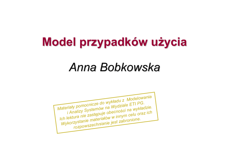 Model przypadków użycia Anna Bobkowska elowania d o M z u d do wykła e z TI PG. ic E n c le o ia m z o d p y Materiały y Systemów na W ści na wykładzie. i Analiz obecno je u oraz ich p ę t lu s e a c z m ie y an inn Ich lektur nie materiałów w nione. o r b a a z t t s s y z Wykor hnianie je c e z s w o p roz Diagram przypadków użycia • Pokazuje: – funkcjonalność systemu widzianą od zewnątrz, zbiór usług • Identyfikowani są: – aktorzy, przypadki użycia oraz powiazania i związki między nimi Przypadek użycia 1 Aktor 2 Aktor 1 Przypadek użycia 2 • Określa: – granice systemu: – użytkowników i inne systemy współpracujące z systemem aktorzy – funkcjonalność realizowana przez system: przypadki użycia Przypadek użycia 3 System Definicje • Model przypadków użycia - funkcjonalność z punktu użytkownika, system widziany jako „czarna skrzynka”. widzenia • Przypadek użycia (ang. use case) - (spójna) jednostka funkcjonalności dostarczana przez system, która jest realizowana jako ciąg interakcji pomiędzy aktorem a systemem. • Aktor (ang. actor) - abstrakcyjny użytkownik systemu, reprezentujący grupę rzeczywistych użytkowników o podobnych funkcjach i sposobie komunikacji z systemem; najczęściej aktor jest sprawcą zdarzenia powodującego uruchomienie przypadku użycia. • Powiązanie Aktor - Przypadek użycia (ang. association) - usługa określona przez przypadek użycia jest dostępna dla aktora, aktor i system komunikują się podczas realizacji przypadku użycia. • System lub obiekt (ang. Subject) posiada przypadki użycia Klasyfikacja aktorów • Aktor główny - korzysta z podstawowych funkcji systemu • Aktor drugorzędny - korzysta głównie z funkcji służących do realizacji zadań pomocniczych (np. administrowania i pielęgnacji systemu) • Aktor aktywny - inicjuje przypadek użycia • Aktor pasywny - nie inicjuje przypadku użycia, lecz tylko w nim uczestniczy • Aktor ożywiony – reprezentacja grupy ludzi • Aktor nieożywiony – system urządzenie • Aktor zewnętrzny – domyślnie • Aktor wewnętrzny – w modelowaniu biznesowym Związki pomiędzy przypadkami użycia • Zawiera (include) - w starszych wersjach używa (uses) – związek „A include B” oznacza, że w czasie wykonywania przypadku użycia A jest wykonywana także funkcjonalność zdefiniowana przez B • Rozszerza (extend) – „przypadek użycia C rozszerza przypadek użycia D”, gdy opcjonalnie (w określonych warunkach) do D zostaje włączone wykonanie funkcjonalności C , np. C uwzględnia nową sytuację wyjątkową nie obsługiwaną przez D. p k g zw ią zk i p... pk g zw ią zk i p... Do da n ie n ow e go produ k tu « i n cl u d e » S pra w d ze nie , c zy prod uk t is tnie j e Co n d i ti o n : W yb ó r za d a n i a P rze glą da nie lis ty za d a ń A rc hiw iza c j a d a nych « i n cl u d e » Wp ro w a dze n ie h a s ła a dm inis tra tora « e xte n d » • Uogólnienie (Aktor-Aktor) (Przypadek użycia-Przypadek użycia) Zm ia na s ta nu za da nia Metoda tworzenia diagramu przypadków użycia 1. Identyfikacja aktorów: – – – – – Kto komunikuje się z systemem ? Kto będzie korzystał z funkcji systemu ? Kto będzie system pielęgnował ? Jakie urządzenia system obsługuje ? (aktorzy nieożywieni) Z jakimi innymi systemami system się komunikuje? (aktorzy będący innymi systemami) – Kto lub co jest zainteresowane wynikami pracy systemu ? 2. Identyfikacja przypadków użycia • Dla każdego aktora odpowiedz na pytania: – jakiej funkcji aktor wymaga od systemu: czy aktor musi pamiętać, tworzyć, usuwać, modyfikować informacje w systemie? – czy aktor ma być powiadamiany o zdarzeniach w systemie, i na odwrót? • Rozważ, jakie są wejścia i wyjścia systemu 3. Opis przypadków użycia i aktorów 4. Iteracyjne uszczegółowienie modelu w wyniku analizy Przypadki użycia biznesowe i programowe ‘BIZNESOWE’ • Cel: pokazanie usług dostarczanych przez organizację • Granica: Usługi wykonywane przez ludzi, którzy mogą być wewnątrz systemu • Aktorzy wewnętrzni – użytkownicy systemu w danej organizacji ‘PROGRAMOWE’, „funkcjonalne” Cel: pokazanie wymagań względem systemu • Granica: Wewnątrz systemu tylko funkcjonalność oprogramowania (ewent. obsługiwanych urządzeń) Rezerwacja Zameldowanie Rejestracja zameldowania Recepcjonistka <<include>> Gość Rejestracja wymeldowania Recepcjonistka Płacenie Wymeldowanie <<include>> Sprzątaczka Pobieranie nr pokoju do sprz ątniecia Zaznaczenie do sprzątnięcia Sprzątnięcie pokoju Rejestracja s przątnięcia Sprzątaczka Przykład: Hotel Opis problemu Hotel Hilton przyjmuje gości. Recepcjonista rejestruje i wymeldowuje gości oraz pobiera opłatę. W hotelu jest wiele pokoi; sprzątają je pokojowe. Pokój może być wynajęty bezpośrednio przy przyjeździe gościa, jeżeli istnieją wolne pokoje. Gość płaci recepcjoniście przed wymeldowaniem. Pokój może być posprzątany dopiero po zwolnieniu. Pokój musi być sprzątnięty przed wynajęciem kolejnemu gościowi. Diagram przypadków użycia (biznesowy) Zameldowanie Gość Wymeldowanie Recepcjonista Sprzątnięcie pokoju Pokojowa Opis tekstowy przypadków użycia • Przypadek użycia: Zameldowanie OPIS TEKSTOWY Sposób postępowania podczas zameldowania gościa do pokoju PROCEDURA S1: Gość wchodzi do hotelu. S2: System sprawdza, czy Gość zarezerwował pokój. S3: Jeśli TAK, wtedy przejdź do S4. Jeśli NIE, system sprawdza, czy są wolne pokoje. Jeśli TAK, pokój jest rezerwowany dla Gościa; przejdź do S4. Jeśli NIE, przypadek jest kończony z komunikatem: BRAK MIEJSC. S4: Pokój jest przydzielony Gościowi. Do Recepcjonisty jest wysyłany komunikat PODAJ KLUCZ I KARTĘ. Gość otrzymuje klucz i kartę gościa. Opis tekstowy przypadków użycia • Przypadek użycia: Wymeldowanie S1: Gość przybywa do recepcji z zamiarem opuszczenia hotelu. S2: System 