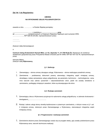 Zał. Nr 1 do Regulaminu UMOWA NA WYKONANIE USŁUG POLIGRAFICZNYCH zawarta w dniu ………….. w Rudzie Śląskiej pomiędzy: ……………………………… z siedzibą w ………………………., przy ul. ………………….., zarejestrowanym w Krajowym Rejestrze Sądowym pod numerem KRS: ……………….., NIP 526-00-29-262, reprezentowanym przez: ………… ………….. Zwanym dalej Zamawiającym a Centrum Usług Drukarskich Henryk Miler, ul. Ks. Szymały 11, 41-709 Ruda ŚI. Wpisanym do ewidencji działalności gospodarczej przez Prezydenta Miasta Chorzów pod Nr 5499, NIP 627-001-02-76, reprezentowanym przez: Henryka Milera Zwanym dalej Wykonawcą § 1. Definicje 1. Zamawiający – strona umowy zlecająca usługę, Wykonawca – strona realizująca przedmiot umowy. 2. Zamówienie – podstawowy dokument prawny stanowiący integralną część niniejszej umowy, określający rodzaj zamawianej usługi poligraficznej, jej parametry techniczno – technologiczne, cenę. Inne warunki oraz zakres uprawnień i odpowiedzialności stron, jeżeli nie zostały określone w zamówieniu, podlegają niniejszym zasadom, które są obowiązujące dla stron. § 2. Rodzaje zamówień 1. Zamawiający zleca a Wykonawca przyjmuje do wykonania usługę poligraficzną w zakresie drukowania i introligatorni. ……………………….. 2. Rodzaj i zakres usługi strony określą każdorazowo w pisemnym zamówieniu, o którym mowa w § 1 ust. 2 niniejszej umowy, złożonym przez Zamawiającego u Wykonawcy, stanowiącym integralną część niniejszej umowy. § 3. Przyjmowanie i realizacja zamówień 1. Zamówienie złożone przez Zamawiającego uważa się za przyjęte wtedy, gdy zostały potwierdzone przez Wykonawcę cena, warunki techniczne realizacji. 2. Podstawą rozpoczęcia prac związanych z wykonaniem czasopisma ………… będzie dostarczenie przez Zamawiającego plików w formie elektronicznej na konto Wykonawcy, odpowiednio ftp.cuddruk.pl dane do logowania : Użytkownik: …………. Hasło: ……………. Czas realizacji zamówienia ………….dni od dnia dostarczenia prawidłowych plików zgodnie z pkt 2 §3 . Pliki muszą być dostarczone do godziny 17:00 tj. do czasu możliwości weryfikacji. Przesuniecie terminu dostarczenia plików jednocześnie spowoduje przesunięcie odbioru gotowego nakładu. 3. Zamawiający przyjmuje na siebie pełną odpowiedzialność za treść publikacji przekazywanej Wykonawcy do realizacji. 4. Wykonawca zobowiązuje się do wykonania przyjętego zamówienia z należytą starannością wymaganą przy pracach właściwych dla charakteru produktu, zgodnie z wymogami ustalonymi przez strony. 5. Strony zobowiązują się do ścisłej współpracy w trakcie realizacji zamówienia w zakresie i czasie niezbędnym do prawidłowego wykonania zamówionej usługi. 6. Za termin wykonania zamówienia uważa się termin zgłoszenia przez Wykonawcę Zamawiającemu gotowości do odbioru zamawianego przez niego produktu lub dzień wysyłki kurierskiej. 7. Wykonawca nie ponosi odpowiedzialności za działalność żadnej z firm logistycznych. 8. Przyjęcie gotowego produktu przez Zamawiającego lub osobę trzecią działającą w jego imieniu na mocy stosownego pełnomocnictwa, odbywa się na podstawie dokumentu odbioru wystawianego przez Wykonawcę. §.4. Ceny i warunki płatności 1. Ceny kosztorysowe (kalkulacje wstępne) obowiązują przez okres 30dni od czasu przedstawienia Zamawiającemu i nie zawierają w sobie podatku VAT, kosztów transportu i ubezpieczenia. 2. Podatek Vat naliczany jest zgodnie z obowiązującymi przepisami. 3. Jeżeli w trakcie realizacji zamówienia nastąpiły zasadnicze zmiany warunków technicznych, a w szczególności objętość publikacji, nakład, gatunek papieru, dla których została ustalona cena, Wykonawca zobowiązany jest przekazać Zamawiającemu na piśmie nową cenę do jego akceptacji. Do czasu jej potwierdzenia przez Zamawiającego może wstrzymać dalszą realizację zamówienia. 4. Zamawiający zobowiązany jest pokryć koszty poniesione przez Wykonawcę związane z częściową realizacją zamówienia. 5. Wykonawca w dniu złożenia zamówienia wystawi fakturę zaliczkową celem wniesienia przez Zamawiającego zaliczki na poczet zamówienia. Wartość zaliczki to ……. PLN netto (słownie: …….). Zmiany w realizacji zamówienia wprowadzone na życzenie Zamawiającego mające wpływ na zwiększenie kosztów obciążają Zamawiającego. 6. Podstawę płatności za zamówienie stanowi faktura wystawiona Zamawiającemu przez Wykonawcę. Termin płatności obowiązujący we wszystkich zamówieniach to ……. dni od daty wystawienia faktury. Faktura ta uwzględni otrzymaną zaliczkę , o której mowa w pkt. 5 §4 niniejszej umowy . 7. Zamawiającemu zostanie wystawiona odrębna faktura na usługi kurierskie wg ilości wysłanych paczek pomnożone przez wartości określone w załączniku nr 1 niniejszej umowy. 8. Realizując usługi kurierskie Wykonawca dokona wysyłki wg listy wysyłek dostarczonej przez Zamawiającego najpóźniej w dniu złożenia zamówienia na poszczególny numer czasopisma . 9. Za datę zapłaty przyjmuje się datę wpływu należności na rachunek Wykonawcy. 10. W przypadku, gdy Zamawiający nie wywiązuje się z zobowiązań finansowych nałożonych na niego niniejszą umową, Wykonawca może wstrzymać realizację niewykonanej jeszcze części pracy i domagać się zapłaty za poniesione koszty. § 5. Reklamacje 1. Wykonawca ponosi odpowiedzialność za jakość i ilość dostarczonego do Zamawiającego przedmiotu umowy. Wybór sposobu załatwienia reklamacji należy do Zlecającego zgodnie z ustępem 6 i 7 niniejszego paragrafu. 2. Zamawiającego ponosi odpowiedzialność za jakość dostarczonych materiałów koniecznych do prawidłowej realizacji Zamówienia i niniejszej Umowy. Błędy i opóźnienia Wykonawcy wynikłe z ich niewłaściwej jakości nie obciążają Wykonawc