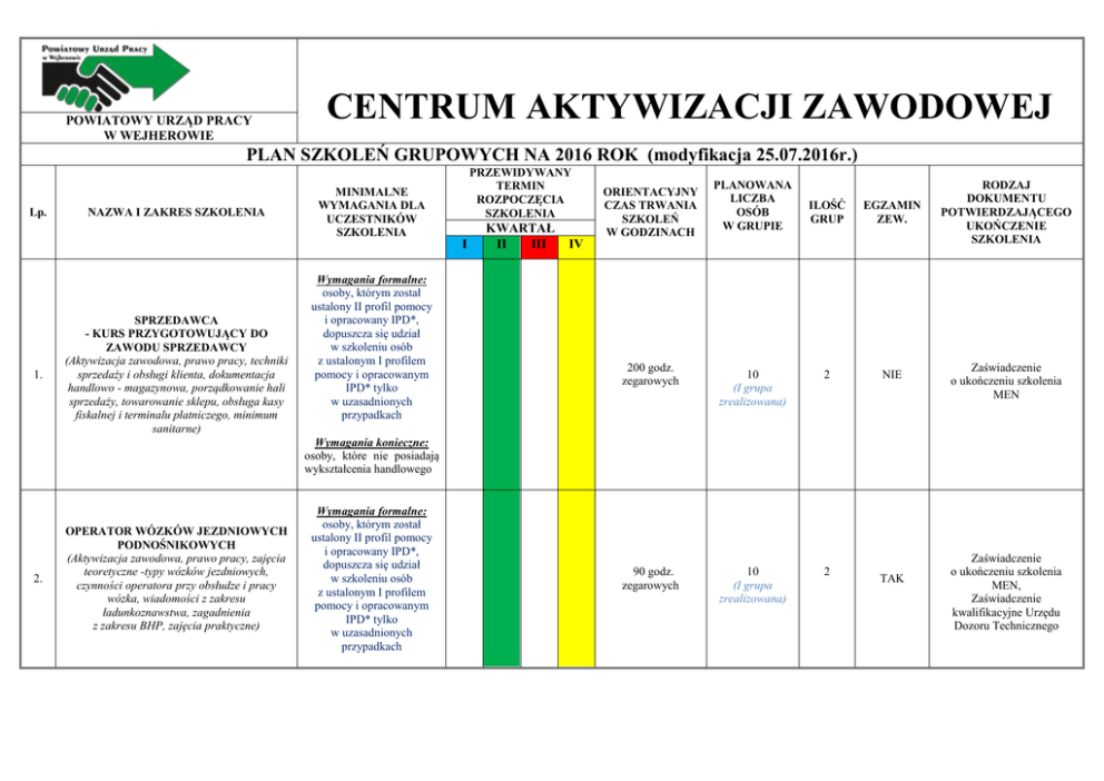 POWIATOWY URZĄD PRACY W WEJHEROWIE CENTRUM AKTYWIZACJI ZAWODOWEJ PLAN SZKOLEŃ GRUPOWYCH NA 2016 ROK (modyfikacja 25.07.2016r.) Lp. NAZWA I ZAKRES SZKOLENIA PRZEWIDYWANY TERMIN ROZPOCZĘCIA SZKOLENIA MINIMALNE WYMAGANIA DLA UCZESTNIKÓW SZKOLENIA I 1. SPRZEDAWCA - KURS PRZYGOTOWUJĄCY DO ZAWODU SPRZEDAWCY (Aktywizacja zawodowa, prawo pracy, techniki sprzedaży i obsługi klienta, dokumentacja handlowo - magazynowa, porządkowanie hali sprzedaży, towarowanie sklepu, obsługa kasy fiskalnej i terminalu płatniczego, minimum sanitarne) Wymagania formalne: osoby, którym został ustalony II profil pomocy i opracowany IPD*, dopuszcza się udział w szkoleniu osób z ustalonym I profilem pomocy i opracowanym IPD* tylko w uzasadnionych przypadkach KWARTAŁ II III ORIENTACYJNY CZAS TRWANIA SZKOLEŃ W GODZINACH PLANOWANA LICZBA OSÓB W GRUPIE ILOŚĆ GRUP EGZAMIN ZEW. RODZAJ DOKUMENTU POTWIERDZAJĄCEGO UKOŃCZENIE SZKOLENIA 10 (I grupa zrealizowana) 2 NIE Zaświadczenie o ukończeniu szkolenia MEN 10 (I grupa zrealizowana) 2 IV 200 godz. zegarowych Wymagania konieczne: osoby, które nie posiadają wykształcenia handlowego 2. OPERATOR WÓZKÓW JEZDNIOWYCH PODNOŚNIKOWYCH (Aktywizacja zawodowa, prawo pracy, zajęcia teoretyczne -typy wózków jezdniowych, czynności operatora przy obsłudze i pracy wózka, wiadomości z zakresu ładunkoznawstwa, zagadnienia z zakresu BHP, zajęcia praktyczne) Wymagania formalne: osoby, którym został ustalony II profil pomocy i opracowany IPD*, dopuszcza się udział w szkoleniu osób z ustalonym I profilem pomocy i opracowanym IPD* tylko w uzasadnionych przypadkach 90 godz. zegarowych TAK Zaświadczenie o ukończeniu szkolenia MEN, Zaświadczenie kwalifikacyjne Urzędu Dozoru Technicznego 3. OPIEKUN OSÓB ZALEŻNYCH Z J. NIEMIECKIM BRANŻOWYM W STOPNIU PODSTAWOWYM (Aktywizacja zawodowa, prawo pracy, fizjologia i anatomia człowieka, psychologiczne uwarunkowania pracy z osobami starszymi, zasady opieki nad osobami starszymi, żywienie oraz pielęgnacja, zasady udzielania pierwszej pomocy, ochrona zdrowia, pomoc społeczna) Wymagania formalne: osoby, którym został ustalony II profil pomocy i opracowany IPD*, dopuszcza się udział w szkoleniu osób z ustalonym I profilem pomocy i opracowanym IPD* tylko w uzasadnionych przypadkach 4. KUCHARZ – POMOC KUCHARZA (Aktywizacja zawodowa, prawo pracy, bhp, przygotowanie stanowiska pracy, czynności porządkowe, przechowywanie surowców i przygotowanie do obróbki wstępnej jaj, ryb, jarzyn, drobiu i dzikiego ptactwa, mięsa zwierząt rzeźnych i dziczyzny, podrobów, przygotowanie surówek, sałatek, potraw mlecznych, potraw z kaszy, potraw z mąki, potraw z jaj, obróbka termiczna produktów, jarzyn, sporządzenie zup i dodatków do zup ) Wymagania formalne: osoby, którym został ustalony II profil pomocy i opracowany IPD*, dopuszcza się udział w szkoleniu osób z ustalonym I profilem pomocy i opracowanym IPD* tylko w uzasadnionych przypadkach 5. KRAWIEC – POWRÓT DO ZAWODU (Aktywizacja zawodowa, prawo pracy, organizacja i obsługa stanowiska pracy, analiza budowy sylwetki ludzkiej klasycznej i sylwetek nietypowych, zasady konstrukcji i modelowania form odzieży, trendy mody, projektowanie ubiorów współczesnych, zajęcia praktyczne) Wymagania formalne: osoby, którym został ustalony II profil pomocy i opracowany IPD*, dopuszcza się udział w szkoleniu osób z ustalonym I profilem pomocy i opracowanym IPD* tylko w uzasadnionych przypadkach Wymagania konieczne: osoby, które posiadają wykształcenie o profilu odzieżowym lub doświadczenie w krawiectwie 200 godz. zegarowych 250 godzin zegarowych 300 godzin zegarowych 5 (I grupa zrealizowana II grupa w trakcie realizacji) 3 NIE Zaświadczenie o ukończeniu szkolenia MEN 10 (szkolenie zrealizowane) 1 NIE Zaświadczenie o ukończeniu szkolenia MEN 10 (w trakcie realizacji) 1 NIE Zaświadczenie o ukończeniu szkolenia MEN 6. 7. MONTER STOLARKI OKIENNEJ (Aktywizacja zawodowa, prawo pracy, BHP, maszynoznawstwo, materiałoznawstwo, technologia demontażu stolarki okiennej, techniki montażu stolarki okiennej, techniki obróbki okien, rysunek techniczny, kalkulacja kosztów, zajęcia praktyczne) UPRAWNIENIA ELEKTROENERGETYCZNE W GRUPIE I DO 1 KV – EKSPLOATACJA (Aktywizacja zawodowa, prawo pracy, podstawy elektrotechniki, ochrona przeciwporażeniowa w urządzeniach elektroenergetycznych, warunki techniczne budowy urządzeń elektrycznych, eksploatacja, przepisy i zasady eksploatacji linii do 1 kV, zasady organizacji pracy, zasady ratowania porażonych prądem elektrycznym oraz wytyczne dot. udzielania pierwszej pomocy przedlekarskiej, ochrona przeciwpożarowa, wiadomości z zakresu pomiarów) Wymagania formalne: osoby, którym został ustalony II profil pomocy i opracowany IPD*, dopuszcza się udział w szkoleniu osób z ustalonym I profilem pomocy i opracowanym IPD* tylko w uzasadnionych przypadkach Wymagania formalne: osoby, którym został ustalony II profil pomocy i opracowany IPD*, dopuszcza się udział w szkoleniu osób z ustalonym I profilem pomocy i opracowanym IPD* tylko w uzasadnionych przypadkach Wymagania konieczne: osoby, które posiadają wykształcenie elektryczne lub doświadczenie na stanowisku związanym z elektryką bądź pokrewne 300 godzin zegarowych 50 godzin zegarowych 5 (w trakcie realizacji) 1 NIE Zaświadczenie o ukończeniu szkolenia MEN 10 (I grupa zrealizowana) 2 TAK Świadectwo kwalifikacyjne, zaświadczenie o ukończeniu szkolenia MEN 8. 9. KWALIFIKOWANY PRACOWNIK OCHRONY FIZYCZNEJ (Aktywizacja zawodowa, prawo pracy, blok ogólnoprawny, zagadnienia dot. ochrony osób i mienia, wyszkolenia strzeleckiego, samoobrony i technik interwencyjnych) FRYZJER – POWRÓT DO ZAWODU (Aktywizacja zawodowa, prawo pracy, materiałoznawstwo, BHP, strzyżenie, modelowanie fryzur, farbowanie, układanie fal, nowinki we fryzjerstwie) Wymagania formalne: osoby, którym został ustalony II profil pomocy i opracowany IPD*, dopuszcza się udział w szkole